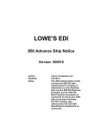 LOWE'S EDI 856 Advance Ship Notice Version: 004010 Author: Modified: Notes: Lowe's Companies, Inc. 9/21/2015 This 856 Implementation Guide includes the ASN EDI data requirements for all types of shipments to Lowe's facilities. Also use the ASN EDI Business Examples and the ASN EDI Best Practices documents on LowesLink to ensure your ASN data is accurate and timely. For FDC vendors, also reference the FDC EDI ASN Specifications Supplement on LowesLink. Lowe's Companies, Inc. Ship Notice/Manifest - 856 2 Table of Contents 856 Ship Notice/Manifest .................................................................................................................................. 3 ISA Interchange Control Header ...................................................................................................................... 8 GS Functional Group Header ....................................................................................................................... 10 ST Transaction Set Header ......................................................................................................................... 11 BSN Beginning Segment for Ship Notice - at Header Level .................................................................................... 12 HL Hierarchical Level - SHIPMENT DETAIL ...................................................................................................... 14 TD1 Carrier Details (Quantity and Weight) - at Shipment Level ............................................................................... 15 TD5 Carrier Details (Routing Sequence/Transit Time) - at Shipment Level ................................................................. 16 TD3 Carrier Details (Equipment) - at Shipment Level ........................................................................................... 17 REF Reference Identification - at Shipment Level ................................................................................................ 19 DTM Date/Time Reference - at Shipment Level .................................................................................................... 20 FOB F.O.B. Related Instructions - at Shipment Level ............................................................................................ 21 N1 Name - Ship From - at Shipment Level ....................................................................................................... 22 N3 Address Information - at Shipment Level .................................................................................................... 23 N4 Geographic Location - at Shipment Level ................................................................................................... 24 HL Hierarchical Level - ORDER DETAIL .......................................................................................................... 25 PRF Purchase Order Reference - at Order Level ................................................................................................. 26 REF Reference Identification - at Order Level ..................................................................................................... 27 DTM Date/Time Reference - at Order Level......................................................................................................... 28 N1 Name - Ship To - at Order Level................................................................................................................ 29 HL Hierarchical Level - TARE (PALLET) DETAIL ............................................................................................... 31 MAN Marks and Numbers for Tare (Pallet) Level .................................................................................................. 32 HL Hierarchical Level - ITEM DETAIL ............................................................................................................. 33 LIN Item Identification - at Item Level .............................................................................................................. 34 SN1 Item Detail (Shipment) - at Item Level......................................................................................................... 35 CTT Transaction Totals................................................................................................................................ 36 SE Transaction Set Trailer .......................................................................................................................... 37 GE Functional Group Trailer ........................................................................................................................ 38 IEA Interchange Control Trailer ..................................................................................................................... 39 X12V4010 9/21/2015 Lowe's Companies, Inc. 856 Ship Notice/Manifest - 856 3 Ship Notice/Manifest Functional Group=SH Purpose: This document includes the 856 Advance Ship Notice (ASN) data requirements for reporting all shipments to Lowe's stores, regional distribution centers (RDCs), and flatbed distribution centers (FDCs) for all purchase orders, including direct-to-Store, direct-to-DC, vendor prepared cross-dock purchase orders for RDCs, and FDC consignment purchase orders. For FDC vendors, also reference specific FDC EDI ASN requirements outlined in the FDC EDI ASN Specifications Supplement on www.loweslink.com, under the EDI tab. ORDER TYPES An ASN should be sent to Lowe's for these types of purchase orders: • stock orders, • consignment orders, • vendor prepared cross-dock orders (excluding EDI 856 ASN for FDC cross-dock shipments) Please reference Lowe's Partnership Manual for instructions on sending the manual ASN spreadsheet for both RDC and FDC vendor prepared cross-dock orders. This is required in addition to the EDI 856 ASN for RDC Vendor Prepared Cross-Dock Shipments. • free goods, • promotional orders, • display