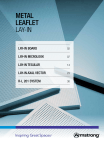 metal leaflet Lay-In LAY-IN Board 02 LAY-IN microlook 07 LAY-IN tegular 14 LAY-IN axal vector 23 R-L 201 SYSTEM 30 Metal product LAY-IN Board Square & rectangular tiles 3 :::: LAY-IN board SQUARE & RECTANGULAR TILES BENEFITS n Diversity of design and application n Easily assembled and fully demountable n Cost effective ceiling solution n Tiles are easily lifted out by hand, allowing full and easy access to the ceiling void. APPLICATION AREA n Used in a variety of ceiling areas: from small service rooms to large commercial office buildings and major transportation terminals. Specification System Armstrong ceiling system Board, Lay-In solution with visible grid 24 mm Perimeter solution Range of standards trims in steel and aluminium plus custom bulkheads available Tile material galvanised steel sheet 0.5 mm (aluminium or other materials on request) Service integration standard round or rectangular cut-outs plus customised options on request. Execution* square tile square edged with standard notching Standard modules 600 x 600 mm 625 x 625 mm 1200 x 600 mm Grid system tested modular system Prelude TLX 24 further suspension methods on request Coating RAL 9010 pure white post-coated powder painted visible surface, other RAL or NCS colours on request Gap solution 0 mm gap, without gasket Acoustic inlay Black non-woven acoustic fleece as standard. Other options available on request. * For further information about the edge detail execution of metal tiles, please see the Metal Edge Detail Execution datasheet standard perforation patterns Ultra Microperforation Rg 0501 Hole diameter: 0.5 mm Free area: 0.64 % Extra Microperforation Rg 0701 Hole diameter: 0.7 mm Free area: 1.5 % Microperforation Rd 1522 Hole diameter: 1.5 mm Open area: 22% Standard Perforation Rg 2516 Hole diameter: 2.5 mm Open area: 16% :::: 4 Acoustic Performance Colour Metal ceiling systems have been tested for their acoustic performance of sound absorption. All perforated products can be supplied with a variety of factory fitted acoustic infill options. Please contact us for more information. Standard colours RAL 9010 Global White RAL 9006 RAL 9007 20% gloss 12% gloss 30% gloss 30% gloss Thermal Conductivity (λ) W/mK 50.0 : Steel 0.04 : Acoustic fleece RAL 9010 Global White RAL 9006 RAL 9007 Special colours Other RAL and NCS colours available on request Humidity Exposure Up to 95% RH (for short term exposure). Quality Standard Services Integration Metal panels can be supplied with factory produced cut outs and apertures for the integration of building services equipment. Cleaning Dust should be removed from the painted surface by wiping with a clean soft cloth. More stubborn marks should be removed with a mild household detergent in warm water. Excessive use of water should be avoided. The use of abrasive cleaners of the painted surface is not recommended. Sustainability Armstrong is a certified EN ISO 9001:2008 Quality Assured Manufacturer. All Armstrong ceiling and grid systems are manufactured to the relevant tolerances and quality standards appropriate to material. Where differences exist between this and any expressed or implied architectural specificaitons or requirements then Armstrong’s manufacturing standards will prevail unless stated otherwise. Environmental Our metal panels have an average of up to 30% recycling content. Our European manufacturing plants are certified to: ISO 14001:2004 + Cor. 1:2009 Armstrong is a member of TAIM (Technical Association of Industrial Metal Ceilings). Acoustics Safe & Healthy % ISO 14021 Recycled content (%) Light reflectance (%) aw Sound absorption class NRC up to Dncw / Dnfw (dB) up to Rw (dB) up to Fire reaction Humidity Resistance (%) up to Cleanability up to Bioguard paint option Scratch resistance Ultra Microperforation Rg 0501 (1) up to 30 83 0.45(L) D 0.55 18 8 A1 95 scrubbable ✔ ✔ Extra Microperforation Rg 0701 (2) up to 30 80 0.55(L) D 0.65 21 10 A2-s2, d0 95 wipeable moist cloth (3) ✔ ✔ Microperforation Rd 1522 (2) up to 30 65 0.70 C 0.70 16 6 A2-s2, d0 95 wipeable moist cloth (3) ✔ Standardperforated Rg 2516 (2) up to 30 70 0.75(L) C 0.80 18 8 A2-s2, d0 95 wipeable moist cloth (3) ✔ Plain / Unperforated (1) up to 30 85 0.10(L) Not Classified 0.10 44 19 A1 95 scrubbable Premium B15 up to 30 depends on perforation 0.65 C 0.60 47 21 A2-s1, d0 95 wipeable moist cloth ✔ Premium OP19 up to 30 depends on perforation 1.00 A 0.90 31 15 A2-s2, d0 95 wipeable moist cloth ✔ ✔ (1) RAL 9010 colour, without acoustic inlay. (2) RAL 9010 colour, with black acoustic fleece glued on rear. (3) Wipeable moist cloth for preforated tiles with fleece. Scrubbable for plain tiles or perforated tiles without fleece. ✔ 5 :::: Cross-section BOARD Quick hanger Ceiling Void Cross Tee Board square/ rectangular tile Main Runner Cross Tee Visible side Perimeter trim max. M Longitudinal-section BOARD Quick hanger Ceiling Void Board square/ rectangular tile Perimeter trim M = module size / A = panel length / B = panel width Cross Tee Main Runner Visible side :::: 6 Detail A Board square tile Detail B Prelude 24 TLX grid option Detail C Prelude 15 TL grid option Prelude 24 Main Runner Prelude 15 Main Runner Prelude 15 TL Cross Tee Prelude 24 TLX Cross Tee For further information about the edge detail execution of metal tiles, please see the Metal Edge Detail Execution datasheet Detail D suspension methods Suspension wire Suspension angle Suspension hanger for T-bar Quick hanger Bent T-bar hanger with threaded rod Nonius hanger Metal product LAY-IN MicroLook Square & rectangular tiles BENEFITS n Diversity of design and application n Easily assembled and fully demountable n Cost effective ceiling solution n Tiles are easily lifted out by hand, allowing full and easy access to the ceiling void. APPLICATION AREA n Used in a variety of ceiling areas: from small service rooms to large commercial office buildings and major transportation terminals. Project: Barnet College (UK) :::::::: Archite