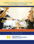 AEROSPACE ENGINEERING UNDERGRADUATE STUDIES AT THE UNIVERSITY OF MICHIGAN ENGIN.UMICH.EDU/AERO WELCOME M ichigan Aerospace is proud to be publicly named the first aeronautics program in the nation, established in 1914, just 11 years after the historic flights at Kitty Hawk. The first course was taught by Felix Pawlowski, who had been a student of Professor Lucien Marchis at the University of Paris in the first course in aeronautics given anywhere. Since then, the Department has graduated more than 4,000 aeronautical and aerospace engineers. Our alumni have gone on to distinguished careers in essentially all areas of the aerospace enterprise, in related fields, in government and in academia. We graduated individuals such as Kelly Johnson, the famous Lockheed Skunk Works designer of many innovative aircraft including the SR-71. Several astronauts were educated in our department, five were astronauts who orbited Earth. Three went to the moon. Michigan Aerospace is one of the most highly-ranked undergraduate and graduate aerospace engineering departments in the US, we provide a very vibrant environment of intellectual challenge and excitement that is at the same time collegial and conducive to higher learning. Our faculty members have a high level of enthusiasm and accessibility and a strong dedication to excellence in teaching our undergraduate and graduate students. Curriculum and research activities focus on fundamental and advanced topics organized within Gas Dynamics, Structures and Materials, Space Systems, and Dynamics and Control. Our world-class facilities are accessible to all Aerospace students for coursework and research activities. The University of Michigan has a distinguished heritage of student project teams engaging students at all levels, from first-year undergraduates to graduate students, which you will learn more about in this brochure. Prof. John Shaw ADVISING PROFESSOR LUIS BERNAL Undergraduate Advisor 3013 FXB lpb@engin.umich.edu (734) 764-3396 All in all, this is the place to be for your undergraduate studies and I look forwad to seeing you here. PROFESSOR JOHN SHAW Undergraduate Committee Chair Luis Berna al Bernal 3008 FXB jashaw@umich.edu (734) 764-3395 Professor and Undergraduate Advisor ALUMNI ASTRONAUTS LINDA WEISS Undergraduate Student Services Coordinator JAMES B. IRWIN (MS 1957, HSCD 1971) 3054A FXB lweiss@umich.edu (734) 764-3310 Astronaut support crew for Apollo 10, 12 and 15 JACK R. LOUSMA (1959, HSCD 1973) Astronaut support crews for the Apollo 9, 10, and 13 missions Edward White, Gemini 4, 1965 JAMES A. MCDIVITT (1959, HSCD 1965) Linda Weiss Gemini and Apollo programs. Command Pilot during the Gemini 4 flight EDWARD WHITE (MS 1959, HSCD 1971) First US space-walk on the Gemini 4 mission and served as back-up for Gemini 7 ALFRED WORDEN (MSE 1963, HSCD 1971) Command module pilot for the Apollo 15 lunar mission in 1971 #1 Public Aero Dept. According to U.S. News & World Report 303 Current Enrollment 10:1 Student-to-Faculty Ratio COMMUNITY Our students come from 25 states and 18 countries PROGRAM DESCRIPTION H ere at the University of Michigan, students in Aerospace Engineering begin with a set of courses that provide an exceptional background in all the fundamental aspects of the field. These span the entire spectrum of aerospace technologies, from aerodynamics and propulsion (collectively referred to as “gas dynamics”) to structural mechanics, flight dynamics and controls. GAS DYNAMICS COURSES Treat fluid and gas flow around bodies and through turbojet engines and rocket nozzles. Also involved is the study of large- and small-scale air motion in the atmosphere and its relationship to environmental and noise problems. Class of 2014 STRUCTURAL MECHANICS COURSES TAILOR YOUR DEGREEE Aircraft and spacecraft structures must be lightweight and endure significant loads in extreme environmental conditions while protecting the payload (passengers, instrumentation) and providing aerodynamic shape. Our courses address how to analyze and design such lightweight structures and how to size them for different loading conditions. The Aerospace Engineering program offers considerable flexibility. Students tailor the program to their own interests by choosing electives from advanced aerospace courses or from courses in a wide range of other technical areas. These include the following applications: FLIGHT DYNAMICS AND CONTROL SYSTEMS COURSES • Aerodynamics • Helicopters • Air vehicle systems • Rocket and spacecraft propulsion • Orbital dynamics and satellite control • Materials and advanced composites • Computer and information systems for aerospace vehicles Dynamic behavior of vehicles and systems as a whole, their stability and controllability both by human pilots and autonomous systems. These courses cover everything from the fundamentals to the design and construction of aircraft, spacecraft and other vehicular systems and subsystems. Integration of all this material takes place in the senior design course, which gives students an appreciation of the interrelation of the various areas of study in the design of an overall system. Students can select either aircraft or spacecraft design. WHEN DO I APPLY? GENERAL ADMISSIONS First-year students are not admiƩed directly to the Aerospace Engineering Department but to the University of Michigan and the College of Engineering. Students declare a major, typically in their second or third semester at Michigan. Students declaring Aerospace Engineering as their major are assigned a faculty advisor in the department. InformaƟon on admission for firstyear students, transfer students and internaƟonal students is available at admissions.umich.edu and engin. umich.edu/college/admissions/ undergrad 43% Students from outside of Michigan 30 Median ACT Score 2 BACHELOR’S IN 1 BACHELOR’S AND MASTER’S IN 5 Students can also choose a combined degree program that offers them two bachelor’s degrees, with the second of