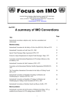 Focus on IMO International Maritime Organization, 4 Albert Embankment, London SE1 7SR, United Kingdom Tel: +44 (0)20 7735 7611 Fax: +44 (0)20 7587 3210 Contacts: Lee Adamson – Public Information Manager; Natasha Brown – Information Officer E-mail: ladamson@imo.org or nbrown@imo.org Web site: www.imo.org April 2001 A summary of IMO Conventions Page Title International conventions: adoption, entry into force, amendment and enforcement 3 Maritime safety International Convention for the Safety of Life at Sea (SOLAS), 1960 and 1974 8 International Convention on Load Lines (LL), 1966 25 Special Trade Passenger Ships Agreement (STP), 1971 27 Protocol on Space Requirements for Special Trade Passenger Ships, 1973 27 Convention on the International Regulations for Preventing Collisions at Sea (COLREG), 1972 28 International Convention for Safe Containers (CSC), 1972 32 Convention on the International Maritime Satellite Organization (INMARSAT), 1976 34 The Torremolinos International Convention for the Safety of Fishing Vessels (SFV), 1977 36 International Convention on Standards of Training, Certification and Watchkeeping for Seafarers (STCW), 1978 36 International Convention on Standards of Training, Certification and Watchkeeping for Fishing Vessel Personnel (STCW-F), 1995 46 International Convention on Maritime Search and Rescue (SAR), 1979 47 Marine pollution International Convention for the Prevention of Pollution from Ships, 1973, as modified by the Protocol of 1978 relating thereto (MARPOL 73/78) 1 50 International Convention Relating to Intervention on the High Seas in Cases of Oil Pollution Casualties (INTERVENTION), 1969 60 Convention on the Prevention of Marine Pollution by Dumping of Wastes and Other Matter (LDC), 1972 62 International Convention on Oil Pollution Preparedness, Response and Co-operation (OPRC), 1990 65 Protocol on Preparedness, Response and Co-operation to pollution Incidents by Hazardous and Noxious Substances, 2000 (HNS Protocol) 65 Liability and compensation International Convention on Civil Liability for Oil Pollution Damage (CLC), 1969 67 International Convention on the Establishment of an International Fund for Compensation for Oil Pollution Damage (FUND), 1971 70 Convention relating to Civil Liability in the Field of Maritime Carriage of Nuclear Material (NUCLEAR), 1971 73 Athens Convention relating to the Carriage of Passengers and their Luggage by Sea (PAL), 1974 74 Convention on Limitation of Liability for Maritime Claims (LLMC), 1976 75 International Convention on Liability and Compensation for Damage in Connection with the Carriage of Hazardous and Noxious Substances by Sea (HNS), 1996 76 International Convention on Civil Liability for Bunker Oil Pollution Damage, 2001 Other subjects Convention on Facilitation of International Maritime Traffic (FAL), 1965 80 International Convention on Tonnage Measurement of Ships (TONNAGE), 1969 83 Convention for the Suppression of Unlawful Acts Against the Safety of Maritime Navigation (SUA), 1988 84 International Convention on Salvage (SALVAGE), 1989 85 2 International Conventions The industrial revolution of the eighteenth and nineteenth centuries and the upsurge in international commerce which followed resulted in the adoption of a number of international treaties related to shipping, including safety. The subjects covered included tonnage measurement, the prevention of collisions, signalling and others. By the end of the nineteenth century suggestions had even been made for the creation of a permanent international maritime body to deal with these and future measures. The plan was not put into effect, but international co-operation continued in the twentieth century, with the adoption of still more internationally developed treaties. By the time IMO came into existence in 1958, several important international conventions 1 had already been developed, including the International Convention for the Safety of Life at Sea of 1948, the International Convention for the Prevention of Pollution of the Sea by Oil of 1954 and treaties dealing with load lines and the prevention of collisions at sea. IMO was made responsible for ensuring that the majority of these conventions were kept up to date. It was also given the task of developing new conventions as and when the need arose. The creation of IMO coincided with a period of tremendous change in world shipping and the Organization was kept busy from the start developing new conventions and ensuring that existing instruments kept pace with changes in shipping technology. It is now responsible for more than 40 international conventions and agreements and has adopted numerous protocols and amendments. Adopting a convention This is the part of the process with which IMO as an Organization is most closely involved. IMO has six main bodies concerned with the adoption or implementation of conventions. The Assembly and Council are the main organs, and the committees involved are the Maritime Safety Committee, Marine Environment Protection Committee, Legal Committee and the Facilitation Committee. Developments in shipping and other related industries are discussed by Member States in these bodies, and the need for a new convention or amendments to existing conventions can be raised in any of them. Normally the suggestion is first made in one of the committees, since these meet more frequently than the main organs. If agreement is reached in the committee, the proposal goes to the Council and, as necessary, to the Assembly. If the Assembly or the Council, as the case may be, gives the authorization to proceed with the work, the committee concerned considers the matter in greater detail and ultimately draws up a draft instrument. In some cases the subject may be referred to a specialized sub-committee for detailed consideration. Work in the committees and sub-committees is undertaken by the representatives of Member States of the Organization. The views and advice of intergovernmental a