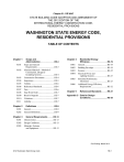 Chapter 51-11R WAC STATE BUILDING CODE ADOPTION AND AMENDMENT OF THE 2012 EDITION OF THE INTERNATIONAL ENERGY CONSERVATION CODE, RESIDENTIAL PROVISIONS WASHINGTON STATE ENERGY CODE, RESIDENTIAL PROVISIONS TABLE OF CONTENTS Chapter 1 R101 R102 R103 R104 R105 R106 R107 R108 R109 R110 R111 Scope and Administration ........................... RE-3 Scope and General Requirements ................................. RE-3 Alternate Materials—Method of Construction, Design or Insulating Systems ......................... RE-4 Construction Documents ................... RE-4 Inspections ........................................ RE-5 Validity ............................................. RE-6 Referenced Standards ........................ RE-6 Fees ................................................... RE-6 Stop Work Order ............................... RE-7 Board of Appeals .............................. RE-7 Violations .......................................... RE-7 Liability ............................................. RE-7 Chapter 4 R401 R402 R403 R404 R405 R406 Chapter 5 Residential Energy Efficiency .............................. RE-19 General ............................................ RE-19 Building Envelope ........................... RE-19 Systems ........................................... RE-25 Electrical Power and Lighting Systems ......................... RE-27 Simulated Performance Alternative ................................... RE-27 Additional Energy Efficiency Requirements ............................... RE-32 Referenced Standards ......... RE-37 Appendix C Exterior Design Conditions ............................. RE-39 Chapter 2 Definitions ............................... RE-9 R201 General .............................................. RE-9 R202 General Definitions ........................... RE-9 Chapter 3 General Requirements .......... RE-13 R301 Climate Zones ................................. RE-13 R302 Design Conditions ........................... RE-13 R303 Materials, Systems and Equipment ............................. RE-13 First Printing: March 2013 2012 Washington State Energy Code RE-1 (This page left intentionally blank) RE-2 2012 Washington State Energy Code CHAPTER 1 [RE] SCOPE AND ADMINISTRATION SECTION R101 SCOPE AND GENERAL REQUIREMENTS R101.1 Title. This code shall be known as the International Energy Conservation Code of the State of Washington, and shall be cited as such. It is referred to herein as "this code." R101.2 Scope. This code applies to residential buildings and the buildings sites and associated systems and equipment. This code shall be the maximum and minimum energy code for residential construction in each town, city and county. R101.3 Intent. This code shall regulate the design and construction of buildings for the effective use and conservation of energy over the useful life of each building. This code is intended to provide flexibility to permit the use of innovative approaches and techniques to achieve this objective. This code is not intended to abridge safety, health or environmental requirements contained in other applicable codes or ordinances. R101.4 Applicability. Where, in any specific case, different sections of this code specify different materials, methods of construction or other requirements, the most restrictive shall govern. Where there is a conflict between a general requirement and a specific requirement, the specific requirement shall govern. R101.4.1 Existing buildings. Except as specified in this chapter, this code shall not be used to require the removal, alteration or abandonment of, nor prevent the continued use and maintenance of, an existing building or building system lawfully in existence at the time of adoption of this code. R101.4.2 Historic buildings. The building official may modify the specific requirements of this code for historic buildings and require in lieu of alternate requirements which will result in a reasonable degree of energy efficiency. This modification may be allowed for those buildings or structures that are listed in the state or national register of historic places; designated as a historic property under local or state designation law or survey; certified as a contributing resource with a national register listed or locally designated historic district; or with an opinion or certification that the property is eligible to be listed on the national or state registers of historic places either individually or as a 2012 Washington State Energy Code contributing building to a historic district by the state historic preservation officer or the keeper of the national register of historic places. R101.4.3 Additions, alterations, renovations or repairs. Additions, alterations, renovations or repairs to an existing building, building system or portion thereof shall conform to the provisions of this code as they relate to new construction without requiring the unaltered portion(s) of the existing building or building system to comply with this code. Additions, alterations, renovations or repairs shall not create an unsafe or hazardous condition or overload existing building systems. An addition shall be deemed to comply with this code if the addition alone complies or if the existing building and addition comply with this code as a single building. Exception: The following need not comply provided the energy use of the building is not increased: 1. Storm windows installed over existing fenestration. 2. Glass only replacements in an existing sash and frame. 3. Existing ceiling, wall or floor cavities exposed during construction provided that these cavities are filled with insulation. 2x4 framed walls shall be insulated to a minimum of R-15 and 2x6 framed walls shall be insulated to a minimum of R-21. 4. Construction where the existing roof, wall or floor cavity is not exposed. 5. Reroofing for roofs where neither the sheathing nor the insulation is exposed. Roofs without insulation in the cavity and where the sh