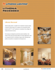 Lithonia Recessed Lithonia Lighting offers a complete line of residential recessed products to meet the varying needs of our customers. The recessed line offers products with 3”, 5” and 6” apertures in incandescent, low voltage and compact fluorescent sources. Our housings are designed to provide the easiest installation in the industry while requiring the fewest SKUs for standard applications. All of our recessed trims offer a full reflector design, which maximizes lamp position and provides an exceptional overall appearance. 246 Lithonia Recessed / PSG8 www.lithonia.com CONTENTS Incandescent Recessed 6" Aperture 5" Aperture 3" Aperture 248 259 261 Low Voltage Recessed 3" Aperture 263 Fluorescent Recessed 6" Aperture 266 Specialty Remodelers Damp Location Steplights Lensed Squares 268 269 270 Technical Information Options and Accessories Packaging Lamp Performance www.lithonia.com 271 272 273 Lithonia Recessed / PSG8 247 Incandescent Recessed IC/Non-IC Premium Housing 6" Incandescent – IC-Rated Full Reflectors All trims are damp location listed. Lensed trims are wet location listed. Lamp types and maximum wattages are listed for each trim. Premium Trims Open Reflector 6O1 6O1PB Baffle White Polished Brass 6B1 6B1W Deep Baffle Black White 6B2 6B2W 6B1BL/PB Black (P.Brass finish) Black White 6B2BL/PB Black (P.Brass finish) 40 A19 65 BR30 65 BR40 75 PAR30 75 PAR38 LC6 40 A19 65 BR30 75 PAR30 65 BR30 75 PAR30 Standard Eyeballs Open 6E1 White 6E1PB P. Brass 6B1 Intended Use Recessed housing rated IC or Non-IC for New Construction applications. Approved for all ceiling types except air-handling plenums. Features Aluminum housing for superior thermal performance for a wider range of trims. Approved for direct burial in insulation and for through-branch circuit wiring. Injection-molded thermal plastic frame and J-box; Romex only. Not for pulling wires. Factory-installed captive bar hangers span 24" and feature built-in nailers and T-bar clips. J-box features poke-home wire connectors, built-in Romex clamps and ground wire. Socket clips to reflector to insure proper and consistent lamp position. Suitable for ceilings up to 2-3/4" thick. Product ships in resale packs of six only. Damp location listed. (See trim selection for wet location listed trims.) UL listed to US and Canadian safety standards. Ordering Information Series LC6 Example: LC6 AT Regressed Eyeballs Baffled 6E2 Wh./Bl. Baf. 6E2W Wh./Wh. Baf. Open 6RE1 6RE1W 6E2PB P. Brass/Bl. Baf. 6RE1BL/PB P. Brass/Bl. Baf. 6RE2BL/PB P. Brass/Bl. Baf. 65 BR30 75 PAR30 Wh./Bl. Baf. Wh./Wh. Baf. 65 BR30 75 PAR30 Baffled 6RE2 6RE2W 65 BR30 75 PAR30 Wh./Bl. Baf. Wh./Wh. Baf. 65 BR30 75 PAR30 Standard Trims Open Narrow Flange 7O2 White 7O2PF WhitePlastic Flange 7O2A Clear Diffuse 7O2G Gold Diffuse 7O2AZ Clear Specular 7O2GZ Gold Specular 7O2BLZ Black Specular Baffle Wide Flange 7O3 White Narrow Flange 7B2 Black 7B2W White 7B2WPF White Plastic Flange Options AT NOM LRC Aluminum tape seals housing to minimize airflow through rough-in. Complies with WSEC and ASTM E283 requirements. NOM Certified (consult factory). Compatible with Lithonia Reloc System. Reloc System can be installed less this option with connectors provided by others. 65 BR30 75 PAR30 65 BR30 75 PAR30 Wallwash Eyeballs 7E1 Standard ** Metal flange standard. Plastic flange on lens trims may be required for use above motorized tubs or spas. For plastic flange, add suffix PF to catalog number (Example: CLF1 PF). 7RE1 65 BR30 75 PAR30 IMPORTANT: Housings and trims are packaged and shipped as separate components. For details on ordering and packaging options, see page 272. Regressed 12" White 40 A19 Pinhole CS1 White 40 A19 50 R20 50 PAR20 Polycarbonate Lenses (Shower/Closet) Flush CLF1** CLF2** 9-1/4" CW1 65 BR30 50 PAR30 Standard Trims Premium Trims 15-1/4" 65 BR30 75 PAR30 Opal Prismatic Drop CLD1** CLD2** Opal Prismatic Drop 7LD1 Drop, Plastic Flange 7LD1 PF Opal 7LD2 PF Prismatic Opal 13-1/2" 6-7/8" 40 A19 248 Lithonia Recessed / PSG8 www.lithonia.com keyword: LC6 40 A19 40 A19 40 A19 Incandescent Recessed Non-IC-Rated Full Reflectors – All trims are damp location listed. Lensed trims and WETliteTM are wet location listed. Lamp types and maximum wattages are listed for each trim. Premium Trims Open Reflector 6O2 6O2A 6O2G 6O2SA 6O2SG White Clear Specular Gold Specular Clear Diffuse Gold Diffuse Premium Baffle With Diffuse Upper Reflector 6B3 Black 6B3W White Premium Baffle With Narrow Flange 6B4 Black 6B4W White Specular Cone With Diffuse Upper Reflector 6C3A 6C3G 6C3BL Clear Gold Black 75 A19 120 BR40 150 PAR38 100 A19 120 BR40 150 PAR38 Pinhole 6S1 White 60 A19 50 R20 50 PAR20 75 PAR30 100 A19 150 BR40 150PAR38 100 A19 120 BR40 150 PAR38 BR/PAR30 Adjustable With Specular Cone 6AC1A Clear 6AC1G Gold 6AC1BL Black BR/PAR30 Adjustable With Baffle 6AB1 Black 6AB1W White 65 BR30 75 PAR30 6W1 White 65 BR30 75 PAR30 Flush 6LF1* 6LF2* Opal Prismatic 60 A19 Open Reflector 7O5 7O5PF 7O5A 7O5G 7O5AZ 7O5GZ 7O5BLZ White White Plastic Flange Clear Diffuse Gold Diffuse Clear Specular Gold Specular Black Specular 6W2 6W2W Black White 100 A19 100 A19 Glass Lenses Polycarbonate Lenses (Shower/Closet) Drop 6LD1* 6LD2* Baffled Wallwash Wallwash Drop Opal 6LD3 White Splay 6LDB3 Black Baffle Opal Prism 60 A19 75 A19 Baffle Fresnel 6L4 6LB4 White Splay Black Baffle White Splay Black Baffle 75 A19 75 A19 WETlite™ Wallwash 7B5 Black 7B5W White 7B5WPF White Plastic Flange 120 BR40 120 PAR38 Flush White 6LF3 6LFB3 7W1 120 BR40 120 PAR38 6H2O White White (Ships with outdoor rated 75W PAR38 lamp) 75 PAR38 75 PAR30 60 A19 6-1/8" 7-5/8" * Metal flange standard. Plastic flange on lens trims may be required for use above motorized tubs or spas. For plastic flange, add suffix PF to catalog number (Example: 6LF1 PF). www.lithonia.com keyword: LC6 Lithonia Recessed / PSG8 249 Incandescent Recessed IC/Non-IC Standard Housing 6" Incandescent – IC-Rated Full Reflectors All trims are damp location listed. Lensed t