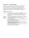 Chemistry 111 – Laboratory Policies The chemistry lab is a rich learning environment that also contains some hazards. We will do our best to learn a lot, be safe, and have “fun” during our warm spring afternoons/evenings. Chemistry 111 laboratory consists of an introductory exercise and experiments selected to demonstrate a variety of chemical concepts and laboratory techniques. Preparation for laboratory exercises will require some time – at least one hour before lab! Your complete record of each experiment, including the written procedure, will be entered into your laboratory notebook. Laboratory Policies & Conduct Attendance: • You must attend every lab on your assigned day. No substitutions will be allowed without prior approval from the instructor (which is a RARE event). • Do not skip a week of lab. You may only make up a lab missed due to illness or other approved reason. There are not many opportunities for make-up labs in summer quarter. Chemicals, Cleanliness, Materials, & Practice: 1. Do not pour any chemical down the sink without checking first. We will usually have waste disposal bottles available on the center island. If you are not sure, ASK! 2. Recap all bottles after YOU use them. If you do not, there may be cross contamination between bottles. 3. Clean up any spillage on bench tops, floor and around balances IMMEDIATELY. 4. Do not take reagent bottles to your desk. 5. Never put extra chemicals back in the stock bottle. 6. Do not weigh reagents directly on the balance pans. Use weigh paper, beaker or other container. Keep the balance area clean. 7. NEVER place anything directly into the reagent bottles. Only exception to this rule, a dropper that came with the bottle. 8. Before you leave lab, wash your lab ware and lock it in your drawer. Make sure your bench area must be clean and turn off the computer. 9. If you are not sure how to do something, ASK! The Laboratory Notebook Your laboratory notebook is a complete record of your work in Chemistry 111 laboratory. It is used to write out experimental procedures prior to beginning experiments, to record observations and data in the laboratory, to complete all calculations, and to create a report on the results of each experiment. All written work connected with Chemistry 111 laboratory must be done in your notebook. The laboratory notebook must be permanently bound, not loose leaf or spiral. The pages should be lined (or graph) and preferably numbered. If you purchase a notebook with unnumbered pages, you must number each page before using the notebook in lab. Notebooks must be done in ink, not pencil. Record data directly in your notebook, never on loose pieces of paper for later transcription. If an incorrect entry is made, it should be crossed out with a single line which does not obliterate the entry, and the correction made next to or above the crossed out entry. Never write over a number; later it may be impossible to determine which number was correct. Do not crowd data in your notebook; entries should be well spaced and clearly labeled. Pages should never be torn out of a scientific notebook; if you wish to have a page disregarded draw a single diagonal line across it. Save the first page of your notebook for a Table of Contents and keep it up to date. This means that lab work should start on page 3. As you prepare your notebook, allow sufficient pages for data, calculations, and summary of results. The report must be placed on the right hand pages only. Blank left hand pages allow a convenient place for data if the experiment must be repeated. Finally, you should date procedure sections and data as these entries are made in your notebook. What to put in your lab notebook. FRONT COVER Write your name, the course number, and your lab section clearly on the front cover of your lab notebook. INSIDE COVER At the top of the inside the front cover, you will record your lab drawer number, buret number, and balance number. Reserve the rest of the inside cover for your laboratory safety map. PAGE 1 - TABLE OF CONTENTS You are required to use Page 1 of your notebook for the table of contents. As you prepare for lab each week, record the experiment number, experiment title, and the page number of each experiment. The figure shows a sample from several years ago. We will record the drawer number on the inside cover, not on this page. LABORATORY EXPERIMENTS The rest of your notebook is where you record information about your experimental work. Each experiment in your notebook should have six sections described below. 1. Title of the Experiment 2. Purpose A brief statement of the purpose of the experiment. 3. Procedure This is a step-by-step account of every operation in the experiment. It should be detailed enough that the entire experiment can be carried out without using other sources; it will be your only reference during the experiment. A balanced chemical equation should be included for any step which involves a chemical reaction. You are not required to copy steps for data analysis at the computer, only “wet” chemistry work. 4. Pre-lab Exercises (if required) Refer to the individual lab handout to see if there is a pre-lab assignment. Answer all questions (show your work for computations) in your lab notebook, then copy the results to the pre-lab page to turn in. 5. Data All measurements and other observations should be directly recorded in this section. Where possible, data should be tabulated for easy future reference. In all cases, data must be clearly labeled so their meaning will be obvious to any reader of the notebook. Also be sure to date all data entries in your notebook. The sample to the right is one option for arranging your data. Note how mistakes are corrected with a single line – not scratched out. 6. Results In this section, the final results are calculated from the experimental data. For experiments involving quantitative analyses, results for each individual determination as well as a me