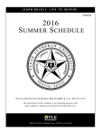 LEARN BOLDLY. LIVE TO INSPIRE. 7/8/2016 2016 S UMMER S CHEDULE O FFICE OF R EGISTRATION AND R ECORDS : 830‐372‐8040 ● F AX : 830-372-8179 The information in this schedule is for planning purposes only and is subject to change at the discretion of the university. 1000 W. Court St. ● Seguin, Texas 78155 ● www.tlu.edu TEXAS LUTHERAN UNIVERSITY SUMMER 2016 GENERAL INFORMATION Class Offerings – TLU offers 3 summer terms, May Term, Summer A, and Summer B. The terms begin in May and continue through August. Registration and meeting dates for each term are listed below and in the academic calendar. Texas Lutheran University reserves the right to set a minimum enrollment for a course to be held. The schedule is subject to change without notice at the discretion of the university. Tuition– Tuition is $350 per semester hour. There are no student fees. Tuition for independent/directed studies and internships is $350 per course. Payment ‐ Students who register in April for summer courses will receive a billing statement reflecting charges and available financial aid credits for summer terms. For students who preregister in April, payment must be made in full for ALL summer terms by May 11th. Students who register after the April registration dates or in June/July will be required to pay in full for courses on the day they register. Registration for Current TLU Students – Currently enrolled TLU students should register for summer courses during preregistration, April 11‐15, or during makeup registration, April 27‐28. Check‐in/Schedule Confirmation for Current TLU Students – Students must confirm their registration in the Office of Registration & Records on the first day of class of each term in which they are registered or they will be assessed a $50 cancellation charge as a “no‐show.” Registration for Transient Students – Students who are currently attending another institution and plan to attend TLU only for summer terms should submit a Transient Student Application (https://my.tlu.edu/ICS/Public/Registrar.jnz?portlet=Prospective_Students) to the Office of Registration and Records. Payment is required at the time of registration. Registration for Recent High School Graduates – High School graduates entering the university for the first time who are not remaining at TLU for the fall semester must submit an official high school transcript and complete a special student application (available on the web at https://my.tlu.edu/ICS/Public/Registrar.jnz?portlet=Prospective_Students or in the Registration and Records Office). High School graduates who plan to continue at TLU in the fall must have completed the TLU admissions process. Payment is required at the time of registration. Financial Aid – Students who are interested must apply for financial aid in the summer. In general, only student loans are available. For more information, contact the financial aid office at 830‐372‐8075. 1 Housing and Meals – Want to live close to class, not have to worry about driving, and fight for a parking spot? Live on campus. A double room is $150 per summer term, a single room is $300 per summer term. Come experience campus life over the summer. Housing is in TLU‐owned apartments by application only. Stop by the Residence Life Office to fill out an application and contract. There will be no housing offered after August 1, 2015 unless a student has signed up for a 12 month contract. Meal plans are not available although Lucky’s is open. Contact the Residence Life office at 830‐372‐8065 for information regarding housing rates and availability. May 1, 2015 is the deadline for summer housing applications and contracts. Holidays – Classes do not meet on Monday, May 30th (Memorial Day). Grades – Grades will be available via myTLU at the end of each term. Official transcripts ($5) can be ordered through the Office of Registration & Records (Beck Center room 101). Schedule Changes – See academic calendar for information on when a student can add a class or the last day to drop a class. Building Codes ‐ ATTB = AT&T Science , BECK = Beck Center , FITC = Fitness Center, JONC = Jones Complex, KROS = Krost Science, LANG = Langner Hall, MOOD = Moody Science, TSCH = Tschoepe Hall, WEB = internet course. Library Information – The library will be open on a limited basis during the summer terms. The library’s homepage can be accessed at http://www.tlu.edu/library. All students must have a valid TLU ID card and be enrolled in summer school in order to check items out of the library and access online resources from off campus. Computer Labs – The computer labs will be open on a limited basis during the summer terms. All students must have a valid TLU ID card and be enrolled in summer school in order to use the computer labs. Independent & Directed Studies, Internships – Only TLU students are eligible to register for a directed study or internship. Students must complete all necessary forms with all required signatures and turn the forms into the Registration & Records Office at the time of registration. Forms are available on the web at https://my.tlu.edu/ICS/Public/Registrar.jnz or in the Office of Registration & Records. If the study or internship is off‐campus, students must complete payment prior to departing. On‐campus studies/internships must have payment completed by the first day of the term for which the student is registered. Tuition for independent/directed studies and internships is $350 per course. 2 ACADEMIC CALENDAR & REFUND SCHEDULE SUMMER 2016 SEMESTERS May Term (May 12–26) Wed‐Thur, May 11‐12 Registration & schedule confirmation, 8:30 a.m.– 4:30p.m., Office of Registration & Records. Late Registration fee of $25 applies. Thursday, May 12 First day of class. Friday, May 13 Last day to register. Friday, May 20 Last day to drop a May Term class with a “W”. Thursday, May 26 Last day of class. May Term Refund Schedule Students who drop a class o