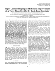 Journal of Electrical Engineering The Institution of Engineers, Bangladesh Vol. EE 37, No. II, December, 2011 Input Current Shaping and Efficiency Improvement of A Three Phase Rectifier by Buck-Boost Regulator Md. Nazmul Hasan1, Md. Shamimul Haque Choudhury1,2 and Muhammad Athar Uddin1,2 1 Electrical and Electronic Engineering, International Islamic University Chittagong (Dhaka Campus) Chittagong-4203, Bangladesh 2 Electrical and Electronic Engineering, Bangladesh University of Engineering and Technology, Dhaka-1000, Bangladesh E-mail: nzml_hsan@yahoo.com, shamimul129@gmail.com Abstract ―Three phase rectifiers are commonly used in high power applications for their low cost and ease of operation. Rectifiers have non-linear characteristics and draw non sinusoidal input current from ac sources. This causes a number of problems in the power distribution networks. Increase in reactive power, low input power factor, input voltage distortion etc. are some of those problems. In this respect, switch mode regulated rectifiers offer efficient, compact and high efficiency operation. The improvement of input current is possible by addition of Buck, Boost, Buck-Boost or Ĉuk regulator with single or three phase rectifiers. Pulse width modulation (PWM) technique is used to control the switching devices of these regulators. In this paper, a three phase full wave diode rectifier is analyzed with Buck-Boost regulator. The work shows, when a variable carrier frequency is applied for different duty cycle, the THD of the input current is low and the overall efficiency is more than 80% for lowest and highest output voltages. It provides the facility of control of output voltage to lower and greater than the input voltage efficiently by variation of duty cycle. Previously Buck regulated rectifiers were reported with good power factor and input current THD for constant voltage output. The work of this research will allow variable voltage. D I. regulator has the ability to regulate the output voltage to the desired value. The input power factor of the regulator varies and it decreases with duty cycle. Due to very low input power factor, the input current becomes high and distorted, which causes higher loss. As a result, the efficiency tends to be low. Design of the input and output filter has the lack of proper freewheeling path. In universal-input Power Factor Correction (PFC) applications, the capability of providing both step-up and step-down conversion is attractive because the output DC voltage can be set to any value. However, conventional single-switch Buck-Boost topologies, including the plain Buck-Boost, fly back, SEPIC, and Ĉuk converters [2], [3] have increased component stresses, component sizes, and reduced efficiency compared to the Boost converter. To enable a unity power factor operation of the 3-phase Buck boost rectifier, a constant inductor current is required [4], [5].The load in combination with a conventional high dynamic voltage control, would result in periodic peak currents in the Buck-Boost inductor and in the input/mains current. These current distortions make a unity power factor operation of the converter impossible. Hence, a control strategy, which will achieve unity power factor having accurate regulation of output, is desirable. A three-phase PWM regulated rectifier has been proposed in [6]. A ĈukĈuk bidirectional ac-dc converter with power regenerating capability is presented in this reference. The scheme is very complex and difficult to implement. Simplicity is a high consideration to design a regulator. In [6] input current was high and no analysis has been reported to reduce the input current. INTRODUCTION C power supply is widely used in electronic equipments. There are two types of power supply, regulated and unregulated. Unregulated dc supply is used where fixed voltage is not required. Reliable and stable operation requires regulated dc supplies. The regulation can be performed by using Buck, Boost, Buck-Boost and Ĉuk regulators. Several techniques are available to improve the power factor and the shape of input current. Single phase or three phase diode bridge rectifiers between source and load are used in many applications. But, only single phase rectifiers with resistive load draws sinusoidal current from the load. All other rectifiers’ input currents are nonsinusoidal in nature. A three phase rectifier based on Boost topology has been proposed in [7]. Drawback of the proposed method is that the output voltage is very sensitive to the change in duty cycle. Large EMI and series resonating filters have been used in the scheme. A switch mode regulator based on Ĉuk principle has been proposed in [8] to regulate ac voltage to a desired value irrespective of the input voltage and load. This regulator voltage provides a negative polarity regulated output voltage. It has the ability to change the output voltage widely by varying the duty cycle. But limited range of variation of load and input voltage has been reported. No suggestion has been made to improve the input current. II. REVIEW An AC voltage regulator based on Buck-Boost conversion principle has been proposed in [1]. The AC Buck-Boost 29 Hasan, Md. N. et al.: J. Elec. Engg., Instn. Engrs., Bangladesh, 37(II), December 2011 A single stage push-pull Boost converter has been proposed in [9]. The proposed structure includes a Boost inductor, coupling capacitor and a capacitor network, a step-down transformer and four diodes for switching. Coupling capacitor in the circuit should be nearly infinity to achieve low ripple input current. The amount of leakage reactance and mutual reactance is very high due to transformer and inductive network which influence the regulation and the efficiency of the Boost converter. The proposed model without transformer may be helpful to reduce such problem and become more useful. V. OPERATION OF THE PROPOSED CIRCUIT The operation of the proposed circuit can be described in two modes.