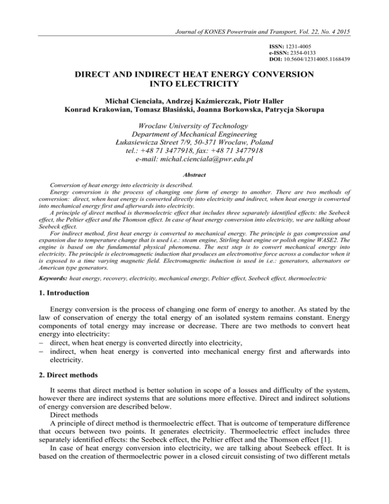 Journal of KONES Powertrain and Transport, Vol. 22, No. 4 2015 ISSN: 1231-4005 e-ISSN: 2354-0133 DOI: 10.5604/12314005.1168439 DIRECT AND INDIRECT HEAT ENERGY CONVERSION INTO ELECTRICITY Michał Cienciała, Andrzej Kaźmierczak, Piotr Haller Konrad Krakowian, Tomasz Błasiński, Joanna Borkowska, Patrycja Skorupa Wroclaw University of Technology Department of Mechanical Engineering Łukasiewicza Street 7/9, 50-371 Wroclaw, Poland tel.: +48 71 3477918, fax: +48 71 3477918 e-mail: michal.cienciala@pwr.edu.pl Abstract Conversion of heat energy into electricity is described. Energy conversion is the process of changing one form of energy to another. There are two methods of conversion: direct, when heat energy is converted directly into electricity and indirect, when heat energy is converted into mechanical energy first and afterwards into electricity. A principle of direct method is thermoelectric effect that includes three separately identified effects: the Seebeck effect, the Peltier effect and the Thomson effect. In case of heat energy conversion into electricity, we are talking about Seebeck effect. For indirect method, first heat energy is converted to mechanical energy. The principle is gas compression and expansion due to temperature change that is used i.e.: steam engine, Stirling heat engine or polish engine WASE2. The engine is based on the fundamental physical phenomena. The next step is to convert mechanical energy into electricity. The principle is electromagnetic induction that produces an electromotive force across a conductor when it is exposed to a time varying magnetic field. Electromagnetic induction is used in i.e.: generators, alternators or American type generators. Keywords: heat energy, recovery, electricity, mechanical energy, Peltier effect, Seebeck effect, thermoelectric 1. Introduction Energy conversion is the process of changing one form of energy to another. As stated by the law of conservation of energy the total energy of an isolated system remains constant. Energy components of total energy may increase or decrease. There are two methods to convert heat energy into electricity: − direct, when heat energy is converted directly into electricity, − indirect, when heat energy is converted into mechanical energy first and afterwards into electricity. 2. Direct methods It seems that direct method is better solution in scope of a losses and difficulty of the system, however there are indirect systems that are solutions more effective. Direct and indirect solutions of energy conversion are described below. Direct methods A principle of direct method is thermoelectric effect. That is outcome of temperature difference that occurs between two points. It generates electricity. Thermoelectric effect includes three separately identified effects: the Seebeck effect, the Peltier effect and the Thomson effect [1]. In case of heat energy conversion into electricity, we are talking about Seebeck effect. It is based on the creation of thermoelectric power in a closed circuit consisting of two different metals M. Cienciała, T. Błasiński, A. Kaźmierczak, P. Haller, K. Krakowian, J. Borkowska, P. Skorupa − semiconductors, provide that the contact area of the metal is located in a different temperature than the opposite ends. Currently there are such devices using the Seebeck effect: 2.1. Thermocouple, 2.2. Peltier / Seebeck cell, 2.3. Nanoantenna. Below, a few words characterized each of mentioned solutions. 2.1. Thermocouple Thermocouple is an electrical circuit element that uses the Seebeck effect, popularly used for temperature measurements. It is a device consisting of two different metals, usually in the form of wires, the ends are connected together. One connection is positioned at the measuring point and the other in the centre of constant reference temperature. By differences in temperature, occurring between the two points the potential difference is being created. It is the electromotive force, known as the thermocouples. In the case of thermoelectric power that is proportional to the temperature difference. Thermocouple usually is made out of iron and constantan. The advantages for the use of thermocouples as equipment for the recovery of electricity from heat are: − small size, − simplicity of construction, − high reliability, − the possibility of use in wide range of temperatures depending on the materials used, − the ability to perform on their own. In contrast, disadvantages are: − high trading price of thermocouples in the market, − low value of the generated electricity, − low efficiency. 2.2. Peltier / Seebeck cell Writing two surnames characterizing various thermoelectric effects in one cell is conscious. The same cell can operate as a device using the Peltier Effect, as well as the Seebeck effect. These cells are more popular under the name of Peltier. These cells operate in three different ways: − using the Peltier effect, when connected to a power source to heat is excreted into the environment, − using the Peltier effect, when connected to a power source to cool is retrieved from the environment, − using the Seebeck effect is used to generate electricity on the basis of temperature difference. For use in this case ideal is the third method that is described in details below. A boundary condition is to put the Peltier batteries in areas with different temperatures. In this case, it is direct conversion of heat into electricity. Unfortunately, if you use the popular modules that are popularly used for cooling in fridges they are not sufficient. For the production of electricity there should be different materials used, that can operate at much higher temperatures. In addition, voltage and power derived from a single cell is small, so in order to obtain efficient energy values bigger quantity of cells has to be connected in one battery. There are also many parameters that influence on the applicability of such cells; e.g. the mel