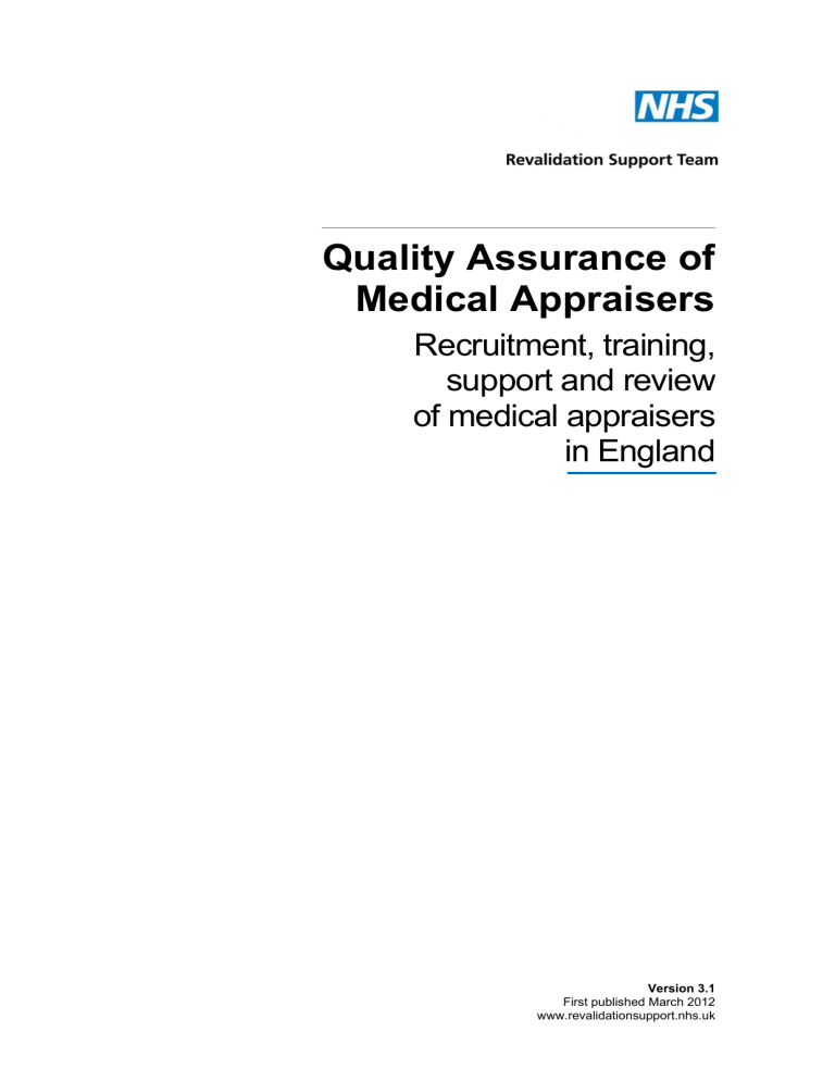 The purpose of this document is to provide a practical framework for assuring the quality of the medical appraiser workforce. It outlines processes for the recruitment, training and support of medical appraisers and methods by which their performance in the role can be reviewed. It is targeted at responsible officers and those who will be responsible for designing information systems to support revalidation. It may also be of interest to doctors, appraisers, and managers. It will be reviewed in March 2013.