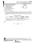 SLOS250G − JUNE 1999 − REVISED JANUARY 2005 D Wide Range of Supply Voltages, Single D D D D D DBV PACKAGE (TOP VIEW) Supply 3 V to 30 V, or Dual Supplies Class AB Output Stage True Differential-Input Stage Low Input Bias Current Internal Frequency Compensation Short-Circuit Protection IN+ VCC−/GND IN− 1 5 VCC+ 4 OUT 2 3 description/ordering information The TL343 is a single operational amplifier similar in performance to the µA741, but with several distinct advantages. It is designed to operate from a single supply over a range of voltages from 3 V to 30 V. Operation from split supplies also is possible, provided the difference between the two supplies is 3 V to 30 V. The common-mode input range includes the negative supply. Output range is from the negative supply to VCC − 1.5 V. ORDERING INFORMATION TA VIOMAX AT 25°C −40°C to 125°C 10 mV ORDERABLE PART NUMBER PACKAGE† SOT-23-5 (DBV) Reel of 3000 TL343IDBVR Reel of 250 TL343IDBVT TOP-SIDE MARKING‡ T4I_ † Package drawings, standard packing quantities, thermal data, symbolization, and PCB design guidelines are available at www.ti.com/sc/package. ‡ The actual top-side marking has one additional character that designates the assembly/test site. symbol − IN− + IN+ OUT Please be aware that an important notice concerning availability, standard warranty, and use in critical applications of Texas Instruments semiconductor products and disclaimers thereto appears at the end of this data sheet. Copyright 2005, Texas Instruments Incorporated ! "#$ %!& % "! "! '! ! !( ! %% )*& % "!+ %! !!$* $%! !+ $$ "!!& POST OFFICE BOX 655303 • DALLAS, TEXAS 75265 1 SLOS250G − JUNE 1999 − REVISED JANUARY 2005 schematic VCC+ 5 pF IN+ OUT IN− 2.4 kΩ VCC−/GND NOTE A: Component values shown are nominal. absolute maximum ratings over operating free-air temperature range (unless otherwise noted) MAX VCC+ VCC− Supply voltage (see Note 1) Supply voltage, VCC+ with respect to VCC− UNIT 18 −18 V 36 V Differential input voltage (see Note 2) ±36 V Input voltage (see Notes 1 and 3) ±18 V Package thermal impedance, θJA (see Notes 4 and 5) 206 °C/W 150 °C −65 to 150 °C Operating virtual junction temperature, TJ Storage temperature range, Tstg NOTES: 1. 2. 3. 4. These voltage values are with respect to the midpoint between VCC+ and VCC−. Differential voltages are at IN+ with respect to IN−. Neither input must ever be more positive than VCC+ or more negative than VCC−. Maximum power dissipation is a function of TJ(max), θJA, and TA. The maximum allowable power dissipation at any allowable ambient temperature is PD = (TJ(max) − TA)/θJA. Selecting the maximum of 150°C can affect reliability. 5. The package thermal impedance is calculated in accordance with JESD 51-7. 2 POST OFFICE BOX 655303 • DALLAS, TEXAS 75265 SLOS250G − JUNE 1999 − REVISED JANUARY 2005 recommended operating conditions VCC VCC+ VCC− TA Single-supply voltage Dual-supply voltage Operating free-air temperature MIN MAX 3 30 1.5 15 −1.5 −15 −40 125 UNIT V V °C electrical characteristics at specified free-air temperature, VCC± = ±15 V (unless otherwise noted) TEST CONDITIONS† PARAMETER MIN 25°C VIO Input offset voltage See Note 6 aV Temperature coefficient of input offset voltage See Note 6 IIO Input offset current See Note 6 aI Temperature coefficient of input offset current See Note 6 IIB Input bias current See Note 6 VICR Common-mode input voltage range‡ VOM Peak output-voltage swing IO IO 12 Full range 10 25°C 30 −200 VCC− to 13 VCC− to 13.5 25°C ±12 ±13.5 25°C ±10 ±13 Full range ±10 25°C 20 Full range 15 AVD Large-signal differential voltage amplification VO = ±10 V, RL = 2 kΩ BOM Maximum-output-swing bandwidth VOPP = 20 V, THD ≤ 5%, AVD = 1, RL = 2 kΩ 25°C B1 φm Unity-gain bandwidth VO = 50 mV, CL = 200 pF, RL = 10 kΩ Phase margin RL = 2 kΩ ri Input resistance f = 20 Hz 25°C ro Output resistance f = 20 Hz 25°C CMRR Common-mode rejection ratio 25°C kSVS Supply-voltage sensitivity (∆VIO/∆VCC) Short-circuit output current§ VIC = VICR(min) VCC± = ±2.5 to ±15 V −500 nA V V 200 V/mV 9 kHz 25°C 1 MHz 25°C 44 Deg 1 MΩ 0.3 75 Ω 70 90 dB 30 150 µV/V ±10 ±30 ±55 mA 0.7 2.8 25°C 25°C mA † All characteristics are measured under open-loop conditions, with zero common-mode voltage, unless otherwise specified. Full range for TA is −40°C to 125°C. ‡ The VICR limits are linked directly, volt-for-volt, to supply voltage; the positive limit is 2 V less than VCC+. § Temperature and/or supply voltages must be limited to ensure that the dissipation rating is not exceeded. NOTE 6: VIO, IIO, IIB, and ICC are defined at VO = 0. POST OFFICE BOX 655303 See Note 6 nA pA/°C −800 25°C mV 50 50 Full range UNIT µV/°C 200 Full range RL = 2 kΩ No load, 10 Full range RL = 10 kΩ Total supply current MAX 2 Full range 25°C IOS ICC TYP • DALLAS, TEXAS 75265 25°C 3 SLOS250G − JUNE 1999 − REVISED JANUARY 2005 electrical characteristics, VCC+ = 3 V and 5 V, VCC− = 0 V, TA = 25°C (unless otherwise noted) TEST CONDITIONS† PARAMETER VIO IIO Input offset voltage IIB VOM Input bias current MIN VO = 1.5 V and 2.5 V VO = 1.5 V and 2.5 V Input offset current Peak output voltage swing‡ VO = 1.5 V and 2.5 V RL = 10 kΩ AVD Large-signal differential voltage amplification VO = 1.7 V to 3.3 V, kSVS Supply-voltage sensitivity (∆VIO/∆VCC±) RL = 2 kΩ TYP MAX UNIT 2 10 mV 30 50 nA −200 −500 nA 3.3 3.5 V 20 200 V/mV VCC± = ±2.5 V to ±15 V VO = 1.5 V and 2.5 V, 150 ICC Supply current No load 0.7 1.75 † All characteristics are measured under open-loop conditions, with zero common-mode input voltage, unless otherwise specified. ‡ Output swings essentially to ground. µV/V mA operating characteristics, VCC± = ±15 V, TA = 25°C, AVD = 1 (unless otherwise noted) PARAMETER TYP UNIT VI = ±10 V, ∆VO = 50 mV, CL = 100 pF, RL = 2 kΩ, See Figure 1 1 V/µs CL = 100 pF, RL = 10 kΩ, See Figure 1 0.35 