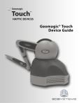 Copyright Notice ©1993-2013. © 3D Systems, Inc. All rights reserved. Produced in the USA. Except as permitted by license, no part of this publication may be reproduced, stored in a retrieval system, or transmitted, in any form or by any means electronic, mechanical, recording, or otherwise, without prior written consent of 3D Systems. Trademarks Geomagic Touch, Geomagic Touch X, Geomagic OpenHaptics, Geomagic, Phantom, Phantom Desktop, Phantom Omni, Sensable and the 3D Systems logo are trademarks or registered trademarks of 3D Systems, Inc. Other brand and product names are trademarks of their respective holders. For the most up-to-date trademark information, visit www.geomagic.com. Warranties and Disclaimers 3D Systems Geomagic Solutions does not warrant that this publication is error free. This publication could include technical or typographical errors or other inaccuracies. Geomagic Solutions may make changes to the product described in this publication or to this publication at any time, without notice. Hardware usage guidelines are provided to assist the user in protecting the effectiveness and life of the device. They are not intended as recommendations for the prevention of repetitive stress injury, carpal tunnel syndrome or any other conditions, injuries or disorders; users should consult their own physicians. By using the Geomagic Touch device, the user acknowledges and agrees that Geomagic Solutions shall have no liability for any disorder, condition or injury arising from any use of the device. Warning Do NOT open the Geomagic Touch device. Attempting to open or repair the device by anyone other than a certified authorized service center voids the manufacturer warranty and hardware maintenance contract. Questions or Comments If you have any questions for our technical support staff, please contact us at SensableSupport@geomagic.com. You can also phone 1-888-736-7225 (U.S.A. only) or +1-781-939-7444 (International). If you have any questions or comments about the documentation, please contact us at SensableDocumentation@geomagic.com. Geomagic Solutions 430 Davis Drive, Suite 300 Morrisville, NC 27560 www.geomagic.com P/N - 02495 R11: 9/16/13 Contents Preface.............................................................................................. i About this Guide .................................................................................................................i Typographical Conventions ................................................................................................i Chapter 1 Getting Started............................................................................. 1-1 Contents of the Shipping Box ........................................................................................ 1-1 The Geomagic Touch Haptic Device ............................................................................. 1-2 System Requirements ..................................................................................................... 1-2 Proper Handling and Positioning of the Geomagic Touch Device ................................ 1-3 Chapter 2 Installing the Geomagic Touch Device ......................................... 2-1 Installing the Geomagic Touch Device Drivers ............................................................. 2-1 Connecting the Geomagic Touch Device ....................................................................... 2-2 Important Information for Existing Users with a Desktop Device Upgrading to Geomagic Touch .................................................................... 2-4 Run Geomagic Touch Setup to Identify and Pair the Device ........................................ 2-5 Run Geomagic Touch Diagnostic to Verify Setup and Calibrate .................................. 2-6 Chapter 3 Using the Geomagic Touch Device ............................................. 3-1 Working in 3D Space ..................................................................................................... 3-1 Physical Limits of the Device ........................................................................................ 3-1 Appendix A Troubleshooting ..........................................................................A-1 Appendix B Alternate Connections Appendix C Customer Support Appendix D Regulatory Notices...................................................................... Appendix E Configuring Multiple Devices ...................................................... E-1 Appendix F Geomagic Touch Re-Packaging Instructions Appendix G Device Specifications ................................................................B-1 .......................................................................C-1 D-1 ........................... F-1 ..................................................................G-1 Geomagic Touch Device Guide Geomagic Touch Device Guide PREFACE Preface About this Guide The Geomagic® Touch Device Guide describes the process of installing the required device drivers for your new Geomagic Touch haptic device and connecting the hardware device to your computer. You will also find information on how to use the device and other information about the device. For the most current device information please visit our website at www.geomagic.com. We've worked extensively to ensure that the Geomagic Touch device and device drivers install and work smoothly. If you experience any problems in the installation or use of your device, please contact Customer Support (see inside cover for contact information). Please note, if you are installing your device on a supported non-Microsoft® Windows OS, you will find additional information in a separate document that shipped with your software product. Typographical Conventions This guide uses the following typographical conventions: Convention Description Example Italics First use of a new term; reference A Voxel is...; see the User to another document or file. Manual. Bold Keyw