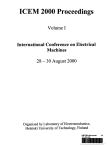 ICEM 2000 Proceedings Volume I International Conference on Electrical Machines 28 - 30 August 2000 Organised by Laboratory of Electromechanics, Helsinki University of Technology, Finland UB/TIB Hannover 121 282 228 89 TABLE OF CONTENTS VOLUME I PLENARY SESSION 1 Karvinen, J. Future Perspectives of Electrical Machines and Market Trends 1 DIALOGUE SESSION 1 YanD.,HuM. The finite element method of computing exact inductance in squirrel cage induction motor 5 Corcoles F., Pedra J., Salichs M. Numerical identifiability of the parameters of induction machines 9 Smajic J., Madzarevic V., Berberovic S. Numerical calculation of induction motor stator phase current and torque-speed characteristics 14 Ortega J.M.M., Payan M.B., Mitchell C.I. Dynamics of the induction motor with voltage sags 18 Komeza K., Wiak S., Dems M., Lesniewska E. Electromagnetic field of four-speed induction motor during transients 23 Pozueta M.A.R., Diaz J.R.L., Pardo J.C. Equivalent space phasors: a method for the analysis of induction machines with space harmonics 28 Bartos V., Kotlanova A. Transient phenomena in the system with the double fed asynchronous machine 33 Zadrozny J., Zadrozny J. (jr), Wiak S., Welfle H. Field/inductance computation by means of FEM of induction motor dynamic states (for parametric resonance condition) 36 Zahawi B.A., Refoufi L. Detailed analysis of harmonic effects in the static Kramer drive 41 Lehmann R.B., Camacho J.R., Salerno C.H., Leao A.T. A contribution to the study on the effects of variation for the rotor slot inclination - the three-phase induction motor case 46 de Mendonca R.G., Neto L.M., Teixeira H.B., Camacho J.R. Asymmetrical three-phase induction motor performance through the use of dynamic capacitance switching 51 Bargallo R., Llaverias J., Martin H. Transient torque determination in controlled drives. Contribution to the development of an equipment for dynamic operation test 56 Baaklini I., Retiere N., Bacha S., Gaudin C. Modelling of industrial induction motors for the pre-diagnosis of voltage dips 61 De Gersem H., Hameyer K., Mertens R. Comparison of stationary and transient finite element simulation techniques with respect to the asynchronous operation modes of induction machines 66 Di Napoli A., Santini E. FEM identification of parameters to vector control of induction machines 71 Goncalves J.G., Cabrita C.P. A new concept on linear current density in linear induction motors 76 Yoshida K., Takami H., Fujii A. A proposal of sensorless propulsion-control of PM LSM in mass-reduced-mode 81 Liang D., Ye F. Simulation of reactive linear synchronous motor starting performance 86 Wang X., Yuan S., Jiao L., Wang Z. Dynamic mathematical model of a permanent magnet linear synchronous motor 90 Dolinar D., Stumberger G., Grcar B., Zagradisnik I.,Hameyer K. Exact tracking of linear synchronous reluctance servodrive 94 Torii S., Mori Y., Ebihara D. Fundamental investigations on analysis of linear induction motor using the wavelet transform technique 99 Torii S., Oka K., Kajioka M.,Watada M., Ebihara D. A consideration on pull in synchronization and ejection of the mover on the discontinuously arranged transfer system 103 De Gersem H., Hameyer K. Finite element simulation of a tubular linear induction machine compared to analytical results and measurements 107 Zhang B., Wang F., Feng G., Yuan H., Deng J., Zhang X. Analysis and design of a transformer with medium frequency square wave voltage inverter power supply Ill Guemes Alonso J. A. Modelling and design of smoothing reactances. Application to air gap length calculation 115 Sakkos T., Sarv V. Theory and application of linear time-varying inductors with controlled turnnumber 120 Suorsal. Analytical calculation formulas for an air-gapped inductor 125 Di Gerlando A., Perini R. Analytical evaluation of the stator winding temperature field of water-cooled induction motors for pumping drives 130 GnacinskiP. Determination of parameters of the thermal scheme of an induction motor 135 Lopez-Fernandez X.M., Donsion M., Coimbra A.P., Pinto J.A.D., Antunes C.L. Transient thermal performance of a 3-phase induction motor under singlephasing operation 139 Prieto Alonso M.A., Lopez X.M., Donsion M.P. Harmonic effects on temperature rise of a squirrel cage induction motor 144 Li W., Fu M., Zhou F., Cheng S. The calculation of stator 3D temperature field of medium scale high voltage explosion-proof asynchronous motor on the basis of theory of similarity for fluid and 3D FEM 148 Hu M., Lu D., Huang X., Du Y. A novel FEM method to calculate 3D thermal distribution in the end region of turbo-generator and its application 152 Gurevich E., Oshurkov P. Determination of rotor winding temperature of the turbogenerator with the brushless excitation system 156 Maximini M., Koglin H.-J., Igel M. Observing the rotor temperature of induction machines in measurable variables 161 Mukosiej J. Problem of accuracy of thermal testing of electric machines 166 Gurevich E. Non-contact method for estimating the heat parameters of electrical machines by the cooling agent transient temperature measurements 171 Delaere K., Heylen W., Belmans R., Hameyer K. Introducing magnetostriction into coupled magnetomechanical systems 174 Kacperski M., Kubiak W., Szulakowski J., Witczak P. Generation and transmission of magnetic vibrations in power transformers 179 Ertan B., Leblebicioglu K., Demirel O. An approach to design and optimization of HV high frequency resonant power transformers 183 Saenz J.R., Rebollo CM., Bilbao J., Tapia A., Fernandez E., Dorronsoro N., GonzalesP. An algorithm for residual life estimation of transformers 188 LECTURE SESSION 1 Auditorium A Induction machines 1 Chong E.F.H., Flack T. J. Comparison of coupled circuit and eddy-current finite-element methods for modelling induction motors under conditions of supply imbalance 193 Lagonotte P., Broussely M. Parameters identification of a saturated induction machine taking the thermal effects into account 198 Boldea I