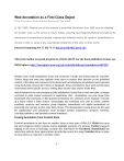 Web Annotation as a First Class Object Paolo Ciccarese, Stian Soiland-Reyes and Tim Clark © 2013 IEEE. Personal use of this material is permitted. Permission from IEEE must be obtained for all other uses, in any current or future media, including reprinting/republishing this material for advertising or promotional purposes, creating new collective works, for resale or redistribution to servers or lists, or reuse of any copyrighted component of this work in other works. Internet Computing Vol 17 (6) 71-75 doi:10.1109/MIC.2013.123 This is the Author Accepted preprint as of 2013-08-09. For the final, published version, see IEEE Explore: http://ieeexplore.ieee.org/xpl/articleDetails.jsp?arnumber=6682930 Scholars have made handwritten notes and comments in books and manuscripts for centuries. Today’s blogs and news sites typically invite users to express their opinions on the published content; URLs allow web resources to be shared with accompanying annotations and comments using third-party services like Twitter or Facebook. These contributions have until recently been constrained within specific services, making them second-class citizens of the Web. Web Annotations are now emerging as fully independent Linked Data in their own right, no longer restricted to plain textual comments in application silos. Annotations can now range from bookmarks and comments, to fine-grained annotations of a selection of, for example, a section of a frame within a video stream. Technologies and standards now exist to create, publish, syndicate, mash-up and consume, finely targeted, semantically rich digital annotations on practically any content, as first-class Web citizens. This development is being driven by the need for collaboration and annotation reuse amongst domain researchers, computer scientists, scientific publishers, and scholarly content databases. Freeing Annotation from Content Silos Content annotation in one form or another forms a basic part of Web 2.0. Flickr lets users tag and categorize others’ photos, and to highlight portions of a picture; Twitter supports tagging in the form of hashtags, recently also introduced by Facebook; SoundCloud lets music fans indicate their appreciation at particular points in a song; Youtube allows a video to be posted as a response to another video. -1– Social networking sites like Facebook and Google+ let users share a URL to, say, a news story, enabling a stream of comments within their group of friends, which indicate their “likes”. Social media sites like Reddit rank lists of news items solely with up/down voting from their users, and the stream of associated discussions provide anything from amusing side-jokes to detailed reviews by experts in the field. What do these applications have in common? First, that the annotations they support have a shared subject, typically identified by an URI (e.g. to a webpage, image or video); and second, these annotations live within a single system, either at the provider of the resource or at a third-party bookmarking site. Although many of these systems provide REST APIs for thirdparty access, the APIs differ among sites. Up until very recently there has been no common annotation model independent of what is being annotated. It is therefore difficult for, say, a SoundCloud page to embed comments made within Facebook or Reddit. While this may not pose a significant problem for ordinary users of social media, it is a big problem in digital scholarship. This problem is driving a significant change in the way annotations can now be implemented and reused across systems and domains. Semantics, Not Just Comments In July 2013, Google announced the availability of 800 million documents annotated by 11 billion Freebase concepts [1]. This is semantic tagging. Text in a document is mapped to a stable URI that identifies a concept, entity, person, place, process, etc, with which it is associated. Information derived from elsewhere – say Wikipedia – is refocused around a common URI in an organized way. In Google’s case, this was done using resources in Freebase. But we can also use entries in DBPedia, or other resources, to identify terms. Additionally we can use ontologies: formal vocabularies with classes, properties, and relationships. Using formal vocabularies specified in the Web Ontology Language (OWL), we can create richer, more computationally tractable structures than we can do using dictionaries or encyclopedias. Formal ontologies relate elements in a domain one to another, using formal predicates, and allow us to perform automated reasoning over these knowledge structures. They may also supplement, identify, or tag dictionary and encyclopedia entries themselves. If I know that the URI of an ontology term for the gene BACE1 corresponds to some text, the ontology can also tell me what protein is the product of that gene (beta site APP cleaving enzyme), its amino acid sequence, species variants, - and that it is implicated in the pathology of Alzheimer Disease. I can find experimental data annotated with this term, or one of its related terms, as well. And I can assemble mash-ups of related useful information from multiple databases, and overlay them on the text referring to my original gene name. With scientific publication volumes growing exponentially, this kind of machine assistance to reading, comprehension and knowledge accumulation is increasingly necessary. Semantic tagging or semantic linking is now a reality, and extends beyond Google and Freebase. Perhaps its most important application is in scholarship. For example, the Europe PubMed Central (http://europepmc.org/) database of scientific articles now semantically tags all its entries with protein, gene and chemical compound names found in the text. But dealing with these tags raises further important questions. -2– How do we represent tags, and other annotations? Are they injected in the text, or stored separately? How do we share them across s
