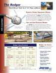 The Badger 15k & 20k psi Tools for 4"-12" Pipes w/Elbows Superior Design Negotiates Elbows PIPE CLEANING We put real value into your hands with a technically superior tool at a reasonable price. The Badger is the first rotation speed controlled 2-D tool with positive high pressure seal and replaceable jets that will track around a 4" short radius elbow. (Up until now your only choices were an expensive rotation device, a leaky seal rotating head or a non-rotating head.) The Badger changes everything. Fast and Slow Rotation Models Handles elbows down to 4" short radius. The Badger uses viscous speed control, has up to 100 lbs of pulling force and features 5 jet ports; 2@135,Û#ÛDQGDQRIIVHW boring jet at 15.Û7KHWRRORSHUDWHVLQHLWKHUDIDVWPRGHUSP 220 rpm) or a slow mode (20 rpm-80 rpm) with the change in rpm’s effected by viscous fluid thickness. The Badger is perfect for elbows Rear jets flush and pull Badger Jet Action Badger Specifications MODEL Maximum Pressure BA-15k 15k psi 1,000 bar BA-20k 20k psi 1400 bar Rotation Rate Fast 75-220 rpm 75-220 rpm Slow 20-80 rpm 20-80 rpm Flow Range BA-R22 Offset 10-19 gpm BA-R16 Offset 18-30 gpm 60-110 lpm Flow Rating 9-15 gpm 30-50 lpm 14-22 gpm 50-80 lpm 1.6 Cv .81 Cv Weight 2.5 lbs Diameter 2.5 in. 63.5 mm 2.5 in. 63.5 mm Length 3.5 in. 89 mm 3.5 in. 89mm Inlet Port Outlet Ports 12 40-70 lpm 1.1 kg 2.5 lbs The Badger’s boring jet cuts through plugs while the back jets flush out debris and provide pulling power. 1.1 kg 3/8 npt 3/4 Type M male 5 x 1/8 npt AP2 5 x 1/8 npt AP2 • Viscous fluid rotation speed control • Up to 100 lbs. of pulling force • Durable stainless steel construction • Uses high quality Attack Tips • Rotating jets 2@135,˚ 2@100,˚ 1@15˚ 1-800-231-8192 • sales@waterblast.com Jetstream of Houston, LLP • 4930 Cranswick • Houston TX 77041 © Jan '08 The Gopher 20k & 40k psi Tools for Straight Pipes The two heads interchange easily. Hard Hitting with Controlled Rotation US Patent 5,909,848 PIPE CLEANING The Gopher is the tube version of our Barracuda . It is perfect for cleaning piping, evaporator tubes and process drains. It has the power to handle coke, polymers, coatings and latex; anything clogging tubes or SLSHVRUODUJHU ® Polisher Style The GO-M9 uses StoneAge AP2 Attack Tips and the GOH9 uses OS4 Sapphire Tips. Different jet configurations for unplugging or polishing allow for maximum productivity no matter which function you choose. ® Unplugger Style Centralizers Gopher - Specifications MODEL Maximum Pressure Rotation Rate Flow Capacity GO-M9 20k psi 600-1000 rpm 25 gpm Flow Rating Weight w/ Head 1400 bar 4 lbs 1.8 kg Diameter 1-5/8 in. Length 7.8 in. Head Diameter 1-5/8 in. Inlet Outlet Ports 90 lpm 0.84 Cv 41 mm 19.8 mm 41 mm GO 070 for 4, 5, 6, 8 and 12" pipes. GO 075 for 3"or 4.5" pipes. GO H9-C 40k psi 2800 bar 600-1000 rpm 12 gpm 40 lpm 0.43 Cv 4 lbs 1.8 kg 1-5/8 in. 7.8 in. 41 mm 19.8 mm 1-5/8 in. 41 mm 9/16 MP 9/16 HP AP2 OS4 Head Selection Polisher Low-Flow Model Polisher High Flow Model Unplugger Low Flow Model Unplugger High Flow Model 7-13 gpm 30-50 lpm GO 042-R.14 14-25 gpm 50-90 lpm GO 042-R.07 8-14 gpm 30-50 lpm GO 043-R.17 15-25 gpm 50-90 lpm GO 043-R.08 3.8-6.6 gpm 20-30 lpm GO 342-R.14 7-12 gpm 30-40 lpm GO 342-R.08 4-7 gpm 20-30 lpm GO 343-R.18 7-12 gpm Gopher with Unplugger Jet Configuration 30-45 lpm GO 343-R.08 1-800-231-8192 • sales@waterblast.com Jetstream of Houston, LLP • 4930 Cranswick • Houston TX 77041 © Jan '08 13 The Raptor 15k and 20k psi & 60 gpm 2D Nozzles Raptor Nozzle PIPE CLEANING with Optional Heads 6 Port 1/8" npt 7 Port 1/8" npt The Raptor is a 2D self-rotating workhorse for either 15k or 20k psi. It’s perfect for cleaning process drains, totes, closed head drums, water well screens, ducts and exhaust stacks. Used with the centralizers shown below it will clean pipes from 3" to 12" diameters and can handle straight tubes as tight as 2.25" in diameter. The Raptor uses viscous fluid rotation speed control and operates with 2, 4 or 6 jets in balance. • • • • • Rotation speed control Replaceable tips & seals Centralizers up to 12" 2, 4, or 6 jets in balance Optional 15˚ boring head 6 Port 1/4" npt Raptor Specifications MODEL Available Options Raptor Maximum Pressure 20k psi 1400 bar Rotation Rate Fast 50-250 rpm Slow 15-60 rpm Maximum Flow 60 gpm Flow Rating 230 lpm 2.5 Cv Weight (w/o Head) 4.2 lbs 1.9 kg Head Diameter RPT 043-P2-6 RPT 044-P4-6 Length Inlet Port RPT 070 is available for 4", 5", 6", 8" and 12" pipes. 51 mm 2.5 in. 64 mm 9.5 in. 240 mm 1/2 npt or 9/16 MP Outlet Ports 14 2.0 in. RPT 070 Centralizer There are two inlet connections DYDLODEOHQSWIRUNSVL DQG03IRUNSVL7KHUH are also two standard 6-jet heads with different diameters and a third head option featuring a boring jet IRUXQSOXJJLQJDWÛRIIFHQWHULQ the front. All are made of durable stainless steel and use replaceable high pressure seals and nozzle tips. 1/8 npt & 1/4 npt Head Offset R30 R18 R11 25-60 gpm 5k psi 10-23 gpm 16-38 gpm 10k psi 10-18 gpm 15-31 gpm 25-51 gpm 15k psi 10-17 gpm 16-28 gpm 26-47 gpm RPT 075 Centralizer 20k psi 10-16 gpm 17-26 gpm 27-43 gpm RPT 075 for 3" or 4.5" pipes. We recommend using a centralizer to keep the head from rubbing against the cleaning surface. The RPT 075 is a solid plastic skid centralizer available in 3" or 4.5" diameters. The RPT 070, for larger pipes, uses steel collars and replaceable plastic skids to fit 4" to 12" diameters. 1-800-231-8192 • sales@waterblast.com Jetstream of Houston, LLP • 4930 Cranswick • Houston TX 77041 © Jan '08 BJV-M & BJV-P16 Nozzles Self-Rotating up to 15k psi & 200 gpm BJV-M with P4 Head The BJV-M is a 2D self-rotating nozzle with a maximum working pressure of 15k psi. The BJV-M KDQGOHVSLSHVDQGGUDLQVIURPDWNSVLDVZHOODV tanks, reactors, process vessels, heat exchanger shells and coker cyclones. Extension nipples and centralizers adapt all BJV tools to almost any application. BJV accessories can be found on page
