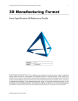 3D Manufacturing Format Specification and Reference Guide 1 3D Manufacturing Format Core Specification & Reference Guide Version Status 1.0 Published THESE MATERIALS ARE PROVIDED “AS IS.” The contributors expressly disclaim any warranties (express, implied, or otherwise), including implied warranties of merchantability, non-infringement, fitness for a particular purpose, or title, related to the materials. The entire risk as to implementing or otherwise using the materials is assumed by the implementer and user. IN NO EVENT WILL ANY MEMBER BE LIABLE TO ANY OTHER PARTY FOR LOST PROFITS OR ANY FORM OF INDIRECT, SPECIAL, INCIDENTAL, OR CONSEQUENTIAL DAMAGES OF ANY CHARACTER FROM ANY CAUSES OF ACTION OF ANY KIND WITH RESPECT TO THIS DELIVERABLE OR ITS GOVERNING AGREEMENT, WHETHER BASED ON BREACH OF CONTRACT, TORT (INCLUDING NEGLIGENCE), OR OTHERWISE, AND WHETHER OR NOT THE OTHER MEMBER HAS BEEN ADVISED OF THE POSSIBILITY OF SUCH DAMAGE. Copyright 3MF Consortium 2015 2 Table of Contents Preface .................................................................................................................................. 4 About this Specification ..................................................................................................................4 Document Conventions ..................................................................................................................4 Language Notes..............................................................................................................................5 Software Conformance ...................................................................................................................5 Part I. 3MF Documents .......................................................................................................... 7 Chapter 1. 3MF Document Format ......................................................................................... 8 1.1. 1.2. How This Specification Is Organized .....................................................................................8 Package ..............................................................................................................................9 Chapter 2. Parts and Relationships ...................................................................................... 10 2.1. 3D Payload ........................................................................................................................ 10 2.1.1. 3D Parts and Payload Relationships .................................................................................... 10 2.1.2. 3D Model Part ..................................................................................................................... 12 2.1.3. Thumbnail Part .................................................................................................................... 12 2.1.4. PrintTicket Part ................................................................................................................... 13 2.2. Part Naming Recommendations ........................................................................................ 13 2.3. 3MF Document Markup..................................................................................................... 14 2.3.1. Support for Versioning and Extensibility ............................................................................ 14 2.3.2. XML Usage........................................................................................................................... 15 2.3.3. Markup Model .................................................................................................................... 15 2.3.4. Whitespace ......................................................................................................................... 15 2.3.5. Language ............................................................................................................................. 16 Chapter 3. 3D Models .......................................................................................................... 17 3.1. Coordinate Space .............................................................................................................. 17 3.2. Relative Directions and Measurement ............................................................................... 17 3.3. 3D Matrices....................................................................................................................... 18 3.4. Model ............................................................................................................................... 19 3.4.1. Metadata............................................................................................................................. 21 3.4.2. Resources ............................................................................................................................ 22 3.4.3. Build Instructions ................................................................................................................ 23 Chapter 4. Object Resources ................................................................................................ 25 4.1. Meshes ............................................................................................................................. 26 4.1.1. Fill Rule ................................................................................................................................ 27 4.1.2. Vertices ............................................................................................................................... 28 4.1.3. Triangles .............................................................................................................................. 29 4.2. Components ..................................................................................................................... 31 4.2.1. Component .................................