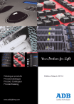 Your Partner for Light Catalogue produits Productcatalogus Product Catalogue ProduktKatalog www.adblighting.com Edition March 2014 Lighting Technologies Summary Projects & Achievements Controlling FREEDOM LIBERTY IMAGO HATHOR Rack PC Unit DOMINO MIKADO Networking Dimming EURODIM Twin Tech EURORACK 60 DIMSWITCH MEMORACK MIKAPACK Touring Racks 2 4 4 6 8 10 12 14 16 18 18 22 24 26 28 30 30 32 36 46 48 Lighting - Theatre Spotlights Motorized WARP WARP EUROPE "A" Range EUROSPOT Lighting - Multi-Purpose Luminaires Accessories ALC4-2 Cyclorama Lights ACP 1000 Fill Lights LF/HF 1000 SVOBODA SOFTLUX 50 50 52 54 56 58 60 1 Lighting Technologies A wealth of experience in stage and studio lighting, a comprehensive range of high quality products and a strong project management capability are some of the key strengths which have made of ADB the preferred partner of so many Theatre and Television Lighting Professionals around the world. Bolshoi Theatre Moscow Russia Whenever quality and consistant performance count leading venues around the world rely on ADB. EURODIM installation dimmers power a large array of luminaires every day. Similar installlation: Novosibirsk Theatre, Russia, Theatre of Nations, Russia Metropolitan Opera New York The totally silent WARP Motorized profile spotlights are the choice of discerning lighting professionals in many prestigious venues: Monnaie Opera Brussels, Belgium, Shen Zen Concert Hall, China, Bayerische Staatsoper, Munich Germany, Glyndebourne Festival, United Kingdom Philharmony Theatre Strasbourg In order to save energy 56 x ALC4-2 have been installed for the lighting of the philharmonic orchestra. 6 x WARP/M motorized profiles for multi position detailed lighting. Similar cases: Casino Oostende, Belgium, Macau Cultural Centre, China, C-Mine Genk, Belgium Palais Montcalm Quebec BNTV Bulgaria Refurbishment of existing studio including: repair and redesign of 30 years telescopic elements, design and build of suspension control system and installation of complete lighting system with Control desk, dimmers and TV luminaries. The Salle Raoul Jobin concert hall, one of the best in the world, is equipped with Motorized WARPS. Similar installlation: Onasio centre Athens TV Lighting & Energy Van Algerian TV A speciality of our project department is to design and supply custom solutions, such as this lighting van. Should you have any specific lighting requirement, do not hesitate to contact our project deparment. 2 Lighting Technologies Projects & Achievements BASTILLE Opera Paris - France English National Opera (ENO) - london National Theatre of Bahrain Replacement of dimmers originally installed for the theatre’s opening in 1989 by newest EURODIM Twin Tech technology. ADB Lighting has been appointed to supply the English National Opera (ENO), based at the Coliseum in London, with a EURODIM Twin Tech dimming system, fitted with dualmode DimSwitch dimmer modules. ADB partner TELMACO has project managed and installed the complete lighting system with Twin Tech DimSwitch dimmers and luminaires from ADB. Many famous opera houses rely on the quality and endurance of ADB digital dimmers, such as: Teatro alla Scala, Milano, Bolshoi, Moscow, Opera Garnier, Paris, Grand Théâtre de Genève, Switzerland Other fine venues: Concert Haus, Vienna, Austria Palau de les Arts Reina, Sofia, Spain Casa di Musica, Porto, Portugal Oriental Arts Centre, Shanghai, China Tonhalle, Düsseldorf, Germany Gewandhaus, Leipzig, Germany Other references in Asia: Shanghai Grand Theatre, China Kimhae Cultural Centre, Seoul, Art Centre, Soengnam, Culture Hall, Korea New National Theatre, Tokyo, Japan VRT - TV STUDIO Brussels Belgium Professional Broadcasting Studios request 100% reliability and functionality. Musiktheater Linz Austria The Linz's Theatre is equipped with EURODIM Twin Tech technology and also with the FREEDOM control desk. Major broadcasters relying on ADB: National BTV-Minsk, Belarus, TF1 Paris, Channel 5, 3, 11 Bangkok, Thailand, National Television HRT, Croatia, BBC Studios, United Kingdom, DIGI24, Bucharest, Romania, Media Center, Turkmenistan, NHK, Osaka, ITV Television, Taiwan Other venue: Youth Theatre Zagreb An impressive reference list is available upon request. 3 Lighting Technologies Controlling The state of the art lighting and show control tool when more multi-parameter instruments are needed to be controlled and fast access is required. Together with the LIBERTY console this range is ideal for all venues seeking a fully integrated solution to control conventional and moving lights as well as LED sources and other modern equipment in a portable package. FREEDOM features four additional rotary wheels with pushbutton function and a super smooth large size trackball for precision positioning control. Updated with a new Moving Light library, including over 10000 fixtures, FREEDOM allows users to control quantities of multiple LED fittings, intelligent lights or media servers as well as the standard generic dimming systems. Four physical DMX outputs and one physical DMX512 input on board with 5 pole standard XLR connection sockets can be used in case no ETHERNET network is available. Highly intuitive thanks to the graphical user interface and powered by the HATHOR software this desk meets the sophisticated needs of all lighting professional. The lighting control desk philosophy has been specifically designed for theatre stage lighting without any compromise. FREEDOM is available in five basic configurations controlling channel numbering from 120 to 2048 multi-parameter lighting instruments and can address up to 32 universes via suitable networks. Synchronised backup is optionally available. FREEDOM consoles perform as standalone or as a client consoles in an extended networked system. Networked FREEDOM consoles will support multi-user / multi-operator setups with optional software packages and hence works perfectly together with other control desks powered by HATHOR software. FREE