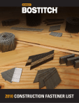 2010 CONSTRUCTION FASTENER LIST Tool Reference Chart H BRT130 G&H F21PL2 D MCN250 F28WW E&X N75C P HP118K K N62FNK-2 O SX1838K Q MIIIFS U,W&X 438S4-1 BB CC CC T6-6OC2 R SB-1664FN Y MIII812CNCT 450S2-1 BB&CC T6-8 PN100K Z 650S4 DD P3-CHROME R MIIIFN V&W PN50 J M O U&X BB H30-8D6 H30-8 PC2K Z M GFN1664K SB-150SX MFN-201 N66C J K N S J 438S2R GFN1564K SB-1850BN LHF2025K N66BC 438S2 N&O O&T F N GBT1850K D MCN150 N89C-HQ M SB-2IN1 EHF1838K E N89C FN1664K A&B GF28WW E N BT1855K C&D F33PT N80CB I RN46-1 A&B 650S5 CC BB T6-8OC2 H30-6 BB PC6-8 P6C-6 AA SL1838BC CC EE P7 TABLE OF CONTENTS This catalog was designed with a color-coding system. Finding the right tool and fastener for the right application is as easy as flipping to the appropriate color. FRAMING . . . . . . . . . . . . . . . . . . . . . . . . . . . . . . . . . . . . . . . . . . . . . . . . . . . . . . . . . . . . . . . . . . . . . . . . . . . 4-8 ROOFING . . . . . . . . . . . . . . . . . . . . . . . . . . . . . . . . . . . . . . . . . . . . . . . . . . . . . . . . . . . . . . . . . . . . . . . . . . . . . 9 FINISH AND TRIM . . . . . . . . . . . . . . . . . . . . . . . . . . . . . . . . . . . . . . . . . . . . . . . . . . . . . . . . . . . . . . . . . . 10-11 FLOORING . . . . . . . . . . . . . . . . . . . . . . . . . . . . . . . . . . . . . . . . . . . . . . . . . . . . . . . . . . . . . . . . . . . . . . . . . . . 12 SPECIALTY . . . . . . . . . . . . . . . . . . . . . . . . . . . . . . . . . . . . . . . . . . . . . . . . . . . . . . . . . . . . . . . . . . . . . . . . 13-14 CONSTRUCTION STAPLES . . . . . . . . . . . . . . . . . . . . . . . . . . . . . . . . . . . . . . . . . . . . . . . . . . . . . . . . . . . . . . 15 MANUAL FASTENING . . . . . . . . . . . . . . . . . . . . . . . . . . . . . . . . . . . . . . . . . . . . . . . . . . . . . . . . . . . . . . . . . . 16 Toll Free Customer Service Number: 1-800-556-6696 Customer Service FAX Number: 1-800-842-9360 Stanley®-Bostitch® manufactures over 2000 types of fasteners. Each fastener is engineered for optimal performance in Stanley®-Bostitch® tools, and for exceeding the performance expectations of our customers. Our goal is to continually increase efficiency, productivity, and quality, and to ensure building code compliance through reports ESR-1539, ESR-1482, ESR-2122 and ER-120. Our team of engineers leads the industry in innovation and design. Utilizing our advanced laboratory, our team of engineers conducts environmental testing to study the effects of storm forces and other weather conditions, withdrawal testing to evaluate new coatings, penetration testing to evaluate drive characteristics, and development testing to optimize withdrawal, shear and pull-through performance. Selecting the Proper Stanley®-Bostitch® Nails Examples of Stanley®-Bostitch® Stick Nails Plastic Collation Wire Collation Paper Collation Adhesive Collation Stanley®-Bostitch® Stick Nails are designed, engineered and manufactured in four different forms and are generally identified by collation material – plastic, wire, paper or adhesive. Adhesive collation is used on finish nails and brads for trim and fine woodwork. Finish nails and brads range in length from 3/8" to 2-1/2" with diameters ranging from 15 to 23 gauge. The plastic, wire and paper collated nails are used for general framing and crating applications. Stick nails range in length from 1-1/2" to 6-1/4" with diameters ranging from 0.113" to 0.165". Examples of Stanley®-Bostitch® Coil Nails Wire Collation Plastic Collation Stanley®-Bostitch® Coil Nails are made at a 15-degree angle, joined together with wire or plastic, and range from 3/4" to 4" in length with diameters ranging from 0.080" to 0.148". Applications typically include roofing, siding, fencing, framing and crating. There are four types of nail shanks – smooth, ring, screw and HurriQuake®. A smooth shank has a withdrawal capacity that is adequate for most applications. During the manufacturing of smooth shank nails, a coating is applied, which eases penetration resistance and ultimately helps improve the holding power of the fastener. However, when more holding power is necessary, a ring or screw shank should be used. A ring shank is designed for increased withdrawal strength in softwoods. The screw shank works well at improving the withdrawal capacity in hardwoods. The HurriQuake® nail combines all three shanks for high performance sheathing and framing. 2 Visit us at www.bostitch.com ALWAYS WEAR SAFETY GOGGLES The metal and coating used on the shank of the nail are important when selecting the proper nail for the application. Bostitch offers nails manufactured out of cold worked carbon steel, cold worked hardened steel, aluminum and stainless steel. Cold worked carbon steel is most commonly used when corrosion resistance is not a concern; cold worked hardened steel is most commonly used when attaching material to very hard substrates; and aluminum and stainless steel are most commonly used when severe corrosion resistance is needed due to the wood or environment in which the nail is installed. Exclusive to Bostitch is the THICKCOAT® galvanization which provides a consistent, high-performance, corrosion-resistant coating. Bostitch THICKCOAT®, as recognized in the exclusive code report ESR-1482, is designed to meet or exceed the performance of ASTM A153 hot dipped galvanized nails. THICKCOAT® fasteners are available in most popular sizes of wire weld, coil and stick, and are specifically designed for use in ALL pressure treated lumber and exterior applications. Easy to Identify Head • Marked for easy identification during code inspection Shear Shank Technology (Patent-Pending) • Screw shank fills voids in sheathing created by rings • Smooth shank provides shear strength at primary stress points Up to 25% Larger Effective Head Area (Patented) • Increases pull-through resistance • Designed to decrease overdrive Deep Ring Technology • Ring shank delivers ou