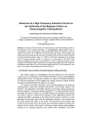 Influences of a High Frequency Induction Current on the Uniformity of the Magnetic Field in an Electromagnetic Casting Mould Lintao Zhang, Ian Cameron and Johann Sienz The Advanced Sustainable Manufacturing Technologies (ASTUTE) project, College of Engineering, Swansea University, Singleton Park, Swansea SA2 8PP, UK L.Zhang@swansea.ac.uk Abstract An analysis of the influences of a high frequency (30 kHz) alternating current on the uniformity of the magnetic field (B) in an electromagnetic casting (EMC) mould is investigated by means of parametric numerical simulations where the induction current (Js) varies in the range of [1 to 10000 A]. The results show that values of the magnetic flux density along the casting direction (Bz) near the square mould corners are small, compared to those at the other locations where Js < 10000 A, and that the magnitude of Bz increases with an increased induction current (Js). However, it is shown that, for the EMC mould structure investigated in this paper, the variations of Js have no significant influences on the uniformity of the magnetic field, especially for the regions near molten steel level. Moreover, c the effective acting region (Rbz) for the critical magnetic field (Bz ) is first introduced in this paper, which opens an interesting topic for future research. 1. Introduction and principles of electromagnetic casting technique This paper focuses on investigations into the influences of the induction current (Js) on the uniformities of the magnetic field (B) in a square electromagnetic casting (EMC) mould. The approach consists of a variety of numerical simulations to reveal the distributions of the magnetic flux density along the casting direction (Bz), which are obtained when the value of Js is varied. The interest in the EMC technique, which was first applied to the aluminum casting process, stems from dramatic improvement of the surface quality of the [1] strands . The application of the EMC technique to the steel casting process has [2,3] been developed in some steel casting companies . The basic principles of EMC technique are shown in Figure 1(a). The EMC mould is surrounded by an induction coil, which is used as a carrier for the induction current (alternating current). The magnetic field (B) is generated in the space and the induced current (Ji) is also generated in the molten steel. With the interactions of B and Ji, the Lorentz force (F) acting towards the centre of the mould. The movements of the molten steel caused by the Lorentz force can improve the lubricating conditions between the strands and the mould, which result in allowing a higher casting speed together resulting in an improved production rate. Another main advantage of the EMC technique is that it can improve the surface quality of the strands so that the strands are smooth enough to be rolled without requiring the scalping process. For [4] round billets, the surface quality is improved significantly , as shown in Figure 1(b). Similarly, for square billets, the depth of the oscillation marks decreases from [5] approximately 0.6 to 0.15 mm . 2 I 1 II III 3 Ji F B Js (a) (b) Figure 1: (a): the principles of the EMC technique. Left: traditional continuous casting. Right: EMC. 1: molten steel level; 2: mold; 3: induction coil. The magnetic field B generated by the alternating current (Js) in the induction coils. The Lorentz force is generated by the interactions between the induced current (Ji) and B in the liquid metal and in the mould, and acts towards the centre of the mould (b): the improvement of the surface quality of the round billets. I, II and III present the surface features when the input power is 0, 50.6 and 60 kW, respectively. The oscillation marks on the surface of 0.22wt% C steel are not present for input powers greater than approximately 50.6 kW. Previous research into the EMC technique is widely reported in the literature, [6] [7] not only involving numerical simulations , but also industrial experiments . The [8,9] previous work has predominantly focused on the selection of frequency of Js, [10-12] the ways to apply magnetic fields and the influences of the mould structures on the magnetic field distributions, meniscus behavior and the surface qualities of the strands. However, from a practical point of view, the choice of the induction current (or input power) is the key problem of the industrial application of the EMC process due to economic reasons. Thus, to obtain a relatively uniform magnetic field with a wider effective range of magnetic field by using the optimum induction current for a given EMC mould structure is the dominating topic for the application of the EMC technique to commercial production. The research presented in this paper aims to determine the required input power to achieve the required magnetic field for a given mould. The approach used consists of generating the magnetic field by injecting a high frequency alternating current in the induction coil and analyzing the relationships between the current density and the uniformity of the magnetic field in the EMC mould. The layout of this paper is as follows. The problem geometry and the numerical analysis setup are discussed in section 2. In section 3, after a short overview of Bz along casting direction in the mould, the influences the molten steel simulator together with the flange on the mould top are discussed. In section 4, the influence of Js on the uniformity of Bz near molten steel level are presented. The c effective acting region (Rbz) for the critical magnetic field (Bz ) is introduced in section 5. The main conclusions are given in section 6. 2. Problem geometry and numerical analysis setup The geometry considered in this investigation is a square mould with the inner size of 100×100 mm, which consists of 12 slits, 8 large segments (LS) and 4 corner segments (CS), as shown in Figure 2. L1 L2L3 LS Flange hc hm Coil CS Slit z y x (a) (b) Figure 2: Three-dimensional systems for 