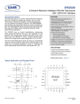 XR32220 2-Driver/2-Receiver Intelligent RS-232 Transceiver with 1.65V-5.5V Interface General Description FEATURES The XR32220 product is a 2 driver/ 2 receiver RS-232 transceiver featuring a variable low voltage logic interface, down to 1.65V. This product is intended for portable or hand-held applications such as notebook and palmtop computers. The XR32220EBER device feature slew-rate limited outputs for reduced crosstalk and EMI. The XR32220EUER device is optimized for high speed with data rates up to 1Mbps, easily meeting the demands of high speed RS-232 applications. • Meets true EIA/TIA-232-F Standards from a +3.0V to 5.5V power supply • Interoperable with EIA/TIA-232 and adheres to EIA/TIA-562 down to a +2.7V power source •1.65V to 5.5V Logic Interface VL pin • AUTO ON-LINE circuitry automatically wakes up from a 1A shutdown • Regulated Charge Pump yields stable RS-232 Outputs regardless of VCC variations The XR32220 uses an internal high-efficiency charge-pump power supply that requires only four 0.1μF capacitors in 3.3V operation. This charge pump combined with Exar's driver architecture allow the XR32220 to deliver compliant RS-232 performance from a single power supply ranging from +3.0V to +5.5V. • Enhanced ESD Specifications • ±15kV Human Body Model • ±15kV IEC61000-4-2 Air Discharge • ±8kV IEC61000-4-2 Contact Discharge • 250Kbps min transmission rate (speed grade B) • 1000Kbps min transmission (speed grade U) • -40°C to 85°C ambient operating temperature • Lead-free (RoHS 6) package The AUTO ON-LINE® feature allows the device to automatically "wake-up" during a shutdown state when an RS-232 cable is connected and a connected peripheral is turned on. Otherwise, the device automatically shuts itself down drawing less than 1μA. APPLICATIONS • Industrial and Single Board Computers • Industrial and Process Control Equipment • Point-Of-Sales Equipment • Building Security and Automation Ordering Information – page 13 Typical Application and Package Pinout VL VCC TTL/CMOS Inputs 0.1F RS-232 Outputs 9 T2OUT 6 T2IN VCC To -P Supervisor Circuit 14 Shutdown 15 OnLine 13 Status Auto On-line / Control R1IN 3 12 R1OUT TTL/CMOS Outputs 5K 11 R2OUT V+ VCC 23 22 21 20 19 24 T1OUT 5 T1IN 24 RS-232 Inputs R2IN 4 NC 1 18 VL NC 2 17 GND R1IN 3 XR32220 16 C1- R2IN 4 24 pin QFN (4x4mm) 15 Online T1OUT 5 14 T2OUT 6 13 7 8 9 10 11 12 R1OUT V- C1+ 0.1F R2OUT 10 20 T1IN 0.1F C2+ C2- V+ Charge Pump C2+ C1+ C1- 22 23 T2IN 21 16 C2- VCC NC 0.1F 0.1F 19 VL V- 18 NC 0.1F 5K GND 17 © 2014 Exar Corporation 1 / 13 Shutdown Status exar.comXR32220 Rev 1A XR32220 Absolute Maximum Ratings Output Voltage Stresses beyond those listed under Absolute Maximum Ratings may cause permanent damage to the device. Exposure to any Maximum Rating condition for extended periods may affect device reliability and lifetime. TxOUT.....................................................................±13.2V RxOUT, Status.............................................-0.3V to +6.0V Supply Voltage (VCC)...................................-0.3V to +6.0V Short-Circuit Duration Logic Interface Voltage (VL)................................VL ≤ VCC TxOUT.............................................................Continuous V+................................................................-0.3V to +7.0V Storage Temperature...............................-65°C to +150°C V-.................................................................+0.3V to -7.0V V+ + |V-| ....................................................................±13V ESD Rating RS-232 Bus pins ICC (DC VCC or GND current).............................±100mA HBM - Human Body Model....................................±15kV Junction Temperature...............................................125°C IEC614000-4-2 Air Discharge................................±15kV Input Voltages IEC614000-4-2 Contact Discharge..........................±8kV TxIN, ONLINE, Shutdown,..........................-0.3V to +6.0V RxIN..........................................................................±15V Operating Conditions Operating Temperature Range.....................-40°C to +85°C VCC Supply Range........................................... 3.0V to 5.5V VL I/O Supply Range(VL ≤ VCC)..................... 1.65V to 5.5V Thermal Information (24 Ld QFN (4x4mm)) JA .....................................................................39.2(°C/W) JC .....................................................................15.3(°C/W) © 2014 Exar Corporation 2 / 13 exar.com/XR32220 Rev 1A XR32220 Electrical Characteristics Unless otherwise noted: TA = -40°C to +85°C, VCC = 3.3V±10% or 5.0V±10%, VL = VCC Symbol Parameter Conditions Min Typ Max Units DC CHARACTERISTICS ICC1 Supply Current, Auto On-Line enabled All RxIN open, Online = GND, Shutdown = VL, VCC = VL = 3.3V, TxIN = VL or GND • 1.0 10 μA ICC2 Supply Current, Shutdown Shutdown = GND, VCC = VL = 3.3V, TxIN = VL or GND • 1.0 10 μA ICC3 Supply Current, Auto On-Line disabled Online = Shutdown = VL, no load, VCC = VL = 3.3V, TxIN = VL or GND • 0.3 1.0 mA TxIN, Online, Shutdown ; 1.65V≤ VL ≤ 5.5V & VL ≤ VCC • 1/3 * VL V LOGIC INPUTS AND OUTPUTS VIL Input Low Voltage VIH Input High Voltage IIL Input Leakage Current TxIN, Online, Shutdown ; TAMB = 25°C, VIN = 0V to VL IOL Output Leakage Current Status, RxOUT (Receivers disabled); VOUT = 0V to VL • VOL Output Low Voltage Status, RxOUT; IOUT = 1.5mA • VOH Output High Voltage Status, RxOUT; IOUT = -1.5mA • VL - 0.6 • 2/3 * VL V ±0.01 ±1.0 A ±0.05 ±10 A 0.4 V V DRIVER OUTPUTS VSWING Output Voltage Swing All drivers outputs loaded with 3K to GND • ±5.0 OR Output Resistance VCC = V+ = V- = 0V, VOUT = ±2V • 300 IOSC Output Short-Circuit Current VOUT = 0V • IOL Output Leakage Current VCC = 0V or 3.0V to 5.5V, VOUT = ±12V • ±5.4 V ±35 ±60 mA ±25 A +15 V RECEIVER INPUTS IVR Input Voltage Range VIL Input Low Voltage VIH Inpu