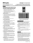 Fire Control Panels UL, ULC, CSFM Listed; FM Approved; MEA (NYC) Acceptance* Panel Mounted LED/Switch and LED Modules, LED/Switch Controllers, and Panel Mounted Printer Features Panel mounted annunciation modules for use with 4100ES/4100U Fire Alarm Control Panels, Remote Annunciators, and Network Display Units (NDU): Modules mount on front of panel bay providing convenient access and high visibility Panel monitors switches for user input and controls LED indicators to annunciate function status Compact 64 LED/64 switch controller modules mount on back of LED/switch modules LED/Switch Modules: Raised momentary switches provide tactile feedback Alternate action operation provides on/off functions High intensity LEDs provide clear status annunciation Slide-in labels provide custom on-site labeling (label kit is ordered separately) 8 LED, 8 Switch Modules: One status LED per switch Available as all red LEDs or all yellow LEDs 16 LED, 8 Switch Modules: Two status LEDs per switch Available with two LEDs per switch as: red/yellow, yellow/yellow, red/green, or green/yellow 16 LED, 16 Switch Modules: One status LED per switch in 2” (51 mm) module Available as all red LEDs, or 8 red and 8 yellow Two configurations are available, one with pluggable LEDs, refer to illustrations on page 2 and product selection details on page 4 24 LED, 24 Switch Modules: Double slot module with one red status LED per switch HOA (Hand-Off-Auto) Switch Modules: Eight controls in a double slot module, each control has three switches for status selection and one LED per switch position Switch selection is On/Hand, Off, and Auto Available with three HOA Module LED Options: On/Hand (green LED), Off (red LED) and Auto (green LED) On/Hand (green LED), Off (red LED) and Auto (white LED) to comply with International Building Code (IBC) requirements On/Hand (green LED), Off (yellow LED) and Auto (green LED) for applications requiring no red LEDs Available with or without switch buttons labels (On, Off, Auto) LED Modules with 8 or 16 pluggable LEDs: 8 LED Module has red LEDs, 16 LED module has 8 red with 8 yellow Red, yellow, green, or blue LEDs are available in packages of eight (8) to change color on-site per application requirement (ordered separately) Fire Zones Door Release Manual Alarms HVAC Controls HVAC Controls East Wing East Wing West Wing West Wing Off West Wing South Wing South Wing Auto Auto South Wing North Wing North Wing On On North Wing Annex East Wing East Wing West Wing Off Annex Annex Off Garage Garage Auto Auto Basement Basement On On Boiler Room Boiler Room Garage Basement Off South Wing Off Off Fan On Fan Off Smoke Alarms East Wing Annex Garage West Wing West Wing South Wing South Wing North Wing North Wing Annex Annex Basement Auto Auto Garage Garage On On Basement Basement Boiler Room Boiler Room Off Boiler Room East Wing On On Control North Wing Auto Off Auto Boiler Room 4100ES 2-Bay Fire Alarm Control Panel with Sample of Available LED/Switch Modules Features (Continued) 24 Point I/O Module for external connections: Each point is selectable as either a switch input (momentary or maintained) or lamp/relay driver output Multiple switch monitoring modes are available Panel mounted printer (see pages 6 and 7 for details): Records system events and provides 20 visible lines Listed to: UL Std. 864, Fire Detection and Control (UOJZ), and Smoke Control Service (UUKL) UL Std. 2017, Process Management Equipment (QVAX) UL Std. 1076, Proprietary Alarm Units-Burglar (APOU) UL Std. 1730, Smoke Detector Monitor (UULH) ULC Std. S527-99 Description Annunciation Options. 4100ES/4100U fire alarm panels support a variety of switch input and LED status indicators to complement the information and controls available at the operator interface. These modules provide a convenient interface efficiently packaged onto the front panel space of the cabinet bay. Additionally, the panel mounted printer can conveniently record system status without requiring a separately located printer. * Refer to additional listing details on page 4. This product has been approved by the California State Fire Marshal (CSFM) pursuant to Section 13144.1 of the California Health and Safety Code. See CSFM Listing 7165-0026:251 for allowable values and/or conditions concerning material presented in this document. It is subject to re-examination, revision, and possible cancellation. Additional listings may be applicable; contact your local Simplex® product supplier for the latest status. Listings and approvals under Simplex Time Recorder Co. are the property of Tyco Fire Protection Products. S4100-0032-11 7/2012 Description (Continued) The 24 Point I/O Module is selectable for input switch type and supervision type. Outputs are selectable for steady on or pulsing to drive remotely connected relays, incandescent lamps, or LEDs. Easy Interface. Switches are alternate action ON/OFF (depending on programming selection) using a tactile feel, raised rubber button. High efficiency LEDs provide clear status annunciation readily visible through the glass door. Selectable Functions. Switch functions, LED status indications, and printer output is selected when the control panel CPU is customized for site specific requirements. Slide-in labels are locally printed to indicate the exact function of the LEDs and switches. LED/Switch Module Detail Reference LED/Switch Modules LED Modules Label insert Primary function label Additional function labels Custom label area Switches LEDs Fan On Control Fan Off Designates area for each column of switches and LEDs East Wing West Wing South Wing Visible area 8-1/4" H, 2" W (210 mm x 51 mm) Switch North Wing Annex LEDs Garage Basement Boiler Room 8 Switches 16 Switches with 16 LEDs: with 16 LEDs: 4100-1282, R/Y 4100-1300, R/Y 4100-1283, Y/Y (pluggable LEDs) 4100-1284, R/G 4100-1296, G/Y 8 Switches with 8 LEDs: 4100-1280, R 4100-1281, Y 16 Switches with 16 LEDs: 4100-1278, R-Y 4100-1285, R LED Color Legend: Red, Yellow, Green; R