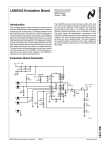 National Semiconductor Application Note 1791 Dennis Hudgins October 1, 2008 Introduction The LM20333 evaluation board has been optimized to work from 4.5V to 25V achieving a balance between overall solution size with the efficiency of the regulator. The evaluation board measures just under 2” x 2” on a four layer PCB, and exhibits a thermal characteristic of 27 °C/W with no air flow. The power stage and compensation components of the LM20333 evaluation board have been optimized for an input voltage of 12V, but for testing purposes, the input can be varied across the entire operating range. The output voltage of the evaluation board is nominally 3.3V, but this voltage can be easily changed by replacing one of the feedback resistors (R5 or R6). This evaluation board provides a solution to examine the full featured LM20333 buck switching regulator that is capable of driving up to 3A of load current. This device features a clock synchronization input that allows the switching frequency to be synchronized to an external clock source. The flexibility to synchronize the switching frequency from 250 kHz to 1.5 MHz allows the size of the power stage components to be reduced while still allowing for high efficiency. The LM20333 is capable of down converting from an input voltage between 4.5V and 36V. Fault protection features include cycle-by-cycle current limit, output power good, and output over-voltage protection. The dual function soft-start/tracking pin can be used to control the startup response of the LM20333, and the precision enable pin can be used to easily sequence the LM20333 in applications with sequencing requirements. LM20333 Evaluation Board LM20333 Evaluation Board Evaluation Board Schematic 30051301 AN-1791 © 2008 National Semiconductor Corporation 300513 www.national.com AN-1791 Step 7: The pull-up voltage for PGOOD can be selected by using the JP1 shunt to connect VPULLUP to VOUT or VCC. Step 8: The frequency of operation can be varied as desired by connecting a signal Powering and Loading Considerations Read this entire page prior to attempting to power the evaluation board. POWERING UP It is suggested that the load power be kept low during the first power up. Set the current limit of the input source to provide about 1.5 times the anticipated wattage of the load. Once the device is powered up, immediately check for 3.3 volts at the output. A quick efficiency check is the best way to confirm that everything is operating properly. If something is amiss you can be reasonably sure that it will affect the efficiency adversely. Few parameters can be incorrect in a switching power supply without creating losses and potentially damaging heat. QUICK SETUP PROCEDURE Step 1: Set the input source current limit to 3A. Turn off the input source. Connect the positive output of the input source to J1 and the negative output to J2. Step 2: Connect the load, with 3A capability, to J3 for the positive connection and J4 for the negative connection. Step 3: The ENABLE pin, J5, should be left open for normal operation. Step 4: Set the input source voltage to 12V and the load to 0.1A. The load voltage should be in regulation with a nominal 3.3V output. Step 5: Slowly increase the load while monitoring the load voltage at J3 and J4. It should remain in regulation with a nominal 3.3V output as the load is increased up to 3 Amp. Step 6: Slowly sweep the input source voltage from 4.5V to 25V. The load voltage should remain in regulation with a nominal 3.3V output. If desired the output of the device can be disabled by connecting the ENABLE pin (J5) to GND (J8). OVER CURRENT PROTECTION The evaluation board is configured with cycle-by-cycle overcurrent protection. This function is completely contained in the LM20333. The peak current is limited to approximately 5.2A. Connection Descriptions Terminal Silkscreen Description VIN This terminal is the input voltage to the device. The evaluation board will operation over the input voltage range of 4.5V to 25V. This voltage is limited due to the voltage rating of the input capacitors. GND These terminals are the ground connections to the device. There are three different GND connections on the PCB. J2 should be used for the input supply, J4 should be used for the load, and J8 should be used for low power signal connections such as ENABLE. VOUT This terminal connects to the output voltage of the power supply and should be connected to the load. ENABLE This terminal connects to the enable pin of the device. This terminal can be left floating or driven externally. If driven externally, a voltage typically less than 1.2V will disable the device. The operating voltage for this pin should not exceed 5.5V. The absolute maximum voltage rating on this pin is 6V. SS/TRK This terminal provides access to the SS/TRK pin of the device. Connections to this terminal are not needed for most applications. The feedback pin of the device will track the voltage on the SS/TRK pin if it is driven with an external voltage source that is below the 0.8V reference. The voltage on this pin should not exceed 5.5V during normal operation. The absolute maximum voltage rating on this pin is 6V. PGOOD This terminal connects to the power good output of the device. There is an option to connect this pin to VOUT or VCC through a 10 kΩ pull-up resistor. The voltage on this pin should not exceed 5.5V during normal operation and has an absolute maximum voltage rating of 6V. JP1 This terminal block selects the pull-up voltage for the PGOOD pin to be either VCC or VOUT. An external voltage source for PGOOD may be supplied by connecting to the center terminal. The voltage applied to PGOOD should not exceed 5.5V during normal operation and has an absolute maximum voltage rating of 6V. SW This terminal allows easy probing of the switch node. Do not apply any external voltage source to this pin. TP1 (VOUT) This is a oscilloscope probe connector point used to measure the output ripple and transient 