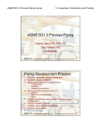 ASME B31.3 Process Piping Course 13. Inspection, Examination and Testing ASME B31.3 Process Piping Charles Becht IV, PhD, PE Don Frikken, PE Instructors BECHT ENGINEERING COMPANY, INC. Inspection, Examination and Testing - 1 Piping Development Process 1. Establish applicable system standard(s) 2. Establish design conditions 3. Make overall piping material decisions Pressure Class Reliability Materials of construction 4. Fine tune piping material decisions Materials Determine wall thicknesses Valves 5. Establish preliminary piping system layout & support configuration 6. Perform flexibility analysis 7. Finalize layout and bill of materials 8. Fabricate and install 9. Examine and test BECHT ENGINEERING COMPANY, INC. Inspection, Examination and Testing - 2 ASME B31.3 Process Piping Course 13. Inspection, Examination and Testing 13. Inspection, Examination & Testing ¾ Inspection ¾ Examination Methods Requirements Acceptance Criteria ¾ Leak Testing Methods Requirements BECHT ENGINEERING COMPANY, INC. Inspection, Examination and Testing - 3 The Material in This Section is Addressed by B31.3 in: Chapter VI - Inspection, Examination and Testing BECHT ENGINEERING COMPANY, INC. Inspection, Examination and Testing - 4 ASME B31.3 Process Piping Course 13. Inspection, Examination and Testing Inspection “(4) Owner's Inspector. The owner's Inspector (see para. 340) is responsible to the owner for ensuring that the requirements of this Code for inspection, examination, and testing are met...” [300(b)] “This Code distinguishes between examination (see para. 341) and inspection. Inspection applies to functions performed for the owner by the owner’s Inspector or the Inspector’s delegates.” [340.1] BECHT ENGINEERING COMPANY, INC. Inspection, Examination and Testing - 5 Inspection The owner’s inspector: Verifies that all required examinations and testing have been completed Has access to any place where work is being performed Must be independent of organizations performing fabrication, examination, installation or testing Must have 10 years experience or 5 years experience plus an engineering degree BECHT ENGINEERING COMPANY, INC. Inspection, Examination and Testing - 6 ASME B31.3 Process Piping Course 13. Inspection, Examination and Testing Examination “Examination applies to quality control functions performed by the manufacturer (for components only), fabricator, or erector. Reference in this Code to an examiner is to a person who performs quality control examinations.” [341.1] BECHT ENGINEERING COMPANY, INC. Inspection, Examination and Testing - 7 Examination The examiner: Examines piping in accordance with Code requirements Examines piping is accordance with additional requirements described in the engineering design Prepares suitable examination records for use by the inspector Shall have training and experience commensurate with the needs of the specified examinations BECHT ENGINEERING COMPANY, INC. Inspection, Examination and Testing - 8 ASME B31.3 Process Piping Course 13. Inspection, Examination and Testing Examination Examination is performed in order to assure that: Components conform to the specifications for • Material of construction • Design • Freedom from defects Piping is installed with the proper • Support • Alignment • Joint assembly Discontinuities are sufficiently small that they don’t grow into leaks during operation BECHT ENGINEERING COMPANY, INC. Inspection, Examination and Testing - 9 Typical Weld Imperfections Lack of Fusion Incomplete Penetration Excess Reinforcement Suck Up BECHT ENGINEERING COMPANY, INC. Inspection, Examination and Testing - 10 ASME B31.3 Process Piping Course 13. Inspection, Examination and Testing Examination Methods Examination methods include Visual (VT) Positive Material Identification (PMI) Liquid Dye Penetrant (PT) Magnetic Particle (MT) Radiography (RT) Ultrasonic (UT) In-Process BECHT ENGINEERING COMPANY, INC. Inspection, Examination and Testing - 11 Examination Methods Visual – Includes examination of materials, fabrication (welds), supports, and installation. Least expensive Most effective BECHT ENGINEERING COMPANY, INC. Inspection, Examination and Testing - 12 ASME B31.3 Process Piping Course 13. Inspection, Examination and Testing Examination Methods Positive Material Identification – Verifies material of construction is as specified. The ruptured hose should have had an Alloy C-276 exterior metal braiding. Instead, the braiding was stainless steel and was easily corroded by chlorine permeation through the Teflon liner. The hose failed after less than 2 months of service. Both the purchase and shipping papers indicated that the hose was constructed of the proper materials, but it was not. (CCPS Beacon, Aug ’04) BECHT ENGINEERING COMPANY, INC. Inspection, Examination and Testing - 13 Examination Methods Positive Material Identification – Verifies material of construction is as specified. X-ray fluorescence – Sample is exposed to low radioactive or x-rays. Reflected energy is different for every element. This energy is measured, thus identifying the alloy elements. BECHT ENGINEERING COMPANY, INC. DCI, Inc. Inspection, Examination and Testing - 14 ASME B31.3 Process Piping Course 13. Inspection, Examination and Testing Examination Methods Positive Material Identification – Verifies material of construction is as specified. Spark emission spectrography - A spark is released that vaporizes a small portion of the sample. The instrument optically measures the atoms in the vapor to determine the components of the material. BECHT ENGINEERING COMPANY, INC. Spectro Inspection, Examination and Testing - 15 Examination Methods Liquid Dye Penetrant – Employs a dye penetrant applied to the surface and a developer. This method is used to detect fine cracks. BECHT ENGINEERING COMPANY, INC. Inspection, Examination and Testing - 16 ASME B31.3 Process Piping Course 13. Inspection, Examination and Testing Examination Met