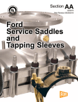 O 90 01: 50 IS 5 THE FOR D NY, INC. PA M BOX C TER O ME 2 0 0 8 10 0 02 Section AA 02/2015 Web Revision 09/28/2016 Ford Service Saddles and Tapping Sleeves Contents Recommended Product Application Page *Steel Size PVC *C900 PVC Cast Ductile Iron Iron AC **HDPE Version Available Product Numbering System. . . . . . . . . . . . . . . . . . . . 3 & 4 Ford Ultra-Seal Cap Style Flange Gasket. . . . . . . . . . . . 4 Mechanical Joint Adapter Outlet Option. . . . . . . . . . . . . 5 † Tapping Sleeve Specifications. . . . . . . . . . . . . 6, 8, 10, 12 FAST . . . . . . . . . . . . . . . . . . . . . . . . . . . . . . . . . . . . . . 7. . . . . YES . . . . . YES. . . . . YES. . . . . YES. . . . . YES . . . **AVAILABLE FTSS . . . . . . . . . . . . . . . . . . . . . . . . . . . . . . . . . . . . . . 9. . . . . YES . . . . . YES. . . . . YES. . . . . YES. . . . . YES . . . **AVAILABLE FTSAS . . . . . . . . . . . . . . . . . . . . . . . . . . . . . . . . . . . . 11. . . . . YES . . . . . YES. . . . . YES. . . . . YES. . . . . YES . . . . . . . NO FTS. . . . . . . . . . . . . . . . . . . . . . . . . . . . . . . . . . . . . . . 13. . . . . YES . . . . . YES. . . . . YES. . . . . YES. . . . . YES . . . **AVAILABLE FTSC . . . . . . . . . . . . . . . . . . . . . . . . . . . . . . . . . . . . . 13. . . . . YES . . . . . YES. . . . . YES. . . . . YES. . . . . YES . . . **AVAILABLE Brass Saddle Specifications . . . . . . . . 14, 16, 18, 20 & 22 S40, S41 (For Type K Copper Tubing) . . . . . . . . . . . 15 S70, S71 . . . . . . . . . . . . . . . . . . . . . . . . . . . . . . . . . . 17. . . . . YES . . . . . NO . . . . . NO . . . . . NO. . . . . NO . . . . . . . NO S90, S91 . . . . . . . . . . . . . . . . . . . . . . . . . . . . . . . . . . 19. . . . . . NO. . . . . . YES. . . . . NO . . . . . NO. . . . . NO . . . . . . . NO S902, S912 . . . . . . . . . . . . . . . . . . . . . . . . . . . . . . . . 19. . . . . . NO. . . . . . YES. . . . . NO . . . . . NO. . . . . NO . . . . . . . NO 101B, 202B . . . . . . . . . . . . . . . . . . . . . . . . . . . . . . . . 21. . . . . . NO. . . . . . NO . . . . . YES. . . . . YES. . . . . YES . . . . . . . NO 101BS, 202BS. . . . . . . . . . . . . . . . . . . . . . . . . . . . . . 23. . . . . *YES. . . . *YES. . . . . YES. . . . . YES. . . . . YES . . . . . . . NO 202BSD . . . . . . . . . . . . . . . . . . . . . . . . . . . . . . . . . . . 24. . . . . *YES. . . . *YES. . . . . YES. . . . . YES. . . . . YES . . . . . . . NO Iron Saddle Specifications. . . . . . . . . . . . . . . . . . . . . . . 25 F101, F202. . . . . . . . . . . . . . . . . . . . . . . . . . . . . 26 & 27. . . . . . NO. . . . . . NO . . . . . YES. . . . . YES. . . . . YES . . . . . . . NO FS101, FS202, FSD202. . . . . . . . . . . . . . . . . . . 26 - 29. . . . . *YES. . . . *YES. . . . . YES. . . . . YES. . . . . YES . . . **AVAILABLE FC101, FC202, FCD202 . . . . . . . . . . . . . . . . . . 26 - 29. . . . . *YES. . . . *YES. . . . . YES. . . . . YES. . . . . YES . . . **AVAILABLE Fabricated Steel Saddle Specifications . . . . . . . . . . . . 30 F202. . . . . . . . . . . . . . . . . . . . . . . . . . . . . . . . . . . . . . 31. . . . . . NO. . . . . . NO . . . . . YES. . . . . YES. . . . . YES . . . . . . . NO FS202. . . . . . . . . . . . . . . . . . . . . . . . . . . . . . . . . . . . . 31. . . . . *YES. . . . *YES. . . . . YES. . . . . YES. . . . . YES . . . **AVAILABLE Stainless Steel Saddle Specifications. . . . . . . . . . . . . . 32 FS300 Series. . . . . . . . . . . . . . . . . . . . . . . . . . . . . . . 33. . . . . YES . . . . . YES. . . . . YES. . . . . YES. . . . . YES . . . **AVAILABLE Repair Saddles FRS202 . . . . . . . . . . . . . . . . . . . . . . . . . . . . . . . . . . . 34. . . . . . NO. . . . . . YES. . . . . YES. . . . . YES. . . . . YES . . . . . . . NO Sewer Saddle FSS. . . . . . . . . . . . . . . . . . . . . . . . . . . . . . 35 * All 101BS, 202BS, FS101, FC101, FS202, FC202, FSD202 O.D. Chart. . . . . . . . . . . . . . . . . . . . . . . . . . . . . . . . . . . . . 36 and FCD202 Saddles recommended for C900 or steel size PVC require sizes specific to the pipe O.D. 101B, 202B, Warranty. . . . . . . . . . . . . . . . . . . . . . . . . . . . . . . . . . . . . . 40 F101 and F202 Saddles are not for use on PVC pipe and do † See catalog section N for style FWS steel weld-on not comply with AWWA and Uni-Bell stipulations for use tapping sleeves. on PVC pipe. ** Specific products are available for use on HDPE, see catalog pages for details. Ford offers many products that are Classified by Underwriters Laboratories Inc. to ANSI/NSF Standard 61. To verify if a product is Classified by Underwriters Laboratories Inc. to ANSI/NSF Standard 61, contact the Ford Meter Box Customer Service Department at 260-563-3171 or visit fordmeterbox.com. Ford Meter Box meets your need for ANSI/NSF Standard 61 Approved items with products that are proven and reliable. Information Ford Service Saddles are used to install corporation stops on water main pipe including iron, PVC, and asbestos-cement. Saddles constructed of ductile iron, brass, or stainless steel are available in all the popular sizes and for most metric-sized pipe. Saddles feature 3/4" through 2" tapped outlets manufactured to ANSI/AWW A C800. Fabricated steel saddles are also available in 3" and 4" iron pipe thread outlets Ductile iron saddles are available with either single or double (electro-galvanized) steel straps or with optional stainless steel bands. Brass saddles are cast of 85-5-5-5 waterworks brass. The popular S70 and S90 series feature a hinged design and the 101B and 202B series incorporate silicon bronze straps or optional stainless steel bands. Tapping sleeves of fabricated steel and stainless steel complete the Ford line of tapping devices. Tapping sleeves having a flange outlet conform to AWW A C207 Class D-ANSI 150 lb. drilling and the standard sizes have been optimized for U.S. Pipe Standards. Flanges conforming to alternate AWW A or i