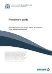 Presenter’s guide Preventing injuries from manual tasks in the workplace A risk management approach To present this workshop, the presenter must be familiar with the contents of this guide and have an interest in manual tasks. It is desirable for the presenter to have some background knowledge about manual tasks, manual task injuries, how the human body works, and risk management for manual tasks. For example, it would be beneficial if the presenter has participated in past training/education relevant to some or all of the above topics. This would allow the presenter to be better able to answer questions that may arise from participants. The workshop has been designed to run for three hours. Section 1: PRESENTER’S GUIDE PREVENTING INJURIES FROM MANUAL TASKS IN THE WORKPLACE Introduction This guide contains information about the workshop, background information for the presenter and additional resource documents to be used during the workshop. This guide has been designed to be used in conjunction with the ‘Preventing injuries from manual tasks in the workplace: a risk management approach’ power-point presentation. Notes for each power-point slide have been presented in this guide and provided under the ‘notes’ section of each power point slide. Legend Presenter’s information Background information Case study The workshop has been designed to run for three hours, the first two hours being the power point presentation, and the third hour being the group activities. The contents of the workshop has been detailed in a workshop plan (please refer to Appendix 1 for a copy of the Workshop Plan). Presenters are encouraged to modify the Workshop Plan to suit their audience and style. To present this workshop, the presenter must be familiar with the contents of this guide and have an interest in manual tasks. It is desirable for the presenter to have some background knowledge about manual tasks, manual task injuries, how the human body works, and risk management for manual tasks. For example, it would be beneficial if the presenter has participated in past training/education relevant to some or all of the above topics. This would allow the presenter to be better able to answer questions that may arise from participants. This training program has been designed to be interactive, where participants learn to problem solve manual task issues during activities (refer to Appendix 2 for Workshop Resources) and learn how to apply the risk management approach for potentially hazardous manual tasks (see Appendix 3 for Manual Tasks Risk Management Forms). The training should be competency based (where participants are able to display their knowledge of key elements of the programme) and the principles of adult learning should be applied. This workshop forms part of the requirements for manual tasks training as outlined in the Commission for Occupational Safety and Health Code of practice: Manual tasks (2010). It is not designed to replace practical or task specific training, but instead should be provided together with practical training. It should also be noted that depending on the individual workplace and the manual tasks completed within the workplace, more detailed information may be required than what is provided in this package. Section 1 – Presenters Guide i PREVENTING INJURIES FROM MANUAL TASKS IN THE WORKPLACE Contents Presenter’s information ............................................................................................... 1 Definitions ................................................................................................................... 3 The legal framework.................................................................................................... 4 Injuries from manual tasks .......................................................................................... 7 Anatomy and biomechanics ...................................................................................... 10 The Commission for Occupational Health Code of practice: Manual tasks (2010) ..................................................................... 21 Risk Management – Legal Framework ..................................................................... 23 Hazard Identification (spotting the problem) ............................................................. 24 Risk assessment (understanding the problem)......................................................... 26 Risk factors ............................................................................................................... 28 Risk Control (dealing with the problem) .................................................................... 40 Case studies ............................................................................................................. 52 Group Summary and conclusion............................................................................... 57 Appendix 1 Workshop Plan....................................................................................... 58 Appendix 2 Workshop Resources............................................................................. 61 Appendix 3 Manual Tasks Risk Management Forms................................................ 67 Please note: Prior to the course please print Appendix 2: Who’s Responsible? Print out enough forms for each participant. Case studies worksheets. Print out the case studies required, or print out scenarios specific to the participants’ workplace. (One worksheet per participant). Appendix 3: Manual Tasks Risk Management Forms Print out enough forms for each participant. Section 1 – Presenters Guide ii PREVENTING INJURIES FROM MANUAL TASKS IN THE WORKPLACE Presenter’s information There are many manual tasks that contribute to the risk of injury. The best way to manage these risks is through a systematic process of hazard identification, risk assessment and risk control. So at the end of the workshop you should be a