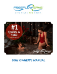 50Hz OWNER'S MANUAL FREEFLOW OWNER'S MANUAL 230V 50Hz System Owner's Record Locating the Spa Serial Number: The spa serial number label is located on control box cover inside the equipment compartment. Equipment compartment access panel is below the spas 4-button topside control panel. You will need the spa model and serial number to properly register your spa and activate coverage. Write your spa information in the space provided. DATE PURCHASED: PURCHASED FROM: SPA MODEL: See page 7 SERIAL NUMBER: Please read this Owner’s Manual carefully, as it is designed to provide you with the information you will need to ensure the safe, secure use of your spa. IMPORTANT: Watkins Manufacturing Corporation reserves the right to change specifications and/or design without notification and without any obligation. SPA DIMENSIONS & WEIGHT Model Spa Seating Length Width Height Dry Weight Mini™ 2 person 183 cm 119 cm 71 cm 113 kg Tristar™ 3 person 183 cm 183 cm 79 cm 137 kg Azure™ 4 person 206 cm 160 cm 84 cm 151 kg Cascina™ 4 person 157 cm 178 cm 81 cm 125 kg Excursion™ Aptos™ 5 person 5 person 218 cm 198 cm 196 cm 198 cm 84 cm 86 cm 202 kg 163 kg Monterey™ 7 person 221 cm 196 cm 87 cm 171 kg Liters 435 776 946 814 965 984 1230 All spas above use a 5 m² filter. CAUTION DO NOT OPERATE SPA BEFORE READING THIS MANUAL Failure to read this manual and follow its instructions may result in unsafe operation and or permanent damage to your portable spa. Most cities, counties, states, and countries require permits for exterior construction and electrical circuits. In addition, some communities have codes requiring residential barriers such as fencing and/or self-closing gates on the property to prevent unsupervised access to a pool or spa by children. Be sure to check with your local agencies for specific requirements. If you need additional information and/or assistance, please contact your local Dealer. TABLE OF CONTENTS TITLEPAGE SAFETY INFORMATION IMPORTANT SAFETY INSTRUCTIONS.....................................................................................................................................1 IMPORTANT SPA INSTRUCTIONS.............................................................................................................................................4 INSTALLATION PLANNING A LOCATION FOR YOUR SPA................................................................................................................................5 PLACING THE SPA.......................................................................................................................................................................6 EQUIPMENT ACCESS EQUIPMENT ACCESS PANEL....................................................................................................................................................7 ELECTRICAL REQUIREMENTS ELECTRICAL REQUIREMENT....................................................................................................................................................8 CONFIGURING SYSTEM ............................................................................................................................................................9 CONTROL PANEL OPERATION TEMPERATURE ADJUSTMENT (26°C - 40°C)........................................................................................................................10 JETS OPERATION......................................................................................................................................................................10 MULTI COLOR LED LIGHT........................................................................................................................................................10 FILTER CYCLES .........................................................................................................................................................................10 OPERATIONAL MODE ..............................................................................................................................................................11 SMART WINTER MODE ............................................................................................................................................................11 DIAGNOSTIC LCD MESSAGE.................................................................................................................................................12 COMPONENT OPERATION SPA COMPONENT OPERATION..............................................................................................................................................13 FILL UP AND START-UP INSTRUCTIONS FILLING THE SPA WITH WATER..............................................................................................................................................14 APPLYING POWER....................................................................................................................................................................14 ADDING START-UP CHEMICALS WATER CHEMISTRY GUIDELINES..........................................................................................................................................15 SPA MAINTENANCE FILTER CARTRIDGE MAINTENANCE.....................................................................................................................................16 SURFACE CARE.........................................................................................................................................................................17 COVER CARE.............................................................................................................................................................................17 CABINET CARE ..........................................................................................................................................................................17 SPA LED REP