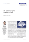 the cutting | EDGE CPD POINTS AVAILABLE Continuing Education credits are available on this article for subscribers by answering the questionnaire at www.dentalpractice.com.au LED operating lights in dental practice By Professor Laurence J. Walsh n recent years, there have been dramatic developments in the technology and performance of light emitting diodes (LEDs), to the point that arrays of LEDs are now suitable for replacing conventional operating lights. Such lights have been used in head mounted lights for some years and this author uses both Heine and Orascoptic high intensity LED headlights in clinical work. There are now LED arrays which replace operating lights (Figure 1) and this article explains their operation and contrasts aspects of their performance with conventional light sources. The long life of high intensity LEDs and the corresponding reduction in maintenance costs explains why they are now used routinely in traffic lights, emergency lights, aircraft cabin lighting, automotive lighting and the like. A 12 Watt Luxeon™ array fully replaces a 150 Watt bulb in a traffic signal, reducing maintenance costs over their 10-15 year lifetime, as well as giving a saving in energy costs of 50%. Because of the low total cost of ownership, high intensity LED street lighting is now being introduced, with 50% less power consumption than mercury vapour lamps and 6-10 times longer life for the same level of illumination.1-3 I “there have been dramatic developments in the technology and performance of light emitting diodes (LEDs), to the point that arrays of LEDs are now suitable for replacing conventional operating lights...” Conventional halogen lights Quartz tungsten halogen (QTH) lamps are the standard lighting component found in a dental operating light. These lamps are driven by the low voltage (12 volt) circuit of the dental unit. Most units offer adjustment of the drive current using a 48 Australasian Dental Practice Figure 1. The Pelton & Crane Helios 3000 LED light is a replacement for halogen operating lights. variable resistor arrangement or via software control. There is an inherent problem in adjusting the intensity of the light. As the current to the lamp is reduced and its output dims, the colour temperature reduces and the light shifts from white to orangered, rather than remaining white. Inside the halogen lamp itself, a tungsten filament is encased inside a quartz envelope, with an outer glass envelope. The envelope protects the glass from melting because of the very high temperature of the filament. The gas inside the envelope is a halogen gas (such as xenon) which combines with tungsten atoms as they evaporate from the filament, and redeposits them back onto the filament. All the components inside the lamp operate at very high temperatures. May/June 2009 the cutting | EDGE Figure 2. Operating lights. Panel A shows the lamp and reflector of a conventional quartz tungsten halogen lamp. The reflector absorbs infrared wavelengths and becomes hot during use. Some light is also transmitted through the rear of this glass reflector. Panel B shows the highly reflective and completely non-transmissive surface of the reflector in the Pelton & Crane Helios 3000 LED light. Panel C shows one of the dual control panels of the Helios 3000, which control intensity, safe non-curing mode, and colour temperature. Each light is factory calibrated to deliver the specified colour temperatures of white light. The light is emitted from the single tungsten filament in the lamp in all directions and despite the action of a parabolic lens (Figure 2), the light is brighter in the middle and dimmer at the edges of the focussed spot. QTH lamps generate a broad range of wavelengths, from ultraviolet through to infrared, requiring the use of expensive filters in the reflectors to prevent the long (infrared) wavelengths being shone onto the patient’s face. These same wavelengths also cause heating and degradation of components in the operating light made of plastic and other materials. The conversion efficiency of these units, calculated from the useful visible light divided by the electrical energy input, is relatively low, at some 5-10%. In practical terms, this means that much more of the energy is dissipated into the reflector and frame of the light and into the operatory environment as heat, than onto the patient’s face. LEDs as a light source LEDs can generate coloured visible light, which is spectrally narrow and near coherent (i.e. pure in colour) (Figure 3). A range of colours from LEDs are available, ranging from ultraviolet, violet, indigo, May/June 2009 Figure 3. Emission spectra of blue, green and red LEDs recorded on a high resolution Ocean Optics spectrophotometer in the author’s laboratory. The graph shows their normalized optical intensities (not their apparent intensities to the human eye, which is much more sensitive to green) versus wavelength. The visible spectrum from 400-700 nm is also indicated. Australasian Dental Practice 49 the cutting | EDGE Figure 4. Components of a typical high intensity LED unit constructed by the author. A, from left, Luxeon high intensity LED, lens, and heatsink. B, Pulse width modulation controller, used to vary the light output of the individual Luxeon LEDs. Figure 5. Three high intensity Luxeon LED lights assembled as in Figure 4 with lenses and heatsinks, and driven with identical current. Note how the simple combination of one red, one green and one blue does not give white - much more green is required. Note also how the apparent brightness of the red LED is greatest, despite the same drive current. Figure 6. Digital lux meter used to measure light intensity levels. The reading shown is taken when the Helios 3000 light was operated at its highest intensity, giving 29,900 lux. blue, turquoise, cyan, aqua green, yellow, amber, orange and red-orange through to several varieties of red. The emitted colour depends on the configuration of t