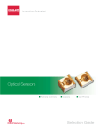 Innovations Embedded Optical Sensors Remote ROHM MarketingUSA Controls Copiers Cell Phones Selection Guide Optical Sensors from ROHM Semiconductor ROHM Infrared Optical Sensors operate in the near infrared range (700nm - 1400nm) of the electromagnetic spectrum and are ideal for optical sensing and optical communications since IR is easy to implement as the signal source. In this range, optical sensors are used in industrial, consumer and other applications for sensing movement, position, proximity, ambient light, speed (encoders) and direction of motion. In particular, ROHM’s product lineup includes both through-hole and surface mount parts in the following categories: Infrared emitters Infrared sensors/phototransistors Photointerrupters Tilt sensors IrDA communication modules Remote control module receivers Optical wireless communication uses IR data transmission for short range applications such as computer peripherals and PDAs. Infrared Data Association (IrDA) standards are normally used for these signals. For optical communication, a modulated IR light beam transmitted by an emitter LED is received by a silicon photodiode/ transistor. Since IR does not penetrate walls, it does not interfere with other signals in indoor environments. This makes IR technology the most commonly used technique for remotely controlling appliances. The following is a list of some general applications for Infrared PhotoOptics: Office Automation (OA) equipment such as copiers, fax machines and printers Vending machines Amusement and gaming products Home entertainment products Medical / healthcare equipment. Banking terminals such as ATMs Testing equipment such as IC/LSI testers, encoders and more ROHM’s Product Focus 1.888.775.ROHM www.rohm.com/us 1 CNA11003_sg Optical Sensors from ROHM Semiconductor Important Benefits of ROHM Optical Sensors 40 years of IR Sensor Product Advancement For over 40 years, ROHM has been a leading solution provider of photooptic sensors for consumers in the commercial and printer markets. 100% Recent advances in GaAIAs high energy band gap technology from ROHM have 80% p resulted in the development of IR emitters with 800-950nm wavelength and fast 40% response times. LOSS 60% Phototransistor (typical) Emitter (typical) 20% In addition, fully automated double molding THD and SMD packaging production lines designed and developed by ROHM Semiconductor contribute ROHM Emitter 0% 500 600 700 800 900 1000 1100 Wavelength (nm) to high reliability and accurate mounting. Industry’s Widest Product Line ROHM offers IR sensors including discrete IR LEDs and transistor sensors, fully integrated remote control receivers, IrDA transmitters, photointerrupters and customized sensor detection devices. IR LEDs and transistor sensor products are offered in packages ranging from standard T1, T11/4 packages to very small low profile (0.9mm) SMD top view and side view packages, all featuring ambient light resistance with wide or narrow viewing angles. These devices are suitable for remote control transmitters, games, security, industrial applications and proximity detection. Integrated products such as photointerrupters and reflectors are offered in a variety of package sizes and different gap and slit widths. High accuracy detection due to double molding technology makes them ideal for printer applications, including paper/door detection and motor rotation/position sensing. Tilt sensors offered in small, low profile, low noise SMD packages are applicable for orientation detection and image rotation in digital cameras, cell phones, tablet computers and other handheld devices. ROHM IR receivers and IrDA communication devices with integrated LSI/IR components operate at low voltage and low power consumption, while internal filters and shielding contribute to low noise operation and greater EMI resistance. Custom Product Development ROHM is directly engaged with leading product manufacturers of consumer, medical, industrial and security products. By utilizing proprietary technologies and manufacturing expertise achieved over the years, ROHM is able to support special designs and custom solutions ranging from low power IR chips to custom packaging. 1.888.775.ROHM www.rohm.com/us 2 CNA11003_sg Optical Sensors Featured Products See all IR Emitters IR Emitters SIM-040ST / SIM-041ST ROHM’s latest low profile lineup of IR emitters is designed specifically with a peak wavelength of 3.1 870nm/850nm which is close to the peak wave sensitivity of phototransistors (sensors), resulting in 2.25 higher efficiency output and up to 66% in energy savings. (1.2) Applications Light source for proximity sensors Signal transmission 1.6 Important Features 0.65 Improved peak wavelength of 870nm/850nm Compact and low profile (1.6mm x 3.1mm x 2.25mm) High output (40mW typical) Narrow viewing angle (±17.5 degrees) Excellent temperature characteristics Long life, high reliability DESIGN NOTE 0.65 1.8 1.95 0.15 0.15 66% More Efficient 100% Relative Output 80% With energy losses minimized, the SIM-040ST infrared emitter is 66% more efficient than traditional components. LOSS 60% Phototransistor (typical) 40% Emitter (typical) 20% ROHM Emitter 0% 600 500 700 800 900 1000 1100 Wavelength (nm) Forward Current (IF) Part No. Power Dissipation (VR) Operating Temperature (TOPR) Minimum Emitting Strength (IE) Forward Voltage (VF) Peak Emitting Wavelength (OP) Half Viewing Angle (I1/2) Response Time (tr.tf) mA mW °C mW/sr V nm deg μs SIM-040ST 100 180 -25 to 85 40 1.7 870 ±20 0.1 SIM-041ST 100 180 -25 to 85 40 1.7 850 ±20 0.1 1.888.775.ROHM www.rohm.com/us 3 CNA11003_sg Optical Sensors Featured Products See all IR Emitters IR Emitters SIM-030ST / SIM-031ST ROHM’s latest low profile lineup of IR emitters is designed specifically with a peak wavelength of 870nm/850nm 2.3 which is close to the peak wave sensitivity of 1.95 phototransistors (sensors), resulting in higher efficiency output and up to 66% in energy savings. (1.3) (1.0