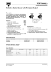 TCRT5000(L) Vishay Semiconductors Reflective Optical Sensor with Transistor Output Description TCRT5000 TCRT5000L The TCRT5000 and TCRT500L are reflective sensors which include an infrared emitter and phototransistor in a leaded package which blocks visible light. The package includes two mounting clips. TCRT5000L is the long lead version. C A E C Features • Package type: Leaded • Detector type: Phototransistor • Dimensions: e2 L 10.2 mm x W 5.8 mm x H 7.0 mm • Peak operating distance: 2.5 mm • Operating range: 0.2 mm to 15 mm • Typical output current under test: IC = 1 mA • Daylight blocking filter • Emitter wavelength 950 nm • Lead (Pb)-free soldering released • Lead (Pb)-free component in accordance to RoHS 2002/95/EC and WEEE 2002/96/EC 19156 Top view Applications • Position sensor for shaft encoder • Detection of reflective material such as paper, IBM cards, magnetic tapes etc. • Limit switch for mechanical motions in VCR • General purpose - wherever the space is limited Order Instructions Part Number Remarks Minimum Order Quantity TCRT5000 3.5 mm lead length 4500 pcs, 50 pcs/tube TCRT5000L 15 mm lead length 2400 pcs, 48 pcs/tube Absolute Maximum Ratings Tamb = 25 °C, unless otherwise specified Input (Emitter) Symbol Value Reverse voltage Parameter Test condition VR 5 V Forward current IF 60 mA Forward surge current tp ≤ 10 µs Power dissipation Tamb ≤ 25 °C Junction temperature Document Number 83760 Rev. 1.6, 04-Sep-06 Unit IFSM 3 A PV 100 mW Tj 100 °C www.vishay.com 1 TCRT5000(L) Vishay Semiconductors Output (Detector) Symbol Value Unit Collector emitter voltage Parameter Test condition VCEO 70 V Emitter collector voltage VECO 5 V IC 100 mA PV 100 mW Tj 100 °C Symbol Value Unit Ptot 200 mW Tamb - 25 to + 85 °C Tstg - 25 to + 100 °C Tsd 260 °C Collector current Tamb ≤ 55 °C Power dissipation Junction temperature Sensor Parameter Test condition Tamb ≤ 25 °C Total power dissipation Operation temperature range Storage temperature range 2 mm from case, t ≤ 10 s Soldering temperature P - Power Dissipation (mW) 300 Coupled device 200 Phototransistor 100 IR - diode 0 25 0 95 11071 50 75 100 Tamb - Ambient Temperature (°C) Figure 1. Power Dissipation Limit vs. Ambient Temperature Electrical Characteristics Tamb = 25 °C, unless otherwise specified Input (Emitter) Typ. Max Unit Forward voltage Parameter IF = 60 mA Test condition Symbol VF Min 1.25 1.5 V Junction capacitance VR = 0 V, f = 1 MHz Cj 17 Radiant intensity IF = 60 mA, tP = 20 ms IE 21 mW/sr Peak wavelength IF = 100 mA λP Virtual source diameter Method: 63 % encircled energy Ø Test condition pF 940 nm 2.1 mm Output (Detector) Symbol Min Collector emitter voltage Parameter IC = 1 mA VCEO 70 V Emitter collector voltage IE = 100 µA VECO 7 V Collector dark current VCE = 20 V, IF = 0, E = 0 ICEO www.vishay.com 2 Typ. 10 Max 200 Unit nA Document Number 83760 Rev. 1.6, 04-Sep-06 TCRT5000(L) Vishay Semiconductors Sensor Parameter Test condition Collector current VCE = 5 V, IF = 10 mA, D = 12 mm Collector emitter saturation voltage IF = 10 mA, IC = 0.1 mA, D = 12 mm 1) See figure 3 2) Test surface: Mirror (Mfr. Spindler a. Hoyer, Part No 340005) Symbol IC 1,2) Min Typ. Max Unit 0.5 1 2.1 mA 0.4 V VCEsat 1,2) 94 9226 IF IC VCC Flat Mirror ∅ = 22.5 mm Rem. 2 d = working distance D = Distance 12 ± 0.2 mm 7.0 ± 0.2 mm A 96 12314 Figure 2. Test Circuit Figure 3. Test Circuit Typical Characteristics Tamb = 25 °C, unless otherwise specified CTR rel - Relative Current Transfer Ratio I F - Forward Current (mA) 1000 100 10 1 0.1 0 0.2 0.4 0.6 0.8 1.0 1.2 1.4 1.6 1.8 2.0 96 11862 V F - Forward Voltage (V) Figure 4. Forward Current vs. Forward Voltage Document Number 83760 Rev. 1.6, 04-Sep-06 1.2 1.1 VCE = 5 V I F = 20 mA 1.0 0.9 0.8 0.7 0.6 - 30 - 20 -10 0 10 20 30 40 50 60 70 80 90 100 96 11762 Tamb - Ambient Temperature (°C) Figure 5. Relative Current Transfer Ratio vs. Ambient Temperature www.vishay.com 3 TCRT5000(L) Vishay Semiconductors 1.2 10 I Crel - Relative Collector Current IC - Collector Current (mA) VCE = 5 V 1 0.1 0.01 0.001 0.1 96 11763 VCE = 10 V I F = 20 mA 1.0 0.8 0.6 0.4 0.2 0.0 1 10 100 0 96 11766 I F - Forward Current (mA) Figure 6. Collector Current vs. Forward Current 4 8 10 12 14 16 2 6 d - Distance to Reflecting Card (mm) Figure 9. Relative Collector Current vs. Distance IC - Collector Current (mA) 10 I F = 50 mA 20 mA 1 10 mA 5 mA 2 mA 0.1 1 mA 0.01 0.1 96 11764 1 10 100 VCE - Collector Emitter Voltage (V) Figure 7. Collector Emitter Saturation Voltage vs. Collector Current CTR - Current Transfer Ratio (%) 100 VCE = 5 V 10 1 0.1 0.1 96 11765 1 10 I F - Forward Current (mA) 100 Figure 8. Current Transfer Ratio vs. Forward Current www.vishay.com 4 Document Number 83760 Rev. 1.6, 04-Sep-06 TCRT5000(L) Vishay Semiconductors Package Dimensions in mm 96 12073 Document Number 83760 Rev. 1.6, 04-Sep-06 www.vishay.com 5 TCRT5000(L) Vishay Semiconductors 95 11267 www.vishay.com 6 Document Number 83760 Rev. 1.6, 04-Sep-06 TCRT5000(L) Vishay Semiconductors TCRT5000, Tube Dimensions 20298 TCRT5000L, Tube Dimensions 20299 Document Number 83760 Rev. 1.6, 04-Sep-06 www.vishay.com 7 TCRT5000(L) VISHAY Vishay Semiconductors Ozone Depleting Substances Policy Statement It is the policy of Vishay Semiconductor GmbH to 1. Meet all present and future national and international statutory requirements. 2. Regularly and continuously improve the performance of our products, processes, distribution and operating systems with respect to their impact on the health and safety of our employees and the public, as well as their impact on the environment. It is particular concern to control or eliminate releases of those substances into the atmosphere which are known as ozone depleting substances (ODSs). The Montreal Protocol (1987) and its London Amendments (1990) intend to severely restrict the use of ODSs and forbid their use within the next ten years. Various national and international initiatives ar