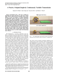 2014 IEEE International Conference on Robotics & Automation (ICRA) Hong Kong Convention and Exhibition Center May 31 - June 7, 2014. Hong Kong, China A Passive, Origami-Inspired, Continuously Variable Transmission Samuel M. Felton1 , Dae-Young Lee2 , Kyu-Jin Cho2 , and Robert J. Wood1 Abstract— Transmissions play a vital role in machines by transforming the torque and speed of a motor into a desired output. They are often necessary for operating a motor at peak efficiency or power. The majority of variable transmissions are mechanically complex, large, and expensive, which limits scalability and is often cost prohibitive. As an alternative, we propose an origami-wheel design that is capable of varying its own transmission ratio between motor torque and ground reaction force, effectively creating a passive, continuously variable transmission. The wheel responds to an increase in torque by reducing its radius through the spring-like properties of the origami structure, increasing the force applied by the wheel to the ground. We demonstrate that the wheel is able to match the speed of a 55 mm fixed-radius wheel when unloaded, and can also tow loads as high as a 25 mm wheel without stalling. This design could be used to provide smaller, cheaper robots with an effective means to vary their output while maintaining motor efficiency. I. INTRODUCTION The transmission is a necessary component of any machine; it transforms the power input from an actuator into the desired output by altering the speed and force. Traditional variable transmissions enable machines to operate efficiently at a wide range of speeds while allowing the actuator to operate close to peak power or efficiency, and for this reason can be found in many wheeled vehicles. The most common types of automobile transmissions are mechanically complex, and consist of a torque converter, a planetary gear train, and a hydraulic or manual controller [1]. Each of these components comprises many parts, making them large and expensive. These transmissions have a finite number of ratios, so they cannot operate at peak performance through a continuous range of speeds. In order to improve efficiency, automobile manufacturers have experimented with continuously variable transmissions (CVTs), which have an infinite number of transmission ratios, sometimes over an infinite range, using mechanical, hydraulic, or electrical controllers [1], [2], [3], [4], [5]. While sometimes more efficient, these systems are still mechanically complex, and have yet to replace traditional transmissions in many vehicles due to their larger size, higher cost, and/or lack of durability. In smaller or less expensive vehicles such as wheeled robots, these disadvantages make any kind of variable gearing prohibitive. In order to reduce cost and complexity, we looked to develop a passive control system to vary the transmission 1 Samuel Felton and Robert Wood are with the School of Engineering and Applied Sciences, Harvard University, Cambridge, MA 02138, USA, and the Wyss Institute for Biologically Inspired Engineering, Harvard University, Boston, MA 02115, USA. sam@seas.harvard.edu 2 Dae-Young Lee and Kyu-Jin Cho are with the School of Mechanical and Aerospace Engineering, Seoul National University, Gwanak 1 Gwanak-ro, Gwanak-gu, Seoul 151-742, Korea winter2nf@gmail.com 978-1-4799-3684-7/14/$31.00 ©2014 IEEE High speed, low force Low speed, high force Fig. 1. The origami-inspired wheel passively adjusts the torque-force transmission ratio by altering its radius in response to a tangential load. ratio. Passive devices integrate mechanical intelligence into machine design in lieu of a distinct control system, and have been implemented at a variety of scales: a windshield wiper blade distributes an applied force across six points while being driven by a single rotary linkage, micro-air vehicles such as the Harvard Microrobotic Fly rely on passive wing rotation to achieve an optimal wing angle and maximize thrust [6], [7], and a transformable wheel can passively deploy or retract legs in order to adapt to smooth or rough terrain, using only external friction [8]. Passive mechanisms are also utilized in some cases because they behave more quickly and accurately. The differential mechanism in an automobile balances the torques applied to different wheels driven by the same motor, allowing them to rotate independently while simultaneously aiding in traction [6]. All of these devices rely on clever mechanical design to tighten the dynamic feedback loop. In order to develop a new, passive CVT, we looked to harness the intrinsic mechanical properties of folded structures. Origami has inspired a variety of mechanisms that are less expensive and/or perform better than more traditional devices, including actuators [9] and springs [10]. Labor and material costs are reduced by harnessing two-dimensional materials and fabrication methods. These devices utilize fold geometry and material bending properties to extract significant function out of apparently simple designs. Entire robotic platforms have been constructed using these techniques [11], 2913 (a) [12], [13], [14], [15]. Particularly relevant to our goals, Lee et al. have demonstrated a suite of folding wheels actuated by shape memory alloy wire that can change shape in order to adapt to different environments [16], [17]. In this paper we demonstrate that origami-inspired wheels can be utilized passively to effect a continuously variable transmission (Fig. 1). This design responds to a changing tangential load by changing its radius, acting as a continuously variable transmission ratio between input torque and output force. We demonstrate the performance of these wheels by incorporating them into a machine towing varying loads, and compare it to fixed wheeled designs. L τ d w(d) 1 ρ W F (d) (c) F II. DESIGN The origami wheel design consists of a polyester (PET) dodecagon with twelve fold lines extending to each vertex and tange
