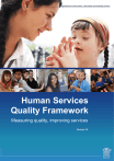 Human Services Quality Framework Measuring quality, improving services Version 3.0 Table of Contents Introduction .................................................................................. 3 Human Services Quality Standards ............................................... 4 Resources and tools...................................................................... 6 Demonstrating compliance with the standards .............................. 7 Exceptions .................................................................................... 8 Relationship to Service Agreement ............................................... 9 Further information ...................................................................... 10 Appendix 1- Funding Stream Requirements ................................ 11 Disability Services: Tables 1A–1D .................................................................... 12 Child Safety: Tables 2A–2D Common service agreement ................................ 16 Child Safety: Tables 3A–3D Streamlined service agreement ............................ 19 Community Services: Tables 4A–4D Common service agreement ................... 25 Community Services: Tables 5A–5D Streamlined service agreement .............. 29 Community Care: Tables 6A–6C ...................................................................... 36 Human Services Quality Framework Version 3.0 Page 2 Introduction The Human Services Quality Framework (HSQF) is a system for assessing and improving the quality of human services. It applies to organisations delivering services under a service agreement with the Department of Communities, Child Safety and Disability Services or other specified arrangements1. The HSQF was developed in collaboration with the non-government sector to reduce duplication and red tape by consolidating the different quality systems used for the department’s services. It incorporates: a set of quality standards, known as the Human Services Quality Standards, which cover the core elements of human service delivery an assessment process to review the performance of service providers against the standards (assessment occurs at an organisation level across all in-scope services) a continuous improvement framework, which supports the participation of customers in quality improvement. The HSQF is designed to increase administrative efficiency and enable service providers to focus their resources on service provision and continued quality improvements. Its key aims include increasing consistency in service quality and ensuring public confidence in service delivery. Implementation of the HSQF is occurring in planned phases through to July 2016. This booklet This booklet outlines HSQF requirements for organisations delivering services funded by the department. It includes information about methods for demonstrating compliance with the Human Services Quality Standards and tools and resources to assist organisations transition to the new framework. Information is also provided to help organisations determine how the HSQF applies to their services. Appendix 1 sets out tables showing the service types across all funding streams of the department (child safety, disability, community, and community care) and the relevant compliance requirements. Expected benefits The adoption of the HSQF offers benefits for all parties: Customers, families and carers - - Access to better, more reliable services Greater focus on individual rights Confidence in a service provider’s systems and processes Opportunity to contribute to service improvement Service providers - - - - A clear and consistent framework for planning, operating and improving services Reduction in administrative burden and compliance costs A holistic assessment of an organisation’s systems and processes Positions organisations to deliver services in other areas of human services Government - - - A streamlined, consistent process to monitor the quality of services funded by the department Increased confidence in government investment in services Improved public accountability 1 These other specified arrangements would be disability services delivered by the department and providers of child safety placement services in-scope of licensing funded through child-related-costs. An exemption applies, where an organisation is a corporation and the only consumer of the disability service provided is the director of the organisation. Human Services Quality Framework Version 3.0 Page 3 Human Services Quality Standards The Human Services Quality Standards (the standards) set a benchmark for the quality of service provision. Each standard is supported by a set of performance indicators which outline what an organisation is required to demonstrate to meet the standard. The standards and indicators are outlined on the following pages. Standard Indicator 1 1.1 Governance and Management Sound governance and management systems that 1.2 maximise outcomes for stakeholders 2 Service Access The organisation has accountable and transparent governance arrangements that ensure compliance with relevant legislation, regulations and contractual arrangements. The organisation ensures that members of the governing body possess and maintain the knowledge, skills and experience required to fulfil their roles. 1.3 The organisation develops and implements a vision, purpose statement, values, objectives and strategies for service delivery that reflect contemporary practice. 1.4 The organisation’s management systems are clearly defined, documented and monitored and (where appropriate) communicated including finance, assets and risk. 1.5 Mechanisms for continuous improvement are demonstrated in organisational management and service delivery processes. 1.6 The organisation encourages and promotes processes for participation by people using services and other relevant stakeholders in governance and management processes. 1.7 The organisation has effective information ma