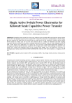 ISSN (Print) : 2320 – 3765 ISSN (Online): 2278 – 8875 International Journal of Advanced Research in Electrical, Electronics and Instrumentation Engineering An ISO 3297: 2007 Certified Organization Vol. 5, Special Issue 3, March 2016 National Conference on Recent Advances in Electrical & Electronics Engineering (NCREEE’16) Organized by Dept. of EEE, Mar Baselios Institute of Technology & Science (MBITS), Kothamangalam, Kerala-686693, India On 17th & 18th March 2016 Single Active Switch Power Electronics for Kilowatt Scale Capacitive Power Transfer Bincy Aleyas1, Jeena Joy2, Eldhose K. A3 M. Tech Student, MACE , Kothamangalam, Kerala, India1. Professor, MACE , Kothamangalam, Kerala, India 2,3 ABSTRACT:Contactless power transfer is of two types; Inductive power transfer (IPT) and Capacitive power transfer (CPT). IPT is the dominant means of power transfer. IPT is suited where the power transfer distance is small to large. IPT uses magnetic flux while CPT uses electrical flux to couple across the gap. Nowadays, capacitive power transfer (CPT) systems are widely used for very low power delivery due to a number of limitations and small coupling capacitance. Recent research has increased the coupling capacitance from the pF to the nF scale, enabling extension of CPT to kW power level applications. To reduce the cost and losses single-switch-single-diode topologies are investigated as efficient power electronics suitable for CPT at higher power levels while remaining cost effective. Four single active switch CPT topologies based on the canonical Cuk, SEPIC, Zeta, and buck-boost converters are investigated and verified using MATLAB R2014a/SIMULINK. Observed 1kW power transfer at a frequency of 200 kHz. KEYWORDS: Capacitive power transfer (CPT), non-contact, SEPIC, Ćuk, Single switch converter, wireless power transfer. I. INTRODUCTION Contactless power transfer technology provides a solution for power transfer where the source is normally fixed and the position of the load can be adjusted within suitable tolerances. There are two major ways to achieve contactless power transfer: inductive power transfer (IPT) and capacitive power transfer (CPT). Of these, the dominant means of transferring electrical energy across a gap/boundary without contact is inductive, e.g. magnetic flux coupling between isolated windings [1]. IPT techniques are ideally suited for applications where the power transfer distance is small to large, spanning a scale from millimeters to single meters. As shown in figure 1, IPT uses magnetic flux to couple between isolated coils connected to electric circuits. Conversely, CPT uses electric flux between conducting surfaces to couple between circuits. A minimum of two capacitors is required to transfer current across the air gap. IPT has already been developed but CPT has only been developed for low power applications, CPT systems can transfer power through metal barriers, and they are not affected by metal surroundings. In comparison, means by which high-power losses can be mitigated are always a consideration when IPT systems are used in environments where metal is present. Fgure1 shows the block diagram of a typical CPT system with two pairs of metal plates for electric field coupling. A dc voltage source is converted to a high-frequency ac voltage which is then applied to two primary metal plates. When two secondary metal plates are placed in close proximity, an alternating electric field is formed between the plates enabling a displacement current to flow. By appropriate power conditioning, power can be transferred to the load without direct electrical contact and some freedom of movement between the primary and secondary plates is allowed. Here, the capacitive coupling comprises two equivalent capacitors formed by two pairs of primary and secondary (pickup) plates while a suitable dielectric material is assumed to exist between the coupling plates [2]. Copyright to IJAREEIE www.ijareeie.com 160 ISSN (Print) : 2320 – 3765 ISSN (Online): 2278 – 8875 International Journal of Advanced Research in Electrical, Electronics and Instrumentation Engineering An ISO 3297: 2007 Certified Organization Vol. 5, Special Issue 3, March 2016 National Conference on Recent Advances in Electrical & Electronics Engineering (NCREEE’16) Organized by Dept. of EEE, Mar Baselios Institute of Technology & Science (MBITS), Kothamangalam, Kerala-686693, India On 17th & 18th March 2016 Figure 1: (a) Inductive power transfer (IPT) (b) Capacitive power transfer (CPT) (c) Block diagram of capacitive power transfer (CPT) Recently the use of hydrodynamic supported capacitors has increased capacitive coupling by an order of magnitude. Coupling capacitances based on hydrodynamic fluid bearings demonstrate non-contact coupling at the 10nF scale. Previously coupling capacitances were limited to the 10s or 100s of pF ultimately limiting the power throughput of a CPT system. Other factors affecting power throughput include coupling capacitor current and operating frequency. Unsurprisingly, high frequency operation paired with higher-voltage-lower-current loads lends itself to higher power throughput. Consequently, the development of efficient kilowatt scale power electronics capable of switching hundreds of volts at frequencies in the range 200 kHz to 1 MHz is necessary. Converters need to be cost effective, reliable, efficient and easy to control. CPT converters with a single active switch are taken as a means to meet these general criteria. II. SINGLE ACTIVE SWITCH CONVERTER TOPOLOGIES 2.1 Design Idea There are several kinds of basic single active switch converters: Buck, Boost, Buck- boost, Cuk, SEPIC, Zeta (InverseSEPIC). For a CPT we need two capacitors. Among these topologies, Cuk, SEPIC, and Zeta have a capacitor that can split the circuit into two sides, i.e. primary and secondary. So these three topologies can be modified to accommodate CPT. Similarly, the inductor in a Buck-boost converter can be