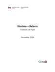 Disclosure Reform Consultation Paper November 2004 TABLE OF CONTENTS Introduction …………………………………………………………….…….…… 1 Background ………………………………………………………….…….………. 3 Facilitating Electronic Disclosure …………………………………………...…… 6 Disclosure Through Access …………………………………..…………………… 9 Specialized Court Proceedings on Disclosure ………….……………………….. 13 Detailed Disclosure-Management Procedures …………………………..……… 16 Addressing Improper Use of Disclosed Materials ………………………….…... 18 Further Ideas for Disclosure Reform ………………………………………….… 22 ii iii INTRODUCTION Under the Canadian Charter of Rights and Freedoms, an accused person is guaranteed the right to the disclosure of all relevant information in the possession or control of the Crown, with the exception of privileged information. While the principle of disclosure is key to the proper functioning of our criminal justice system, the obligation can present significant challenges. The burden of managing large quantities of information can be considerable, especially in complex criminal matters, for both the Crown and the defence. Furthermore, disputes can arise over which information is relevant and over what fits within the categories of privileged information. Disputes over what information has to be disclosed, along with delays in transmitting it, can impede trials themselves, and sometimes result in proceedings being stayed due to unreasonable delay. A further area of concern is that information contained in the disclosed materials is sometimes misused. On February 27, 2004, the Minister of Justice and Attorney General of Canada, Irwin Cotler, announced that he had asked Justice officials to develop proposals for amendments to more efficiently and effectively implement the Charter-mandated disclosure obligation. The announcement noted that amendments would be examined in the five following areas: • • • • • facilitating the electronic disclosure of materials to the defence; reducing administrative burdens in disclosure by clarifying the core materials to be given to the defence, while ensuring the defence's right of access to all relevant information; setting up specialized court proceedings to provide a way for parties to deal expeditiously with all matters pertaining to disclosure, including relevance; establishing disclosure-management procedures that would clearly set out obligations relating to disclosure, including timelines; addressing any improper use of disclosed materials. The Minister also announced that specific proposals would be put forward for consultations with the legal community and the general public. This paper is intended to facilitate consultations on the proposed areas for disclosure reform that were set out in the February 27 announcement. For each area of potential reform, a basic statement of issues is provided, together with a description of the proposals to address these issues. This is followed, in each case, by a fuller discussion of how the proposals could work to improve disclosure. Potential challenges raised by the proposals are also discussed, along with possible alternative ways of framing them to address the underlying issues. At the end of each section, specific questions are posed about the legislative proposals. You are invited to forward your comments by February 8, 2005, to the following address: Disclosure Reform Consultation Department of Justice Canada Criminal Law Policy Section 284 Wellington Street Ottawa, Ontario K1A 0H8 E-mail: disclosurereform@justice.gc.ca Fax: (613) 942-9310 2 BACKGROUND It is a fundamental element of the fair and proper operation of the Canadian criminal justice system that an accused person has the right to the disclosure of all relevant information in the possession or control of the Crown, with the exception of privileged information. Relevance, in this context, has been found by the courts to mean that there is a reasonable possibility of the information being useful to the accused person in making full answer and defence. This right to disclosure flows from section 7 of the Canadian Charter of Rights and Freedoms, which provides that “everyone has the right to life, liberty and security of the person and the right not to be deprived thereof except in accordance with the principles of fundamental justice.” The right to proper disclosure is recognized in particular under principles of fundamental justice as necessary to the accused person’s ability to defend himself or herself against the charges that have been laid. The main legal principles applying to the disclosure of information in criminal matters were set down by the Supreme Court of Canada in the landmark case of R. v. Stinchcombe, [1991] 3 S.C.R. 326. These rules have been elaborated and applied in numerous subsequent cases. Recently, in R. v. Taillefer; R. v. Duguay, [2003] 3 S.C.R. 307, Mr. Justice LeBel reiterated the key principles as follows: The rules may be summarized in a few statements. The Crown must disclose all relevant information to the accused, whether inculpatory or exculpatory, subject to the exercise of the Crown's discretion to refuse to disclose information that is privileged or plainly irrelevant. Relevance must be assessed in relation both to the charge itself and to the reasonably possible defences. The relevant information must be disclosed whether or not the Crown intends to introduce it in evidence, before election or plea…. Moreover, all statements obtained from persons who have provided relevant information to the authorities should be produced notwithstanding that they are not proposed as Crown witnesses….. [p. 334] The obligation to disclose “relevant” information has been construed broadly