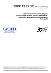 3GPP TS 23.003 V5.11.0 (2006-06) Technical Specification 3rd Generation Partnership Project; Technical Specification Group Core Network; Numbering, addressing and identification (Release 5) R GLOBAL SYSTEM FOR MOBILE COMMUNICATIONS The present document has been developed within the 3rd Generation Partnership Project (3GPP TM) and may be further elaborated for the purposes of 3GPP. The present document has not been subject to any approval process by the 3GPP Organisational Partners and shall not be implemented. This Specification is provided for future development work within 3GPP only. The Organisational Partners accept no liability for any use of this Specification. Specifications and reports for implementation of the 3GPP TM system should be obtained via the 3GPP Organisational Partners' Publications Offices. Release 5 2 3GPP TS 23.003 V5.11.0 (2006-06) Keywords GSM, UMTS, addressing 3GPP Postal address 3GPP support office address 650 Route des Lucioles - Sophia Antipolis Valbonne - FRANCE Tel.: +33 4 92 94 42 00 Fax: +33 4 93 65 47 16 Internet http://www.3gpp.org Copyright Notification No part may be reproduced except as authorized by written permission. The copyright and the foregoing restriction extend to reproduction in all media. © 2006, 3GPP Organizational Partners (ARIB, ATIS, CCSA, ETSI, TTA, TTC). All rights reserved 3GPP Release 5 3 3GPP TS 23.003 V5.11.0 (2006-06) Contents Foreword ............................................................................................................................................................6 1 1.1 1.1.1 1.1.2 1.2 1.3 1.4 2 2.1 2.2 2.3 2.4 2.5 2.6 2.7 3 3.1 3.2 3.3 3.4 3.5 3.6 3.7 3.8 4 4.1 4.2 4.3 4.3.1 4.3.2 4.4 4.5 4.6 5 5.1 5.2 6 6.1 6.2 6.2.1 6.2.2 6.3 7 7.1 7.2 7.3 8 8.1 8.2 Scope ........................................................................................................................................................7 References.......................................................................................................................................................... 7 Normative references ................................................................................................................................... 7 Informative references.................................................................................................................................. 9 Abbreviations..................................................................................................................................................... 9 General comments to references ........................................................................................................................ 9 Conventions on bit ordering............................................................................................................................... 9 Identification of mobile subscribers .........................................................................................................9 General............................................................................................................................................................... 9 Composition of IMSI ....................................................................................................................................... 10 Allocation principles........................................................................................................................................ 10 Structure of TMSI............................................................................................................................................ 11 Structure of LMSI............................................................................................................................................ 11 Structure of TLLI............................................................................................................................................. 11 Structure of P-TMSI Signature ........................................................................................................................ 12 Numbering plan for mobile stations.......................................................................................................12 General............................................................................................................................................................. 12 Numbering plan requirements.......................................................................................................................... 13 Structure of MS international PSTN/ISDN number (MSISDN)...................................................................... 13 Mobile Station Roaming Number (MSRN) for PSTN/ISDN routeing ............................................................ 14 Structure of Mobile Station International Data Number.................................................................................. 14 Handover Number............................................................................................................................................ 14 Structure of an IP v4 address ........................................................................................................................... 14 Structure of an IP v6 address ........................................................................................................................... 14 Identification of location areas and base stations...................................................................................15 Composition of the Location Area Identification (LAI) .................................................................................. 15 Composition of the Routing Area Identification (RAI) ................................................................................... 15 Base station identification..............................................................................