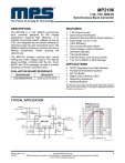 MP2106 1.5A, 15V, 800kHz Synchronous Buck Converter The Future of Analog IC Technology DESCRIPTION FEATURES The MP2106 is a 1.5A, 800kHz synchronous buck converter designed for low voltage applications requiring high efficiency. It is capable of providing output voltages as low as 0.9V, and integrates top and bottom switches to minimize power loss and component count. The 800kHz switching frequency reduces the size of filtering components, further reducing the solution size. • • • • • • • • • • • The MP2106 includes cycle-by-cycle current limiting and under voltage lockout. The internal power switches, combined with the tiny 10-pin MSOP and QFN packages, provide a solution requiring a minimum of surface area. EVALUATION BOARD REFERENCE Board Number Dimensions EV2106DQ/DK-00A 2.5”X x 2.0”Y x 0.5”Z 1.5A Output Current Synchronous Rectification Internal 210mΩ and 255mΩ Power Switches Input Range of 2.6V to 15V >90% Efficiency Zero Current Shutdown Mode Under Voltage Lockout Protection Soft-Start Operation Thermal Shutdown Internal Current Limit (Source & Sink) Tiny 10-Pin MSOP or QFN Package APPLICATIONS • • • • • • DC/DC Regulation from Wall Adapters Portable Entertainment Systems Set Top Boxes Digital Video Cameras, DECT Networking Equipment Wireless Modems For MPS green status, please visit MPS website under Quality Assurance. “MPS” and “The Future of Analog IC Technology” are Registered Trademarks of Monolithic Power Systems, Inc. TYPICAL APPLICATION Efficiency vs. Load Current C7 R4 5 OFF ON 1 3 C5 10nF C3 3.3nF R3 100 10nF C1 7 6 VIN RUN BST LX MP2106 SS COMP VREF 4 FB SGND PGND C6 10nF 10 9 90 VIN=3.3V 80 L1 OUTPUT 1.8V / 1.5A 8 2 R2 C2 EFFICIENCY (%) INPUT 2.6V to 15V 70 60 VIN=5V 50 40 30 20 R1 10 0 0.01 MP2106_TAC_S01 0.1 1 LOAD CURRENT (A) 10 MP2106_TAC_EC02 MP2106 Rev. 1.81 3/7/2011 www.MonolithicPower.com MPS Proprietary Information. Patent Protected. Unauthorized Photocopy and Duplication Prohibited. © 2011 MPS. All Rights Reserved. 1 MP2106 – 1.5A, 15V, 800kHz SYNCHRONOUS BUCK CONVERTER ORDERING INFORMATION Part Number Package Top Marking Free Air Temperature (TA) MP2106DK* MSOP10 2106D -40°C to +85°C MP2106DQ** QFN10 (3x3mm) C4 -40°C to +85°C * For Tape & Reel, add suffix –Z (e.g. MP2106DK–Z). For Lead Free, add suffix –LF (e.g. MP2106DK–LF–Z) ** For Tape & Reel, add suffix –Z (e.g. MP2106DQ–Z). For Lead Free, add suffix –LF (e.g. MP2106DQ–LF–Z) PACKAGE REFERENCE TOP VIEW TOP VIEW SS 1 10 SGND FB 2 9 PGND LX COMP 3 8 LX VIN VREF 4 7 VIN RUN 5 6 BST SS 1 10 SGND FB 2 9 PGND COMP 3 8 VREF 4 7 RUN 5 6 BST MP2106_PD01-MSOP10 EXPOSED PAD ON BACKSIDE MP2106_PD02-QFN10 ABSOLUTE MAXIMUM RATINGS (1) Thermal Resistance Input Supply Voltage VIN .............................. 16V LX Voltage VLX ...................... -0.3V to VIN + 0.3V BST to LX Voltage .......................... -0.3V to +6V Voltage on All Other Pins ................ -0.3V to +6V (2) Continuous Power Dissipation (TA = +25°C) MSOP10 .................................................. 0.83W QFN10 ....................................................... 2.5W Junction Temperature ...............................150°C Lead Temperature ....................................260°C Storage Temperature ............... -55°C to +150°C MSOP10 ................................ 150 ..... 65... °C/W QFN10 (3x3mm) ..................... 50 ...... 12... °C/W Recommended Operating Conditions (3) Input Supply Voltage VIN .................. 2.6V to 15V Output Voltage VOUT ................0.9V to VIN x 80% Maximum Junction Temp. (TJ) ............... +125°C MP2106 Rev. 1.81 3/7/2011 (4) θJA θJC Notes: 1) Exceeding these ratings may damage the device. 2) The maximum allowable power dissipation is a function of the maximum junction temperature TJ (MAX), the junction-toambient thermal resistance θJA, and the ambient temperature TA. The maximum allowable continuous power dissipation at any ambient temperature is calculated by PD (MAX) = (TJ (MAX)-TA)/θJA. Exceeding the maximum allowable power dissipation will cause excessive die temperature, and the regulator will go into thermal shutdown. Internal thermal shutdown circuitry protects the device from permanent damage. 3) The device is not guaranteed to function outside of its operating conditions. 4) Measured on JESD51-7, 4-layer PCB. www.MonolithicPower.com MPS Proprietary Information. Patent Protected. Unauthorized Photocopy and Duplication Prohibited. © 2011 MPS. All Rights Reserved. 2 MP2106 – 1.5A, 15V, 800kHz SYNCHRONOUS BUCK CONVERTER ELECTRICAL CHARACTERISTICS VIN = 5.0V, TA = +25°C, unless otherwise noted. Parameter Input Voltage Range Input Under Voltage Lockout Input Under Voltage Lockout Hysteresis Shutdown Supply Current Operating Supply Current VREF Voltage RUN Input Low Voltage RUN Input High Voltage RUN Hysteresis RUN Input Bias Current Oscillator Switching Frequency Maximum Duty Cycle Minimum On Time Error Amplifier Voltage Gain Transconductance COMP Maximum Output Current FB Regulation Voltage FB Input Bias Current Soft-Start Soft-Start Current Soft-Start Period Output Switch On-Resistance Switch On Resistance Synchronous Rectifier On Resistance Switch Current Limit (Source) Synchronous Rectifier Current Limit (Sink) (5) Thermal Shutdown Symbol Condition VIN VREF VIL VHL Min 2.6 VRUN ≤ 0.3V VRUN > 2V, VFB = 1.1V VIN = 2.6V to 15V Typ 2.2 Units V V 100 mV 0.5 1.2 2.4 Max 15 1.0 1.8 0.4 1.5 100 1 fSW DMAX tON 200 kHz % ns VFB = 0.895V 400 300 ±30 895 -100 V/V µA/V µA mV nA CSS = 0.1µF 2 15 µA ms 255 315 210 255 2.5 mΩ mΩ mΩ mΩ A VFB = 0.7V 700 85 AVEA GEA VFB IFB 875 ISS VIN = 5V VIN = 3V VIN = 5V VIN = 3V 2.0 800 900 µA mA V V V mV µA 915 3.2 350 mA 160 °C Note: 5) Guaranteed by design. MP2106 Rev. 1.81 3/7/2011 www.MonolithicPower.com MPS Proprietary Information. Patent Protected. Unauthorized Photocopy and Duplication Prohibited. © 2011 MPS. All Rights Reserved. 3 MP2106 – 1