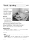 LESSON Austin Community College | Visual Communication Design ARTV-1445 3D Modeling & Rendering 1 Basic Lighting 05 NEW SKILLS/CONCEPTS: Becoming familiar with the light types in 3ds max Understands the differences between light types Understanding and being able to use the appropriate of a light’s intensity, color, and shadow type for a particular situation Understanding the basics of “modeling with light” OBJECTIVES: Using Standard Light types to… Part I: Light the scene based on the sources of light and the mood you are trying to create. Include fill lights to represent the bounced light in the room. Part II: Using the technique of “3 point lighting”, light one (3D) object in the scene with additional light to boost the light and draw the viewer’s focus to that object. Final Scene: Demonstrate understanding of the standard lights types Scene is lit with appropriate “key to fill” ratio (low = light scene, high = dark scene) Scene is lit with enough “bounced light” to help light the darkest areas Each light is named descriptively – I.E. lamp-omni, lamp-spot, key, fill, back, etc. Scene file is saved in student’s folder and instructor’s folder for critique Save Rendered .jpg in student’s folder and instructor’s folder for critique READING ASSIGNMENT: Visual Quickstart Guide 3D S Max 6 for Windows Chap. 11; pp. 335 – 361 (emphasis on pp. 335 343) The Art of 3D Computer Animation & Imaging Chapter 8, Lighting DEFINITIONS: 1. LIGHTS Omni Light (omni-directional, point) – radiates light in all directions. Examples: candle light, light bulb, star, firefly Directional Light (sun, infinite, direct) – radiates with parallel rays of light. Sets a single vector for all its illumination and hits every object from the same angle, no matter where the object is located. All of the shadows cast by a distant light are cast in the same direction and are Basic Lighting Page 1 of 4 Austin Community College | Visual Communication Design ARTV-1445 3D Modeling & Rendering 1 orthogonal projections of each object’s shape. In 3ds max can be targeted and use a cone of illumination. Examples: sun, moon Spotlight - A spotlight casts light from a point in a cone shape and only in one specific direction. You can also link a "target” to the light so that the light is always oriented toward the position of the target. Spotlights have a variable –angle cone and a light fall-off factor (decay) Examples: headlight, flashlight, movie projectors, lamp shades. Skylight - The Skylight light models daylight. It is meant for use with the Light Tracer. You can set the color of the sky or assign it a map. The sky is modeled as a dome above the scene. This light is works in a similar fashion to the Area Lights in other programs. You can render without using Light Tracer but the image is grainy unless the rays are set to a high number (it takes a very long time to render) Ambient Light - (also called global ambience – EVIL… makes your 3D scene FLAT)-- In real life, ambient light is widely distributed, “indirect” light that has bounced off objects in your scene. Ambient light illuminates even the areas not directly lit by another light source. In 3D graphics, the ambient light means an amount of flat, evenly distributed light added to objects in a scene, making the objects visible even when no light source illuminates them. In 3ds max, the ambient light default setting is “0” Basic Components of a Light Source: Position and Orientation Color and Intensity – simulated lights can be any color. The color of lights is based on the additive color model (RGB or HSB). Intensity or brightness can be controlled independently of the color BUT since they influence each other, almost any change in color affects the lights intensity Attenuation – the effect of light dimming over a distance; use this to reduce the space lit by that source Beam Angle – defines the diameter of the beam of light and also the surface area covered by the light. Glow and Cone of Light – glow is a circle of light that forms around a light source. 2. SHADOWS Types of Shadows: There are 4 types of shadows that a scanline renderer can project from a light. In this exercise we will only concern ourselves with the Default Shadow Map type. a. Shadow maps (Depth Mapped) – bitmaps that are projected from light Shadow map shadows use a pre-calculated depth map to determine where shadows will be rendered. A depth map is an array of numbers representing distances to the nearest shadow-casting object found in each direction. It makes the light appear to be blocked by other objects, without the renderer needing to check the geometry of the scene while rendering each point. Shadow maps don't show the color cast by transparent or translucent objects. On the other hand, shadow maps can have soft-edged shadows, which ray-traced shadows cannot. To get a nice shadow, you usually need to increase the shadow map size. b. Raytraced Shadow Basic Lighting Page 2 of 4 Austin Community College | Visual Communication Design ARTV-1445 3D Modeling & Rendering 1 3. Three-Point Lighting One of the most popular and attractive ways to illuminate any subject is with a classic Hollywood lighting scheme called three-point lighting. This makes it easy to model your subject with light. One of the main goals of 3 point lighting is modeling with light. To model with light is to illuminate a subject so that your 2 dimensional output shows the subject’s full three-dimensional form. Key light - creates the subject’s main illumination and defines the dominant angle of the lighting. The key light is usually brighter than any other light illuminating the subject and is usually the light that casts the darkest, most visible shadows in your scene. o Placed 10 to 50 degrees to the right or left of the camera. o Placed above the camera o Strongest light o Dominant shadow Fill light - softens and extends the illumination provided by the key light and 