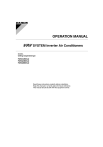 OPERATION MANUAL SYSTEM Inverter Air Conditioners MODEL Ceiling Suspended type FXHQ12MVJU FXHQ24MVJU FXHQ36MVJU Read these instructions carefully before installation. Keep this manual in a handy place for future reference. This manual should be left with the equipment owner. SAFETY CONSIDERATIONS Please read these “SAFETY CONSIDERATIONS” carefully before installing air conditioning equipment and be sure to install it correctly. After completing the installation, make sure that the unit operates properly during the start-up operation. Please instruct the customer on how to operate the unit and keep it maintained. Also, inform customers that they should store this operation manual along with the installation manual for future reference. This air conditioner comes under the term “appliances not accessible to the general public”. • • • • Meaning of danger, warning, caution and note symbols. DANGER ................Indicates an imminently hazardous situation which, if not avoided, will result in death or serious injury. WARNING ..............Indicates a potentially hazardous situation which, if not avoided, could result in death or serious injury. CAUTION ................Indicates a potentially hazardous situation which, if not avoided, may result in minor or moderate injury. It may also be sued to alert against unsafe practices. NOTE......................Indicates situation that may result in equipment or property-damage-only accidents. Keep these warning sheets handy so that you can refer to them if needed. Also, if this equipment is transferred to a new user, make sure to hand over this operation manual to the new user. • • • • • • 2 DANGER Do not install the unit in an area where flammable materials are present due to risk of explosion resulting in serious injury or death. Any abnormalities in the operation of the air conditioner such as smoke or fire could result in severe injury or death. Turn off the power and contact your dealer immediately for instructions. Refrigerant gas may product toxic gas if it comes in contact with fire such a from a fan, heater, stove, or cooking device. Exposure to this gas could cause severe injury or death. For refrigerant leakage, consult your dealer. Refrigerant gas is heavier than air and replaces oxygen. A massive leak could lead to oxygen depletion, especially in basements, and an asphyxiation hazard could occur leading to serious injury or death. If equipment utilizing a burner is used in the same room as the air conditioner, there is the danger of oxygen deficiency which could lead to an asphyxiation hazard resulting in serious injury or death. Be sure to ventilate the room sufficiently to avoid this hazard. Safely dispose of the packing materials. Packing materials, such as nails and other metal or wooden parts, may cause stabs or other injuries. Tear apart and throw away plastic packaging bags so that children will not play with them. Children playing with plastic bags face the danger of death by suffocation. • • • • • • • • • • • • • • • • • WARNING It is not good for your health to expose your body to the air flow for a long time. Ask your dealer for installation of the air conditioner. Incomplete installation performed by yourself may result in a water leakage, electric shock, and fire. Ask your dealer for improvement, repair, and maintenance. Incomplete improvement, repair, and maintenance may result in a water leakage, electric shock, and fire. Improper installation or attachment of equipment or accessories could result in electric shock, short-circuit, leaks, fire or other damage to the equipment. Be sure only to use accessories made by Daikin which are specifically designed for use with the equipment and have them installed by a professional. Ask your dealer to move and reinstall the air conditioner. Incomplete installation may result in a water leakage, electric shock, and fire. Never let the indoor unit or the remote controller get wet. It may cause an electric shock or a fire. Never use flammable spray such as hair spray, lacquer or paint near the unit. It may cause a fire. Never replace a fuse with that of wrong ampere ratings or other wires when a fuse blows out. Use of wire or copper wire may cause the unit to break down or cause a fire. Never remove the fan guard of the unit. A fan rotating at high speed without the fan guard is very dangerous. Never inspect or service the unit by yourself. Ask a qualified service person to perform this work. Cut off all electric waves before maintenance. To avoid the risk of serious electrical shock, never aprinkle or spill water or liquids on the unit. Operating the air conditioner with wet hands could result in a shock hazard. Check the unit stand for damage on a continuous basis. If left in a damaged condition the unit may fall and cause injury. Do not allow children to play on or around the unit as they could be injured. Placing a flower vase or other containers with water or other liquids on the unit could result in a shock hazard or fire if a spill occurs. Do not put a finger or other objects into the air inlet or air outlet. The fan is rotating at high speed and will cause injury. The heat exchanger fins are sharp enough to cut. To avoid injury wear gloves or cover the fins while working around them. Do not touch the air outlet or the horizontal flaps while the swing flap is in operation as fingers may get caught and injured. Be sure to install an earth leakage breaker. Failure to install an earth leakage breaker may result in electric shocks, or fire. Never touch the internal parts of the controller. Do not remove the front panel because some parts inside are dangerous to touch. In addition, some parts may be damaged. For checking and adjusting internal parts, contact your dealer. • • • • • • • • • • CAUTION Do not use the air conditioner for other purposes. In order to avoid any quality deterioration, do not us
