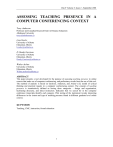 JALN Volume 5, Issue 2 - September 2001 ASSESSING TEACHING PRESENCE IN A COMPUTER CONFERENCING CONTEXT Terry Anderson Professor and Canadian Research Chair in Distance Education Athabasca University terrya@athabascau.ca Liam Rourke University of Alberta Edmonton Alberta lrourke@ualberta.ca D. Randy Garrison University of Alberta Edmonton Alberta Randy.Garrison@ualberta.ca Walter Archer University of Alberta Edmonton Alberta Walter.archer@ualberta.ca ABSTRACT This paper presents a tool developed for the purpose of assessing teaching presence in online courses that make use of computer conferencing, and preliminary results from the use of this tool. The method of analysis is based on Garrison, Anderson, and Archer’s [1] model of critical thinking and practical inquiry in a computer conferencing context. The concept of teaching presence is constitutively defined as having three categories – design and organization, facilitating discourse, and direct instruction. Indicators that we search for in the computer conference transcripts identify each category. Pilot testing of the instrument reveals interesting differences in the extent and type of teaching presence found in different graduate level online courses. KEYWORDS Teaching, CMC, instruction, formal education 1 2 JALN Volume 5, Issue 2 - September 2001 I. INTRODUCTION In the one-room schools that dotted the North American landscape during the pioneer era, the tasks of a skilled and dedicated teacher were challenging, to say the least. The teacher performed several functions. Obviously, she or he provided direct instruction – in all school subjects, to children in up to nine different grades! Perhaps less obvious, the teacher had to spend long hours designing and organizing the learning experiences of the children. This teacher function often included non-traditional activities such as lighting the potbellied stove on each frigid winter morning so that the school would be habitable when the students arrived. A third teaching function that was very important in these pioneer schools was creating a community of learners by facilitating student-to-student discourse. It was obviously impossible for one teacher to provide constant direct instruction to twenty-five students in up to nine different grades. Most of the learning in the one-room school took place as children in one grade worked in a peer-learning group while the teacher was providing direct instruction to children in another grade. Frequently the teacher would assign “the big kids” – i.e., those who knew more about the subject – to help “the little kids,” those who knew less about the subject. These various teaching functions are now being replicated in a new “pioneering” context, that of online learning, to which we now turn. II. TEACHING PRESENCE IN AN ONLINE ENVIRONMENT There are two reasons why we begin a paper on teaching presence in a virtual environment with a look back at teaching presence in an earlier pioneering era. First, in the earlier, supposedly simpler era of the one-room schoolhouse, it was clear that the functions of a teacher were multifacetted. In that more physical, more observable environment, it is easy to see the function of the teacher as consisting of three major roles: first, as designer of the educational experience, including planning and administering instruction as well as evaluating and certifying competence; second, as facilitator and co-creator of a social environment conducive to active and successful learning; and finally, as a subject matter expert who knows a great deal more than most learners and is thus in a position to ‘scaffold’ learning experiences by providing direct instruction. Another reason for our reference to the experience of pioneer teachers in one-room schools is that it serves as an analogy to the time consuming and often frustrating experience of twenty-first century “pioneer teachers” in online learning communities. As was the case in the one-room schools in the early twentieth century, creating the necessary “warmth” in the pioneering virtual learning environments of the early twenty-first century takes considerable teacher effort. However, the imperfect tools of today are harbingers of easier and more ubiquitous online learning tools, just as the one-room schools of long ago have given place to modern, wellequipped schools in rural centers. This paper reviews the tasks of the online teacher as gleaned from the literature and our experiences as teachers of graduate level, online courses. It then introduces a technique for systematically analyzing the context of the text-based transcripts of those courses. We expect that these tools will allow teachers to assess and then improve their own postings in online courses. We also expect that these tools can be used for research designed to test hypotheses or diagnose problems in online teaching. We conclude the paper with the preliminary results of our analysis of the transcripts from two graduate level teaching courses. 2 JALN Volume 5, Issue 2 - September 2001 III. THEORETICAL FRAMEWORK Teaching in online courses is an extremely complex and challenging function. Therefore, study of this multifaceted function requires an appropriate theoretical perspective that frames this particular research context. This is provided by the framework of our extended research project the goal of which is to better understand teaching and learning via computer conferencing in a higher education context through the development of analytical and measurement tools that assess critical discourse in a community of inquiry [1]. Our research is based on a model of critical thinking and practical inquiry developed by Garrison, Anderson and Archer [2]. This model is framed by a community of inquiry model and used to illustrate the multifaceted components of teaching and learning in a text-based environment [1]. The three elements of this framework are: cognitive presence, soc