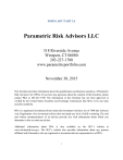 FORM ADV PART 2A Parametric Risk Advisors LLC 518 Riverside Avenue Westport, CT 06880 203-227-1700 www.parametricportfolio.com November 30, 2015 This brochure provides information about the qualifications and business practices of Parametric Risk Advisors LLC (PRA). If you have any questions about the contents of this brochure, please contact PRA at 203-227-1700. The information in this brochure has not been approved or verified by the United States Securities and Exchange Commission (the SEC) or by any state securities authority. PRA is a registered investment adviser under the Investment Advisers Act of 1940 (the Advisers Act). Registration of an investment adviser does not imply any level of skill or training. The oral and written communications of an adviser provide you with information about which you determine to hire or retain an adviser. Additional information about PRA is also available on the SEC’s website at www.adviserinfo.sec.gov. The SEC’s website also provides information about any persons affiliated with Parametric who are registered as investment adviser representatives of PRA. i Item 2 – Material Changes This brochure, dated Nov. 30, 2015, is an amended document prepared by Parametric Risk Advisors, LLC according to the SEC’s General Instructions for Part 2 of Form ADV. There are no material changes from the previously amended brochure dated May 4, 2015. ii Item 3 – Table of Contents Item 2 – Material Changes .............................................................................................................. ii Item 3 – Table of Contents............................................................................................................. iii Item 4 – Advisory Business ............................................................................................................ 1 Item 5 – Fees and Compensation .................................................................................................... 2 Item 6 – Performance-Based Fees and Side-By-Side Management ............................................... 4 Item 7 – Types of Clients ................................................................................................................ 5 Item 8 – Methods of Analysis, Investment Strategies and Risk of Loss ........................................ 6 Item 9 – Disciplinary Information .................................................................................................. 9 Item 10 – Other Financial Industry Activities and Affiliations .................................................... 10 Item 11 – Code of Ethics .............................................................................................................. 11 Item 12 – Brokerage Practices ...................................................................................................... 13 Item 13 – Review of Accounts...................................................................................................... 15 Item 14 – Client Referrals and Other Compensation .................................................................... 15 Item 15 – Custody ......................................................................................................................... 16 Item 16 – Investment Discretion ................................................................................................... 16 Item 17 – Voting Client Securities................................................................................................ 17 Item 18 – Financial Information ................................................................................................... 17 PRA’s Privacy Policy ................................................................................................................... 18 iii Item 4 – Advisory Business Parametric Risk Advisers LLC (PRA) is organized as a limited liability company under the laws of the State of Delaware. PRA is located in Westport, Conn. and has been providing investment advisory services since its formation in 2007. PRA is a wholly owned subsidiary of Parametric Portfolio Associates LLC (Parametric), an SEC-registered investment adviser headquartered in Seattle, WA. PRA’s predecessor, Managed Risk Advisors LLC (MRA), an investment adviser formed in 2002, was acquired by Parametric and merged into PRA in 2007. Parametric and PRA are indirect subsidiaries of Eaton Vance Corp. (EVC), a publicly held company that is traded on the New York Stock Exchange under the ticker symbol EV. Investment Advisory Services PRA offers Investment Advisory Services, defined as providing continuous advice to clients regarding the investment of client funds and or offering discretionary portfolio management. Through personal discussions in which goals and objectives based on a client’s particular circumstances are established, PRA develops a client’s personal investment policy and creates and manages a portfolio based on that policy. PRA will manage advisory accounts on a discretionary and nondiscretionary basis. PRA utilizes three primary investment strategies: DeltaShift is a rules-based equity and equity index call option selling program for single stocks and diversified equity portfolios with a goal of reduced volatility and enhanced return. Dynamic Hedged Equity is a rules-based equity index option program for diversified portfolios in which index put options are purchased and index call options are sold in a systematic manner to provide a hedge to the client’s equity portfolio. Option Absolute Return Strategy (OARS) is a rules-based equity index option spread selling strategy with the goal of generating premium income in a risk-managed fashion. Investing in securities involves risk of loss that clients should be prepared to bear. There is no guarantee that PRA will achieve its clients’ and/or firm goals. PRA’s investment strategies involve option purchases an