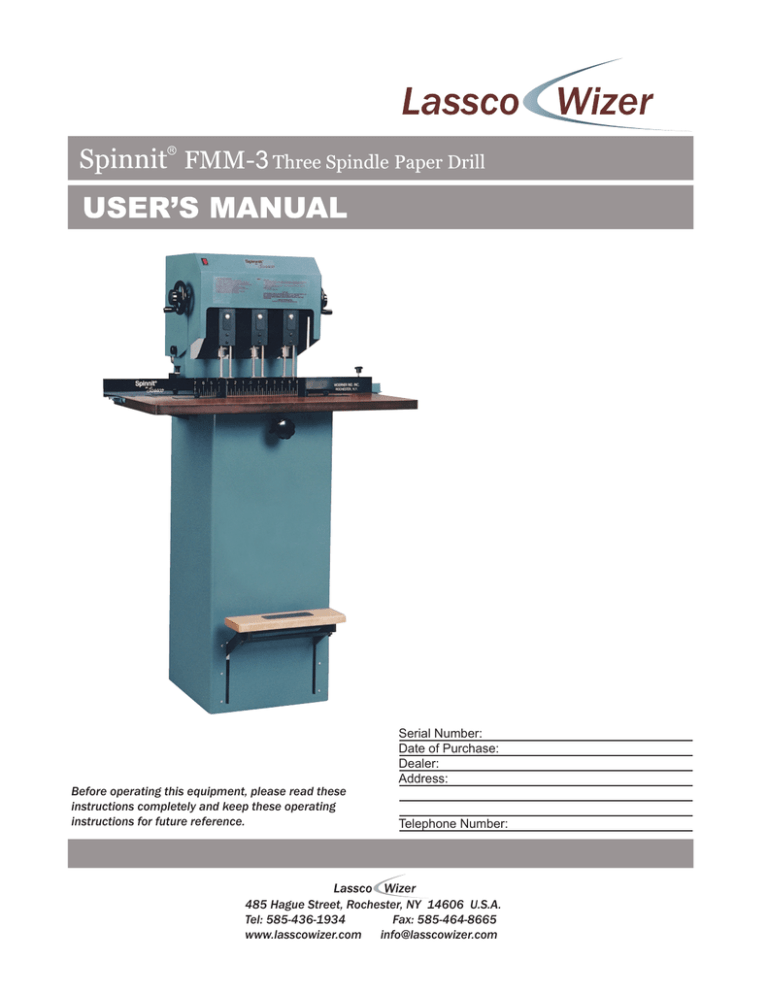 Before operating this equipment, please read these instructions completely and keep these operating instructions for future reference. Serial Number: Date of Purchase: Dealer: Address: Telephone Number: 485 Hague Street, Rochester, NY 14606 U.S.A. Tel: 585-436-1934 Fax: 585-464-8665 www.lasscowizer.com info@lasscowizer.com Table Of Contents Introduction Introduction....................................................................... Page 02 Shipping Damage Inspection............................................ Page 02 Safety Information Safety Instructions............................................................ Page 03 Warning Labels................................................................. Page 03 Setting Up Your Machine Loose Item Inventory........................................................ Page 04 Leveling Feet.................................................................... Page 05 Paper Side Stops.............................................................. Page 05 Master Chip Chute............................................................ Page 05 Chip Bag........................................................................... Page 06 Electrical Start Up............................................................. Page 06 Operating Instructions Drill Bit Removal and Installation...................................... Page 07 Leveling the Drill Bits........................................................ Page 08 Adjusting the Table Height................................................ Page 09 Back Gauge Adjustment................................................... Page 09 Adjusting the Distance Between the Heads...................... Page 10 Adjusting the Stop Collars................................................. Page 10 Multi-hole Set Up...............................................................Page 11 Traversing the Table..........................................................Page 11 Drilling Procedures............................................................ Page 12 Tips On Drilling..................................................................Page 12 Maintenance Every 12 Months.............................................................. Page 13 - 15 Trouble Shooting Guide Problem,Cause, and Correction........................................ Page 16 - 18 Parts Diagrams Side View.......................................................................... Page 19 Head Assembly................................................................. Page 20 Spindle and Chuck Assembly........................................... Page 21 Rear View.......................................................................... Page 22 Parts List........................................................................... Page 23 Page 01 Introduction Introduction Thank you for your purchase of the Spinnit FMM-3 Paper Drill. We ask that you take a moment to fill in the serial number and other information on the front cover of this manual. Please keep this manual as a reference for future use. For parts and service please contact the Lassco-Wizer Dealer from whom you purchased the machine. If you require assistance in locating a Lassco-Wizer Dealer, please contact our customer service department at 585-436-1934. Please have the model of your machine and the serial number when you call. If you wish to write to us please contact us at: Lassco-Wizer 485 Hague Street Rochester, NY 14606 Shipping Damage Inspection Remove the machine from the carton and inspect for any shipping damage. If any damage is present, report the damage to the carrier immediately. Failure to do so may void any warranties. Page 02 Safety Information Safety Instructions All operators must read and understand the Users Manual and all other safety instructions before using this equipment. Failure to fully understand the safety instructions may result in personal injury. If, after reading the manual, you are still uncertain about use, please contact the dealer from whom you purchased the machine for assistance. If you need contact information for a Service Technician nearest you please call 585-436-1934. Safe operation of this equipment is the responsibility of the users. This machine is designed for one person operation. Never operate the machine with more than one person. Keep hands, hair, and loose clothing away from the drills when operating. Please read and follow all warning labels on your machine. (See below for a list of all warning labels) Always turn the machine to off mode and unplug the machine before installing or removing drill bits and before servicing the machine. Keep hands away from drills when operating. PLEASE NOTE THAT THE DRILL BITS MAY BE HOT AFTER USE. PROCEED WITH CAUTION WHEN CHANGING THE DRILL BITS. ONLY A SERVICING TECHNICIAN IS TO SERVICE THIS MACHINE. Warning Labels The following labels appear on your FMM-3 paper drill. Make sure all operators understand and follow the safety instructions. Please read and make sure that all operators understand the user’s manual and all other safety instructions before using this equipment. Keep hair, jewelry, loose clothing and any other items that could become entangled pulled back away from the machine when drilling. Page 03 Setting Up Your Machine Loose Item Inventory Remove and inspect the following items: FMM6-651A: Master Chip Chute (1) FM4-4001: 25” Drill Strip (1) This item comes installed FMM6-652A: Chip Bag Assembly (1) MS-1: Drill Sharpener (1) Hollow Drill Bit (3) These items come installed FM4-4006: Paper Side Stops (2) Spin-Eze : Drill Bit Lubricant (1) EBM-41: Sharpending Stone (1) HEX-532-T: Hex Wrench 5/32” (1) EBM-32: Chuck Release Key (1) FMM9-956A: Spindle Rotation Tool (1) CC-2: Chip Clearer (1) FM4-4007: Side Stop Screws (4) HEX-332: Hex Wrench 3/32” (1) Short Set Screws (2) Items are not to scale Page 04 Setting Up Your Machine Leveling Feet Step #1 If needed, adjust the feet on the underside of the base t