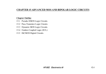 CHAPTER 15 ADVANCED MOS AND BIPOLAR LOGIC CIRCUITS Chapter Outline 15.1 Pseudo-NMOS Logic Circuits 15.2 Pass-Transistor Logic Circuits 15.3 Dynamic MOS Logic Circuits 15.4 Emitter-Coupled Logic (ECL) 15.5 BiCMOS Digital Circuits NTUEE Electronics III 15-1 15.1 PSEUDO-NMOS LOGIC CIRCUITS NMOS Inverter Circuits A simple inverter circuit is composed of a NMOS and a load The load can be realized by a resistor or another NMOS device Resistive Load NMOS Inverter Enhancement Load NMOS Inverter Pseudo-NMOS Inverters Use a PMOS transistor as the load Does not suffer from body effect Directly compatible with complementary CMOS circuits Area and delay penalties arising from the fan-in in complementary CMOS gate are reduced Depletion Load NMOS Inverter Pseudo-NMOS Inverter NTUEE Electronics III 15-2 15.1 PSEUDO-NMOS LOGIC CIRCUITS Static Characteristics Load curve represents a much lower saturation current kn is usually greater than kp by a factor of 4 to 10 A ratioed type logic with r kn/kp The logic is typically operated in two extremely cases: vI = 0: vO = VOH = VDD vI = VDD: vO = VOL > 0 (nonzero VOL for pseudo-NMOS) The VTC can be derived based on iDN and iDP: 1 k n (vI Vt ) 2 for vO vI Vt (saturation) 2 1 k n (vI Vt )vO vO2 for vO vI Vt (triode) 2 1 k p (VDD Vt ) 2 for vO Vt (saturation) 2 1 k p (VDD Vt )(VDD vO ) (VDD vO ) 2 for vO Vt (triode) 2 iDN iDN iDP iDP NTUEE Electronics III 15-3 Derivation of the VTC Assume Vtn = |Vtp| = Vt for the derivations Region I (Segment AB): vO VOH VDD Region II (Segment BC): vO Vt (VDD Vt ) 2 r (vI Vt ) 2 Region III (Segment CD): 1 1 r (vI Vt )vO vO2 (VDD Vt )(VDD vO ) (VDD vO ) 2 2 2 Region R i IV (S (Segmentt DE) DE): 1 vO (vI Vt ) (vI Vt ) 2 (VDD Vt ) 2 r Static Characteristics: VOL (VDD Vt )(1 1 k p / k n ) VOH VDD VIH Vt 2 3k n / k p (VDD Vt ) NM H VOH VIH VM Vt VIL Vt VDD Vt (k n / k p )(k n / k p 1) NM L VIL VOL VDD Vt kn / k p 1 NTUEE Electronics III 15-4 Dynamic Operation Determine tPLH: The analysis is identical to the CMOS inverter and the output capacitance C is charged by PMOS t PLH pC k pVDD 7 V V 2 where p 2 / 3 t t 4 VDD VDD Determine tPHL: The discharge current is iDN iDP while iDP is typically negligible as r is large t PHL nC k nVDD 3 1 1 V V 2 where n 2 / 1 1 3 t t r VDD VDD 4 r n p for a large value of r and tPHL is much larger than tPLH Design of Pseudo-NMOS Inverter Determine ratio r = kn / kp The larger the value of r, the lower VOL is A larger r increases the asymmetry in the dynamic response Usually, r is selected in the range of 4 to 10 Determine (W/L)n and (W/L)p A small (W/L) to keep the gate area and the value of C small A small (W/L) to keeps Isat of QP and static power dissipation low A large (W/L) to obtain a small propagation delay tP and fast response NTUEE Electronics III 15-5 Gate Circuits Design of gate circuits refers to a standard pseudo-NMOS inverter The approach to determine the PDN is identical to that of a complementary CMOS gate The sizing of the PDN has to be taken into account to meet VOL and delay requirement Concluding Remarks In pseudo-NMOS, NOR gates are preferred over NAND gates in order to use minimum-size devices Pseudo-NMOS is particularly suited for applications in which the output remains high most of the time The static power dissipation can be reasonably low The output transitions that matter would presumably be high-to-low ones where the propagation delay can be made as short as necessary NTUEE Electronics III 15-6 15.2 PASS-TRANSISTOR LOGIC CIRCUITS Design of Pass-Transistor Logic (PTL) Circuits Using series and parallel combinations of switches The switches are controlled by input logic variables to connect the input and output nodes Can be implemented by a single NMOS transistor or CMOS transmission gate Every circuit node has at all times a low-resistance path to VDD or ground Y ABC Y A( B C ) NTUEE Electronics III 15-7 Operation with NMOS Transistor as the Switch Pass-transistor with output high (“poor 1”) The output node refers to the source terminal of the NMOS Q is in saturation during the charging process and Vt increases with vO due to body effect tPLH increases as the charging current reduces by higher Vt due to body effect VOH = VDD Vt leads to a reduction in the gate noise immunity Pass-transistor with output low (“good 0”) The input node refers to the source terminal of the NMOS No body effect The output node can be discharged completely VOL = 0 NTUEE Electronics III 15-8 Restoring the Output Level The circuit-based approach by adding a feedback loop with QR The PMOS QR turns on by vO2 (= “0”) to restore the signal loss at vO1 = “1” The PMOS QR is turn off by vO2 (= “1”) when vO1 = “0” Operation is more involved than it appears due to the positive feedback QR has to be a “weak PMOS transistor” in order not to play a major role in the circuit operation The alternative approach by process technology The signal loss is due to the threshold voltage of the NMOS devices Threshold adjustment by ion implantation to during fabrication make zero-threshold devices Subthreshold S bth h ld conduction d ti becomes b significant i ifi t for f zero-threshold th h ld devices d i NTUEE Electronics III 15-9 The Use of CMOS Transmission Gates as Switches PMOS and NMOS are in parallel with complementary control signals Both NMOS and PMOS provide charging/discharging current Good logic level with VOH = VDD and VOL = 0 The complexity, silicon area and load capacitance are increased Body effect has to be taken into account to evaluate iDN and iDP NTUEE Electronics III 15-10 The Equivalent Resistance of the Transmission Gate The equivalent resistance of QN: For vO VDD Vtn: iDN VDD vO 1 k n (VDD Vtn vO ) 2 and RNeq 1 2 k n (VDD Vtn vO ) 2 2 For vO VDD Vtn: iDN 0 and RNeq The equivalent resistance of QP: For vO |Vtp |: iDP V v 1 d RPeq 1 DD O k p (VDD | Vtp |) 2 and 2 k p (VDD | Vtp |) 2 2 For vO |Vtp |: 1 iDP k p (VDD | Vtp |)(VDD vO ) (VDD vO ) 2 and RPeq 2 Empirical formula for the