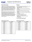 810001-21 FemtoClock™ Dual VCXO Video PLL Data Sheet General Description Features The 810001-21 is a PLL based synchronous clock generator that is optimized for digital video clock jitter attenuation and frequency translation. The device contains two internal frequency multiplication stages that are cascaded in series. The first stage is a VCXO PLL that is optimized to provide reference clock jitter attenuation, and to support the complex PLL multiplication ratios needed for video rate conversion. The second stage is a FemtoClock™ frequency multiplier that provides the low jitter, high frequency video output clock. • • Jitter attenuation and frequency translation of video clock signals • Support of High-Definition (HD) and Standard-Definition (SD) pixel rates • Dual VCXO-PLL supports both 60 and 59.94Hz base frame rates in one device • • Supports both 1000/1001 and 1001/1000 rate conversions • VCXO-PLL mode for low-frequency clock generation (27MHz and 26.973MHz) • • • • One LVCMOS/LVTTL clock output • • • 3.3V supply voltage Preset multiplication ratios are selected from internal lookup tables using device input selection pins. The multiplication ratios are optimized to support most common video rates used in professional video system applications. The VCXO requires the use of an external, inexpensive pullable crystal. Two crystal connections are provided (pin selectable) so that both 60 and 59.94 base frame rates can be supported. The VCXO requires external passive loop filter components which are used to set the PLL loop bandwidth and damping characteristics. Supported Input Frequencies Supports SMPTE 292M, ITU-R Rec. 601/656 and MPEG-transport clocks Dual PLL mode for high-frequency clock generation (36MHz to 148.5MHz) Two selectable LVCMOS/LVTTL clock inputs LVCMOS/LVTTL compatible control signals RMS phase jitter @148.3516MHz, (12kHz - 20MHz): 1.089ps (typical) 0°C to 70°C ambient operating temperature Available in lead-free (RoHS 6) packages Supported Output Frequencies fVCXO = 27MHz fVCXO = 26.973MHz fVCXO = 27MHz fVCXO = 26.973MHz 27.0000MHz 26.9730MHz 148.5000MHz 148.3515MHz 27.0270MHz 27.0000MHz 74.2500MHz 74.1758MHz 74.1758MHz 74.1016MHz 49.5000MHz 49.4505MHz 74.3243MHz 74.2499MHz 33.0000MHz 32.9670MHz 74.2500MHz 74.1758MHz 162.0000MHz 161.8380MHz 27.0270MHz 27.0000MHz 81.0000MHz 80.9190MHz 26.9730MHz 26.9461MHz 54.0000MHz 53.9460MHz 74.1758MHz 74.1016kHz 36.0000MHz 35.9640MHz 45.0000kHz 44.9550kHz 27.0000MHz 26.9730MHz 33.7500kHz 33.7163kHz 15.6250kHz 15.6094kHz 15.7343kHz 15.7185kHz 28.1250kHz 28.0969kHz ©2016 Integrated Device Technology, Inc 1 Revision B March 3, 2016 810001-21 Data Sheet 0 CLK1 Pulldown 1 VCXO Input Pre-Divider 1 Pulldown XTAL_SEL 0 CLK0 Pulldown XTAL_OUT1 XTAL_IN1 XTAL_IN0 LF1 LF0 ISET Loop Filter XTAL_OUT0 Block Diagram Phase Detector VCXO (P Value from Table) Charge Pump CLK_SEL Pulldown V3:V0 Pulldown VCXO Feedback Divider (M Value from Table) VCXO Divider Table 4 VCXO Jitter Attenuation PLL 10 11 MR Pulldown FemtoClock Frequency Multiplier 0= x22 (default) 1= x24 Master Reset 01 10 11 Output Divider 00 = 4 (default) 01 = 8 10 = 12 11 = 18 00 01 10 11 Q Pullup OE MF Pulldown N1:N0 Pulldown 2 2 nBP1:nBP0 Pullup XTAL_SEL VDD XTAL_OUT1 XTAL_IN1 GND XTAL_OUT0 VDDX XTAL_IN0 Pin Assignment 32 31 30 29 28 27 26 25 24 N0 LF0 2 23 N1 ISET 3 22 nBP1 VDD 4 21 OE nBP0 5 20 GND GND 6 19 Q CLK_SEL 7 18 VDDO CLK1 8 17 VDDA 810001-21 32 Lead VFQFN 5mm x 5mm x 0.925mm package body K Package Top View V3 V2 V1 MF MR 10 11 12 13 14 15 16 VDD 9 V0 1 CLK0 LF1 ©2016 Integrated Device Technology, Inc 2 Revision B March 3, 2016 810001-21 Data Sheet Table 1. Pin Descriptions Number Name Type 1, 2 LF1, LF0 Analog Input/Output 3 ISET Analog Input/Output 4, 11, 25 VDD Power 5, 22 nBP0, nBP1 Input 6, 20, 29 GND Power Description Loop filter connection node pins. Charge pump current setting pin. Core supply pins. Pullup PLL Bypass control pins. See block diagram. Power supply ground. 7 CLK_SEL Input Pulldown Input clock select. When HIGH selects CLK1. When LOW, selects CLK0. LVCMOS / LVTTL interface levels. 8, 9 CLK1, CLK0 Input Pulldown Single-ended clock inputs. LVCMOS/LVTTL interface levels. 10, 14, 15, 16 V0, V1, V2, V3 Input Pulldown VCXO PLL divider selection pins. LVCMOS/LVTTL interface levels. 12 MR Input Pulldown Active HIGH Master Reset. When logic HIGH, the internal dividers are reset causing the output to go low. When logic LOW, the internal dividers and the output is enabled. LVCMOS/LVTTL interface levels. Pulldown 13 MF Input 17 VDDA Power Analog supply pin. FemtoClock multiplication factor select pin. LVCMOS/LVTTL interface levels. 18 VDDO Power Output supply pin. 19 Q Output Single-ended VCXO PLL clock output. LVCMOS/LVTTL interface levels. 21 OE Input Pullup 23, 24 N1, N0 Input Pulldown FemtoClock output divide select pins. LVCMOS/LVTTL interface levels. 26 XTAL_SEL Input Pulldown Crystal select. When HIGH, selects XTAL1. When LOW, selects XTAL0. LVCMOS/LVTTL interface levels. 27, 28 XTAL_OUT1, XTAL_IN1 Input Crystal oscillator interface. XTAL_IN1 is the input. XTAL_OUT1 is the output. 30, 31 XTAL_OUT0, XTAL_IN0 Input Crystal oscillator interface. XTAL_IN0 is the input. XTAL_OUT0 is the output. 32 VDDX Power Output enable. When logic LOW, the clock output is in high-impedance. When logic HIGH, the output is enabled. LVCMOS/LVTTL interface levels. Power supply pin for VCXO charge pump. NOTE: Pullup and Pulldown refer to internal input resistors. See Table 2, Pin Characteristics, for typical values. Table 2. Pin Characteristics Symbol Parameter CIN Input Capacitance CPD Power Dissipation Capacitance (per output) RPULLUP Input Pullup Resistor Test Conditions VDD = VDDO = 3.465V RPULLDOWN Input Pulldown Resistor ROUT Output Impedance ©2016 Integrated Device Technology, Inc 3 Minimum Typical Maximum Units 4 pF 8.5 pF 51 k 51 k 22.5 Revision B March 3, 2016 810001-21 Data Sheet Function Tables Table 3A. VCXO PLL Pre- and Feedback Div
