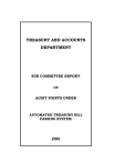 TREASURY AND ACCOUNTS DEPARTMENT SUB COMMITTEE REPORT ON AUDIT POINTS UNDER AUTOMATED TREASURY BILL PASSING SYSTEM 2006 2 INTRODUCTION In Letter No. 51282/2003/P2 dated 21.7.2006, the Special Commissioner and Commissioner of Treasuries and Accounts , has requested the Sub Committee to examine and confirm the correctness of the codal provisions of the Audit points presented by the Treasury Officers, Karur and Theni. The Sub Committee has examined the matter in detail. Besides verifying the correctness of the codal provisions, the Committee has redrafted the various points, noted the authorities wherever they were not indicated, rearranged the sequence to suit the processing of bills for payment and also included certain items of bills not in the earlier list. Few points noted by the Treasury Officers were omitted considering them as purely administrative aspects to be dealt with by the Drawing Officers. Further there were certain certificates which though relevant could not be included in view of the consolidated certificate incorporated already in the existing bills to the effect that “CERTIFIED THAT THE CLAIM HAS BEEN MADE AS PER RELEVANT CODAL PROVISIONS” and this is adopted as adequate placing the responsibility on the drawing officer. The Sub Committee expresses its thanks to the Special Commissioner for entrusting this verification and to the Joint Director, Personal Assistant (TC) and other members of staff of the Commissionerate for extending their courtesy and co-operation in completing the work. C.M. Pasupathy N. Govindan M.D. Gopal J. Shanmugavelu M. Subramanian R Balasubramanian. 3 I. II. III. COUNTER VERIFICATION OF BILLS. AUDIT POINTS – COMMON TO ALL CATEGORIES OF BILLS AUDIT POINTS – SPECIFIC TO INDIVIDUAL CATEGORY OF BILLS: 1 Salary 2 Salary Arrears 3 Surrender Leave Salary 4 Medical Reimbursement Claim 5 Advance of Pay 6 Festival Advance 7 Encashment of Earned Leave (TLS) 8 Additional Charge Allowance 9 Subsistence Allowance 10 LTC Advance 11 LTC 12 Tour Advance 13 Tour TA 14 Transfer TA 15 T.A. to Home town on Retirement 16 Contingent Bills 17 Telephone Bills 18 Electricity Bills 19 Fuel Advance 20 Fuel Bills 21 Motor Vehicle Maintenance 22 Rent 23 Feeding Charges 24 Payment of Professional Services 25 Clothing, Tentage and Stores 26 Training 27 Prices and Awards 28 Water Charges 29 Property Tax 30 Purchase of Machinery and Equipments 31 Purchase of Materials and Supplies 32 Stores and Equipments 33 Cost of Books / Note Books / Slates / etc. 34 Stipend / Scholarship 35 Postage Stamp 36 Printing Charges 37 Rewards 38 Arms and Ammunition 39 Compensation for Land Acquisition 40 Medicine 41 Wages 42 Electricity Charges (Adjustment) Bill 43 Works Major / Minor 44 Transport Charges 45 Subsidy 46 Service and Commitment Charges 4 47 48 49 50 51 52 53 54 55 56 57 58 59 60 61 62 63 64 65 66 67 68 69 70 71 72 73 74 75 Advertisement Charges Publications Secret Services Loans and Advances (MCA – Two Wheeler / Car Advance) Loans and Advances (HBA) Loans and Advances (MA) Cycle Advance Loans and Advances Khadi / Handloom Tansi Advance Computer Advance Education Advance Warm Cloth Advance GPF (Temporary) GPF (Part Final) GPF (90% PFW) GPF (Final) TPF Pension ( First Pension) Gratuity Provisional Pension / Gratuity Commutation of Pension SPF Govt. Contribution / Subscription / Interest Salary Grants Grants-in-aid Family Security Fund Advance for meeting Funeral Expense T.A. to family of deceased Govt. Employee to native place Transport of dead body of official to native place Repayment of Deposits 5 I. COUNTER VERIFICATION OF BILLS 1. Verification of pre-assigned serial number of Token-CumAcknowledgement Form (TNTC 104 F) 2. Verification of permissible DP code in respect of the DDO. 3. Budget allotment verification. 6 II. AUDIT POINTS COMMON TO ALL CATEGORIES OF BILLS. 1. Place of payment is not noted on the bill . T.R. 19. 2. Want of orders on delegation of powers authorizing the DDO to draw bills at the Treasury. S.R. 2 (h) – T.R. 16. 3. Bill is not in the prescribed form. SR. 2(b) TR.16. 4. Want of correct Head of Account up to sub-detailed head. SR2(a) (6) TR 16. 5. The signature of the D.D.O. is not dated. SR 2(b) TR16 and Govt. Memo 2770-1/EXPA/65-3 Finance dt. 19.4.65. 6. Want of attestation of the DDO for the correction and alteration with dated full signature. SR. 2(d) TR.16 and G.M. 27701/ EXP A / 65-3, Finance, dt.19.04.1965. 7. Correct Protective endorsement should be made in red ink. SR 2(c) TR16. 8. The net amount of the bill differs in words and figures. SR 2(c) TR 16 9. The Signature of the DDO does not tally with specimen signature. SR 2 (t) TR 16. 10. Financial sanction communicated is not signed in ink by the authorized authority Note –I Art.45 of TNFC Vol-I. 11. Amount of the bill is not arithmetically accurate. Note (5) Art. 56 TNFC Vol.I. 12. Want of Non-drawal certificate SR. 14 TR.16. 13. Want of Enfacement slip duly filled in and signed. G.M. 4362/DP/72-1 Fin. Dept. dt. 7.11.72 and G.O. Ms. No. 27 Fin. 29.1.76. 14. Want of endorsement in the bill for issue of an account payee cheque / DD in favour of the claimant / Supplier. (For all non salary item and G.O.Ms.No. 901 Fin. (Sal.) Dept. dt. 20.9.77) G.O.Ms. No. 1116 Finance (T&A) Dept. dt. 6.8.79. 7 1. SALARY 1. Want of separate bills for permanent / Temporary establishment noting the authority. SR 7 TR 16. 2. Want of particulars of G.O. No. and date in the bill in which the Temporary Establishment was sanctioned, the period upto which sanctioned and last continued SR 7 TR 16. 3. Want of certificate for the claim of Temporary establishment beyond the expiry period of sanction. Note SR 7 TR 16. 4. Want of Express Pay orders from Government for the claims of the newly formed office. Note to instruction 1 – TR 17. 5. I.T., was not deducted SR 2 (l ) TR16. 6. Want of IT statement (in respect of Self Drawing Officers) for February salary claim / arrears claim upto 31st March. SR 2 (l) TR 16. 7. Professi