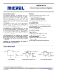 MIC39100/1/2 1A, Low-Voltage, Low-Dropout Regulator General Description Features The MIC39100, MIC39101, and MIC39102 are 1A lowdropout linear voltage regulators that provide low-voltage, high-current output from an extremely small package. Utilizing Micrel’s proprietary Super βeta PNP® pass element, the MIC39100/1/2 offers extremely low dropout (typically 410mV at 1A) and low ground current (typically 11mA at 1A). • Fixed and adjustable output voltages to 1.24V • 410mV typical dropout at 1A − Ideal for 3.0V to 2.5V conversion − Ideal for 2.5V to 1.8V conversion • 1A minimum guaranteed output current • 1% initial accuracy • Low ground current • Current-limiting and thermal-shutdown protection • Reversed-battery and reversed-leakage protection • Fast transient response • Low-profile SOT-223 package • Power SO-8 package The MIC39100 is a fixed output regulator offered in the SOT-223 package. The MIC39101 and MIC39102 are fixed and adjustable regulators, respectively, in a thermally enhanced power 8-lead SOIC package. The MIC39100/1/2 is ideal for PC add-in cards that need to convert from standard 5V to 3.3V, 3.3V to 2.5V or 2.5V to 1.8V. A guaranteed maximum dropout voltage of 630mV over all operating conditions allows the MIC39100/1/2 to provide 2.5V from a supply as low as 3.13V and 1.8V from a supply as low as 2.43V. The MIC39100/1/2 is fully protected with overcurrent limiting, thermal-shutdown, and reverse-battery protection. Fixed voltages of 5.0V, 3.3V, 2.5V, and 1.8V are available on MIC39100/1 with adjustable output voltages to 1.24V on MIC39102. Applications • • • • • • LDO linear regulator for PC add-in cards High-efficiency linear power supplies SMPS post regulator Multimedia and PC processor supplies Battery chargers Low-voltage microcontrollers and digital logic Datasheets and support documentation are available on Micrel’s web site at: www.micrel.com. Typical Applications 2.5V/1A Regulator 2.5V/1A Regulator with Error Flag 1.5V/1A Adjustable Regulator Super βeta PNP is a registered trademark of Micrel, Inc. Micrel Inc. • 2180 Fortune Drive • San Jose, CA 95131 • USA • tel +1 (408) 944-0800 • fax + 1 (408) 474-1000 • http://www.micrel.com June 3, 2015 Revision 3.0 Micrel, Inc. MIC39100/1/2 Ordering Information Part Number Voltage MIC39100-1.8WS (1) MIC39100-2.5WS (1) MIC39100-3.3WS (1) MIC39100-5.0WS (1) EN Flag Adjustable Junction Temperature Range Package 1.8V –40°C to +125°C SOT-223 2.5V –40°C to +125°C SOT-223 3.3V –40°C to +125°C SOT-223 5.0V –40°C to +125°C SOT-223 MIC39101-1.8YM 1.8V √ √ –40°C to +125°C SOIC-8 MIC39101-2.5YM 2.5V √ √ –40°C to +125°C SOIC-8 MIC39101-3.3YM 3.3V √ √ –40°C to +125°C SOIC-8 MIC39101-5.0YM 5.0V √ √ –40°C to +125°C SOIC-8 Adjustable √ –40°C to +125°C SOIC-8 MIC39102YM √ Note: 1. RoHS-compliant with “high-melting solder” exemption. Pin Configuration MIC39100-xx Fixed SOT-223 (S) (Top View) MIC39101-xx Fixed SOIC-8 (M) (Top View) June 3, 2015 MIC39102 Adjustable SOIC-8 (M) (Top View) 2 Revision 3.0 Micrel, Inc. MIC39100/1/2 Pin Description Part Number MIC39100 Part Number MIC39101 Part Number MIC39102 Pin Name 1 1 EN Enable (Input): CMOS-compatible control input. Logic HIGH = enable; logic LOW or OPEN = shutdown. 1 2 2 IN Supply (Input) 3 3 3 OUT Regulator Output. FLG Flag (Output): Open-collector error flag output. Active LOW = output undervoltage. 4 ADJ Adjustable Input: Feedback input. Connect to resistive voltagedivider network. 5−8 GND Ground. 4 2, TAB June 3, 2015 5−8 3 Pin Function Revision 3.0 Micrel, Inc. MIC39100/1/2 Absolute Maximum Ratings(2) Operating Ratings(3) Supply Voltage (VIN) ....................................... −20V to +20V Enable Voltage (VEN) .................................................... +20V Lead Temperature (soldering, 5s) .............................. 260°C Storage Temperature (TS) ......................... −65°C to +150°C ESD Rating.................................................................Note 5 Supply Voltage (VIN) .................................... +2.25V to +16V Enable Voltage (VEN) .................................................... +16V Maximum Power Dissipation (PD(MAX)) ....................... Note 4 Junction Temperature (TJ) ........................ −40°C to +125°C Package Thermal Resistance SOT-223 (θJC) .................................................. +15°C/W SOIC-8 (θJC)..................................................... +20°C/W Electrical Characteristics(6) VIN = VOUT + 1V; VEN = 2.25V; TJ = 25°C, bold values indicate –40°C ≤ TJ ≤ +125°C, unless noted. Symbol Parameter VOUT Output Voltage ∆VOUT/∆T VDO IGND IOUT(LIM) Condition Min. Typ. Max. 10mA −1 +1 10mA ≤ IOUT ≤ 1A, VOUT +1V ≤ VIN ≤ 8V −2 +2 Units % Line Regulation IOUT = 10mA, VOUT + 1V ≤ VIN ≤ 16V 0.06 0.5 % Load Regulation VIN = VOUT + 1V, 10mA ≤ IOUT ≤ 1A 0.2 1 % 40 100 ppm/°C Output Voltage Temperature Coefficient(7) Dropout Voltage(8) Ground Current(9) Current Limit 200 IOUT = 100mA, ∆VOUT = −1% 140 IOUT = 500mA, ∆VOUT = −1% 275 IOUT = 750mA, ∆VOUT = −1% 300 IOUT = 1A, ∆VOUT = −1% 410 IOUT = 100mA, VIN = VOUT + 1V 400 IOUT = 500mA, VIN = VOUT + 1V 4 IOUT = 750mA, VIN = VOUT + 1V 6.5 IOUT = 1A, VIN = VOUT + 1V 11 20 VOUT = 0V, VIN = VOUT + 1V 1.8 2.5 250 500 mV 550 630 µA mA A Notes: 2. Exceeding the absolute maximum ratings may damage the device. 3. The device is not guaranteed to function outside its operating ratings. 4. PD(MAX) = (TJ(MAX) − TA) ÷ θJA, where θJA depends upon the printed circuit layout (see Applications Information). 5. Devices are ESD sensitive. Handling precautions are recommended. Human body model, 1.5kΩ in series with 100pF. 6. Specification for packaged product only. 7. Output voltage temperature coefficient is ∆VOUT(WORST CASE) ÷ (TJ(MAX) − TJ(MIN)), where TJ(MAX) = +125°C and TJ(MIN) = −40°C. 8. VDO = 