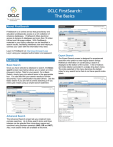 OCLC FirstSearch: The Basics About FirstSearch FirstSearch is an online service that gives library and education professionals access to a rich collection of reference databases. FirstSearch offers electronic access to dozens of databases and more than 10 million full­text and full­image articles. With FirstSearch, materials in your library collection can be identified in search results, facilitating interlibrary loan and helping to connect your users with the information they need. Log in to FirstSearch at: http://www.firstsearch.org/ Log in using your assigned authorization and password. Expert Search Searching Basic Search Once you have selected a database to search, the Basic search screen (see below) allows you to select an index (Keyword, Author, Title) for your search. For a Basic Search, simply type your search terms in the appropriate box. You can also limit your search results to full­text documents, if your authorization includes full­text. Use the Basic Search if you are new to online searching or if you need quick results using a simple search statement. Advanced Search The Advanced Search screen lets you construct more complex searches. Up to three search terms and three indexes can be selected from drop­down menus and combined using Boolean operators (AND, OR and NOT). Also, more search limits are available at this level. The Expert Search screen is designed for experienced searchers who prefer to enter logical search strings. Reference information on constructing a search is displayed at the bottom of the screen. A list of indexes and index labels is provided in a single drop­down menu. The index selected in this menu becomes the default index for any search terms that do not have specific index labels. FirstSearch: The Basics Other search features · Using index labels with the Expert Search Browse the indexes to verify the correct spelling or format for search terms. Click the Index to access the Browse Index feature. · button Browse subject headings to find additional terms that Use an index label and: When your search includes Examples colon ( : ) individual words or fragments of phrases kw:airline security search operators (w or n) kw:alcohol w2 fetal other special search characters such as the plus sign (+) or asterisk (*) ti:(ocean+ or sea+) and pollut* exact phrases as in names and titles ti=alice in wonderland may apply to your search. Click the Subjects button to access the Subject Headings list. Note: This feature is available only in certain databases. · Use ranking (before you search) to organize the results of your search. Available ranking options vary by database and may include ranking by relevance or date. Ranking by number of libraries holding the item is also available in WorldCat. Search Statements Search statements are made up of search terms combined with the index(es) being searched. Search statements can also contain special characters, labels, or Boolean operators. In the Basic or Advanced search, the indexes are either pre­selected for you, or can be selected from drop­down menus. Building search statements To search for Use Sample search term(s) Results subject information any word or words and the Keyword or Subject index frost many results (common word) sangfroid few results (rare word) categories of information index labels su:sleep ti:moon subject “sleep” “moon” in titles defined phrase quotes “ “ “tunnel vision” tunnel vision singular or plural forms plus sign + plant+ plant, plants, plants’, plant’s, plantes, plantes’ variants or part of a word wildcard *, # or ? zebu* zebu, Zebulon, zebutte all words AND cold AND zinc cold and zinc one or all words OR cold OR zinc cold, zinc, and cold and zinc one word but not another NOT cold NOT weather “cold” but not “cold weather” words near each other, in given order w common w2 cold common followed within 2 words by cold words near each other, in any order n cold n3 common cold and common within 3 words of each other equal sign ( = ) Selecting a database You can select a database to search on the Basic, Advanced or Expert Search screens by using the Search in database: drop­down list on the Search screen. FirstSearch also provides three options for selecting a database via the Databases tab. Click the Databases tab and then click a link for one of the following options. The List All Databases option displays a merged list of all databases, while the List Databases by Topic option groups databases by topic area. If you need help selecting a database, use the Suggest Best Databases option to scan databases for your key search term(s). You can then select the databases that contain the highest estimated results for your key terms. 2 FirstSearch: The Basics Library ownership information—The My Library Owns icon and the My Library Group Owns icon are displayed with any resource that your library or library group owns. Click the icon to view a list of libraries that hold a particular resource. The Home screen The Home screen may be the first screen you see in FirstSearch, if your administrator has configured your FirstSearch account that way. You may also reach the Home screen by clicking the Home tab on any FirstSearch screen. The FirstSearch Home screen provides a simplified, Google­like Search box that enables you to enter search terms and also select a database in which to search. Searches entered from the Home screen use the Keyword search. WorldCat Services Administrative Module The purpose of the WorldCat Servics Administrative Module is to help you: · · · Customize FirstSearch to meet the needs of your users and staff Integrate FirstSearch with your library services (such as interlibrary loan) Control database searching costs for your library Basic settings you should be aware of: Logging on to the administrative module Access the WorldCat Services Administrative Module at: http://www.firstsearch.org/admin/ Log in using your assigned authorization an
