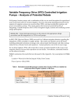 Variable Frequency Drive (VFD) Controlled Irrigation Pumps http://www.itrc.org/reports/vfdanalysis.htm ITRC Report No. R 11-005 Variable Frequency Drive (VFD) Controlled Irrigation Pumps – Analysis of Potential Rebate Well pumps, booster pumps, and a combination of the two are used throughout the agricultural sector to provide water for on-farm irrigation. However, the pump discharge pressures for the majority of irrigation systems are excessive (Burt, 2009), waiving considerable monetary and power consumption savings. This report analyzes the numerous potential benefits of integrating a variable frequency drive (VFD) to irrigation supply systems and modifying system design philosophies. Bottom line – Pump discharge pressures can be reduced with appropriate design procedures and the integration of a VFD on well pumps. In 2002, ITRC (Burt and Howes, 2002) surveyed five California irrigation districts regarding the integration of VFD controllers to supply pumps. The results were positive across the board including substantial reductions in energy costs, reduced peak load demand, and other savings related to less vehicular travel and manpower. Annual paybacks were in the 2-4 year range. For on-farm irrigation, VFDs will not provide as many secondary benefits to the owner as for irrigation districts, because their operations are not similar. Nevertheless, substantial benefits can be achieved on-farm. Table 1 summarizes the results that are discussed in this Appendix. Key assumptions for Table 1 are: Location = West side of the San Joaquin Valley, Kern County Price of power = $0.16/kWh Table 1: Estimated annual kWh savings in western Kern County if VFDs are installed on pressurized field irrigation systems of 160 acres. Annual kWh savings with VFD Category 1 – Booster pump only. Category 2 – Well pump plus booster or well pump only supplies pressure to drip/sprinkler irrigation system. Deciduous Trees 21,078 64,176 Grape Vines 13,672 41,667 Tape on Produce Crops 13,672 41,667 Crop Type Irrigation Training and Research Center 1 Variable Frequency Drive (VFD) Controlled Irrigation Pumps http://www.itrc.org/reports/vfdanalysis.htm ITRC Report No. R 11-005 Variable Frequency Drive (VFD) Controlled Pumps Pressure Reduction with VFDs VFD controllers for irrigation pump motors may have the greatest potential for immediate power savings. There are numerous reasons to promote VFDs on both well pumps and booster pumps. The two most significant reasons are: 1. Designers must always over-design pumps. Farmers do not complain if they have too much pressure; but they definitely complain if they do not have enough. The uncertainties with pump design are: a. Designers always include a “safety factor” of at least 5 psi in a design – whether needed or not. b. Published pump curves often do not exactly match what goes into a field. c. The pressures from irrigation district pipeline turnouts vary over time, and may not even be known by the designer. d. Well water levels vary from year-to-year, and from Spring to Fall. These variations can easily be 50 feet. 2. Irrigation systems do not require a constant pressure. In general, irrigation systems incorporate sequences of multiple blocks. These blocks have varying elevations and sizes, each with unique pressure requirements. Given the two items above, VFDs allow designers to over-design the pump to meet uncertainties and occasional extreme conditions, without having continuous power wastage due to an over-designed pump. The power savings that are obtained from a VFD will depend upon the specific installation. In the case of well pumps for which the lift from the pumping water level to the ground surface is substantial, the power savings are not properly predicted using the affinity law equation: (New kW/Old kW) = (New RPM/Old RPM)3 The equation above assumes that the flow rate varies proportionally as the RPM changes. In irrigation, the RPM of the pump is changed in the case of fluctuating water levels, to maintain a constant GPM. In the case of irrigation block sizes that have variable elevations and GPM requirements, the relationship is more complex. Readily attainable pressure savings estimates for a well pump are shown in the following table. These values are based on design experience of ITRC staff, and are therefore somewhat subjective. Irrigation Training and Research Center 2 Variable Frequency Drive (VFD) Controlled Irrigation Pumps http://www.itrc.org/reports/vfdanalysis.htm ITRC Report No. R 11-005 Table 2: Readily attainable pressure savings. Pressure savings category Estimate of pressure savings (ft) Over-design for fluctuating water table Over-design for unknown factors in system design Variations in block sizes and locations 10% of the average pumping water level in the area Total pressure savings, unadjusted Depends on the average pumping water level in the area 10 6 As described in Table 2, the magnitude of pressure savings will be proportional to the average pumping water level in the area. Figure 1 displays average pumping water levels of the pumps sampled, weighted by kW, for California’s various groundwater basins. This white paper utilizes data from a reference region in western Kern County. Figure 1: Weighted pumping water depths from surveyed pumps (ft) Irrigation Training and Research Center 3 Variable Frequency Drive (VFD) Controlled Irrigation Pumps http://www.itrc.org/reports/vfdanalysis.htm ITRC Report No. R 11-005 Three additional benefits derived from the use of VFDs are also substantial, although they do not in themselves reduce electricity consumption (kWh). These benefits are: 1. Water hammer and subsequent damage to the pump and irrigation system are reduced because of the slow start and slow stop capabilities of VFD-equipped pumps. 2. Farmers are much more likely to adopt time-of-use pumping practices with well pumps. This is because the slow starting of well pumps, as opposed to 100% speed starting (with subseque