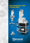 Size Reduction with Cutting Mills CUTTING MILLS Cutting Mills RETSCH cutting mills are used successfully for the efficient preliminary size reduction of a huge variety of materials. The mills offer a high level of operational safety and convenience. The wide selection of accessories allows for easy adaptation to different application requirements. 2 CONTENTS Milling – Jaw Crushers – Rotor Mills – Cutting Mills – Knife Mills and Blenders – Mortar Grinders – Disc Mills – Mixer Mills – Planetary Ball Mills Sieving Assisting os at Product vide/videos com w w w.retsch. Cutting Mills –Applications 4 –Cutting Mill SM 300 –Cutting Mill SM 200 –Cutting Mill SM 100 7 8 9 –Selection guide / Technical data 9 –Accessories –Rotors –Hoppers –Bottom sieves –Cyclone-suction-combination –Sample collecting systems – Order data 10 10 10 11 11 11-12 RETSCH cutting mills are used for the preliminary size reduction of soft, medium-hard, fibrous, elastic and tough materials. A representative sub-sample should then be taken for the subsequent reduction down to analytical fineness. Pulverization with Mixer Mills Fine grinding with Ultra Centrifugal Mills Sample Divider For the pulverization of hard, medium-hard and brittle as well as soft, elastic or fibrous products RETSCH mixer mills are highly suitable. They are used for small sample volumes and cryogenic grinding. RETSCH‘s Ultra Centrifugal Mill is suitable for grinding soft, medium-hard and brittle materials with a feed size up to 10 mm. It achieves grind sizes down to 40 microns. No matter whether rotary sample dividers, rotary tube sample dividers or sample splitters – RETSCH sample dividers will provide you with representative sub-samples from pourable powders and bulk materials. 3 CUTTING MILLS The main areas of application for cutting mills are: Agriculture Plant materials, straw Chemicals and plastics PET preforms, plastic toys, polymers, resins, rubber Environmental research Cables, cardboard, electronic components, foil, leather, paper, refuse derived fuels, textiles, waste, wood Applications Cutting mills are used for the preliminary grinding of soft, medium-hard, elastic and fibrous materials as well as heterogeneous mixes of products. Size reduction by cutting and shearing is carried out gently and quickly which makes the mills suitable for temperature-sensitive samples. Typical applications of the cutting mills include sample preparation for heavy metal analysis within the context of RoHS and WEEE, size reduction of refuse derived fuels as well as processing of biomass for renewable energy research. Foods and feeds Animal feed, feed pellets, spices Free test grinding Geology and metallurgy Aluminum slag, lignite, nonferrous metals Medicine and pharmaceuticals Bones, drugs, pharmaceutical products and many more... For RETSCH, professional customer service includes offering our customers the individual advice they need to find the best possible solution for their sample preparation task. To achieve this our application laboratories process and measure samples free-of-charge and provide a recommendation for the most suitable method and instrument. For more information please visit our website www.retsch.com/testgrinding. Application examples Rotor Sieve Feed size Sample amount Grinding time Speed Final fineness SM 200 6-disc 8 mm Ø 30 x 100 mm 100 g 1 min 1,500 min-1 6 mm Electr. scrap/ circuit boards SM 300 6-disc 4 mm 60 x 100 mm 4 pcs. 1 min 1,500 min-1 3 mm Feed pellets SM 100 Parallel 4 mm 15 mm 500 g 3 min 1,500 min-1 1.5 mm Paper SM 100 Parallel 4 mm DIN A4 100 g 2 min 1,500 min-1 2 mm PET preforms SM 300 6-disc 6 mm Ø 30 x 100 mm 6 pcs. 1 min 700 min-1 5 mm Refuse derived fuels (RDF) SM 300 light fraction Parallel 4 mm 60 mm 2l 2 min 3,000 min-1 4 mm Rubber soles SM 300 in quarters Parallel 6 mm 100 x 150 mm 200 g 1 min 3,000 min-1 5 mm Straw SM 300 Parallel 1.5 mm 200 mm 100 g 30 sec 1,500 min-1 95% <0.5 mm Thermoplastic SM 300 pre-cooling with LN2 6-disc 8 mm 130 x 60 x 30 mm 350 g 30 sec 2,000 min-1 6 mm Wood SM 300 cyclone-suctioncombination Parallel 1 mm 20 x 50 x 200 mm 500 g 3 min 2,500 min-1 95% <0.5 mm Cutting mills Model* Bones General remarks scrunched up This chart serves only for orientation purposes. *Some of the sample materials could also be successfully processed in another model of the cutting mill family. The RETSCH application database contains more than 1,000 application reports. Please visit www.retsch.com/applicationdatabase. 4 CUTTING MILLS Cutting Mills SM 100, SM 200 and SM 300 ct The perfe ill for cutting m ment uire every req SM 100 Benefits at a glance ■ Powerful primary and fine size reduction ■ Selection of models to suit different requirements ■ Quick cleaning, easy handling ■ Defined final fineness due to bottom sieves with aperture sizes from 0.25 - 20 mm ■ Wide range of accessories including various hoppers, collecting systems, rotors and sieves ■ Highest safety standard SM 200 The RETSCH cutting mills provide highly efficient primary size reduction of such heterogeneous material mixes as waste or electronic components but are also suitable for many other types of samples. With the SM 100, SM 200 and SM 300 RETSCH offers three models for different requirements. No matter, whether it is a standard mill for routine applications or a powerful and flexible model to handle a vast range of sample materials, RETSCH provides the suitable instrument. A wide selection of sieves, hoppers and collecting systems allows for easy adaptation to individual SM 300 application tasks. All three models are available in a special version for heavy-metal-free size reduction which makes them ideal for preparing samples for heavy metal analysis within the context of RoHS and WEEE regulations. Cutting mill technology Size reduction in the cutting mills takes place by cutting and shearing forces. The sample passes through the hopper and into the grinding chamber. There it come