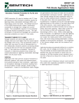 AN97-10 Surging Ideas TVS Diode Application Note PROTECTION PRODUCTS are generated by the impact of water and ice particles and separated in strong air currents. Lightning occurs when enough charge has been separated inside the cloud to cause localized electric breakdown of the air. At any given time, there are approximately 1800 thunderstorms in progress around the world generating lightning strikes on the surface of the earth about 100 times every second. Each cloud-to-ground event generally contains 3-5 distinct strokes, but as many as twelve have been observed. Mean peak current for the first stroke is 20kA with subsequent strokes decreasing by 50% or more. While a direct lightning strike is dramatic, it is significant to note that lightning produces intense electric and magnetic fields which can couple into nearby power lines, communication lines, and circuit wiring causing catastrophic or latent damage to semiconductor equipment. The magnitude of the induced voltage varies with the distance from the strike. Secondary Transient Protection for T1/E1 Line Cards CMOS transceiver ICs used to interface with T1 lines are exposed to harsh transient conditions caused by lightning strikes, electrostatic discharge (ESD), and transmission power line faults. The delicate structure of the CMOS semiconductor makes it particularly susceptible to damage from voltage and current surges. This susceptibility requires it to be protected by external transient suppression circuitry. The right combination of devices and topologies can provide the secondary protection you need in T1 line cards. TRANSIENT THREATS TO T1 LINES Voltage transients are abnormally high pulses of voltage which are much higher than the normal operating voltage of the circuit. They are generally random in nature and may occur for tens of nanoseconds to a few milliseconds. Electronic systems connecting directly to external data and I/O lines are especially susceptible. T1 line cards are no exception. Sources of transients in telecommunications lines include the natural phenomena of lightning, electrostatic discharge (ESD), and AC power faults. Lightning impulses are generally defined by a combination wave, one for voltage and another for current. They are defined as double exponential pulses with a specified rise time and duration or decay time. For example, an 8/20µs impulse current waveform has a rise time of 8µs and a decay time of 20µs to 50% of the peak. Lightning Lightning is the most common causes of transients in electronic systems, with power and telecommunications systems being the most vulnerable. Lightning is an atmospheric discharge of electricity resulting from the accumulation of static charges, usually during a thunderstorm. Inside of a thundercloud, static charges The complex web of telephone network communication links make them especially susceptible to damage due to lightning-induced transients. Figure 2 - ESD Waveform per IEC 61000-4-2 Figure 1 - Double Exponential Impulse Waveform Revision 11/01/2001 1 www.semtech.com AN97-10 Surging Ideas TVS Diode Application Note PROTECTION PRODUCTS PROTECTION PRODUCTS Electrostatic Discharge Another cause of failure in T1 lines is electrostatic discharge (ESD). ESD is the result of a sudden and violent redistribution of electrons between two objects. The excess charge on an object usually results from the contact and separation of two non-conductive materials, causing the transfer of electrons from one material to the other, thereby building up a turboelectric charge on the surface. If the discharge path includes semiconductor based equipment, catastrophic or latent damage may occur. The amplitude of the static discharge can exceed 30kV, with currents reaching 30A or more. The rate of the discharge is extremely fast, lasting less than 1ns. The human body is one of the most common generators of ESD. It stores charge capacitively with respect to ground The voltage potential with respect to earth ground can exceed several thousand volts. It is very common in fact for a person to develop voltages as high as 15kV. Higher voltages such as 35kV are possible, but rarer. Surge1 R ise/Decay Time µs Min Current [A] R epetitions Each Polarity 1. L,M 600 10/1000 100 25 2. L,M 1000 10/360 100 25 3. L,M 1000 10/1000 100 25 4. L 2500 2/10 500 10 5. L 1000 10/360 25 5 Table 1 - GR-1089 First Level Lightning Surges Surge4 1. L Min Voltage2 [ Vp k ] Rise/Decay Time µs Min Current [A] Repetitions Each Polarity 5000 2/10 500 1 Table 2 - GR-1089 Second Level Lightning Surges It is apparent that the ESD pulse contains little energy, but the extremely fast rise time and high power can be devastating to sensitive semiconductors. Failure may occur as a result of junction shorting, oxide puncture, or melting of the device metallization. Min Voltage2 [ Vp k ] R ise/Decay Time µs Min Current [A] R epetitions Each Polarity 1. M 800 2/10 100 1 2. L 1500 2/10 100 1 Surge AC Power Faults Power cross faults result from contact between the T1 line and an AC power line. This generally occurs because of the close proximity of telephone lines to power distribution lines. The magnitude of AC voltage resulting from power cross faults can exceed 600VAC. While T1 lines are more susceptible to power cross faults, electromagnetic coupling from nearby AC power lines can induce potentially harmful voltages on telecommunication lines. Table 3 - GR-1089 Intrabuilding Lightning Surges Surge TRANSIENT IMMUNITY STANDARDS Min Voltage2 [ Vp k ] R ise/Decay Time µs Min Current [A] R epetitions Each Polarity 1. M 800 10/560 100 2 2. L 1500 10/160 200 2 Table 4 - FCC Part 68 Lightning Surges Telephone companies require network equipment to undergo transient and power fault immunity testing which simulates worst case field conditions. Transient events have been studied and characterized leading to industry-wide standards which define transient immunity requirements for electronic equipment. Transient voltage waveforms repre