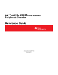 AM17x/AM18x ARM Microprocessor Peripherals Overview Reference Guide Literature Number: SPRUFU0D September 2011 2 Copyright © 2011, Texas Instruments Incorporated SPRUFU0D – September 2011 Submit Documentation Feedback Contents Preface ....................................................................................................................................... 5 1 Overview ............................................................................................................................ 7 2 ARM Interrupt Controller (AINTC) .......................................................................................... 9 3 DDR2/mDDR Memory Controller ........................................................................................... 9 4 Enhanced Direct Memory Access (EDMA3) Controller ........................................................... 10 5 Enhanced Capture Module (eCAP) ....................................................................................... 10 6 Enhanced High-Resolution Pulse-Width Modulator (eHRPWM) ............................................... 11 7 Enhanced Quadrature Encoder Pulse Module (eQEP) ............................................................ 11 8 Ethernet Media Access Controller (EMAC)/Management Data Input/Output (MDIO) Module ........................................................................................................................................ 12 9 External Memory Interface A (EMIFA) ................................................................................... 12 10 External Memory Interface B (EMIFB) ................................................................................... 12 11 General-Purpose Input/Output (GPIO) .................................................................................. 13 12 Host Port Interface (HPI) ..................................................................................................... 13 13 Inter-Integrated Circuit (I2C) Peripheral ................................................................................ 13 14 Liquid Crystal Display Controller (LCDC) ............................................................................. 14 15 Multichannel Audio Serial Port (McASP) ............................................................................... 14 16 Multichannel Buffered Serial Port (McBSP) ........................................................................... 15 17 Multimedia Card/Secure Digital (MMC/SD) Card Controller ..................................................... 16 18 Phase-Locked Loop Controller (PLLC) ................................................................................. 16 19 Power and Sleep Controller (PSC) ....................................................................................... 16 20 Programmable Real-Time Unit Subsystem (PRUSS) .............................................................. 17 21 Real-Time Clock (RTC) ....................................................................................................... 17 22 Serial ATA (SATA) Controller .............................................................................................. 18 23 Serial Peripheral Interface (SPI) ........................................................................................... 18 24 System Configuration Module (SCM) ................................................................................... 19 25 64-Bit Timer Plus ............................................................................................................... 19 26 Universal Asynchronous Receiver/Transmitter (UART) .......................................................... 20 27 Universal Parallel Port (uPP) ............................................................................................... 20 28 Universal Serial Bus 1.1 (USB1.1) Controller ......................................................................... 20 29 Universal Serial Bus 2.0 (USB2.0) Controller ......................................................................... 21 30 Video Port Interface (VPIF) .................................................................................................. 21 SPRUFU0D – September 2011 Submit Documentation Feedback Table of Contents Copyright © 2011, Texas Instruments Incorporated 3 4 Contents Copyright © 2011, Texas Instruments Incorporated SPRUFU0D – September 2011 Submit Documentation Feedback Preface SPRUFU0D – September 2011 Read This First About This Manual This document provides an overview and briefly describes the peripherals available on the AM17x/AM18x ARM Microprocessors. For details on a specific device or peripheral, see the device-specific technical reference manual. Related Documentation From Texas Instruments Copies of these documents are available on the Internet at www.ti.com. Tip: Enter the literature number in the search box provided at www.ti.com. The current documentation that describes the AM17x/AM18x ARM Microprocessor, related peripherals, and other technical collateral, is available at: Embedded Processors. SPRUH82 — AM1808/AM1810 ARM Microprocessor Technical Reference Manual. Describes the System-on-Chip (SoC) and each peripheral in the device. The SoC includes the ARM subsystem and associated memories, and a set of I/O peripherals. SPRUH83 — AM1806 ARM Microprocessor Technical Reference Manual. Describes the System-on-Chip (SoC) and each peripheral in the device. The SoC includes the ARM subsystem and associated memories, and a set of I/O peripherals. SPRUH84 — AM1802 ARM Microprocessor Technical Reference Manual. Describes the System-on-Chip (SoC) and each peripheral in the device. The SoC includes the ARM subsystem and associated memories, and a set of I/O peripherals. SPRUH93 — AM1705 ARM Microprocessor Technical Reference Manual. Describes the System-on-Chip (SoC) and each peripheral in the device. The SoC includes the ARM subsystem and associate